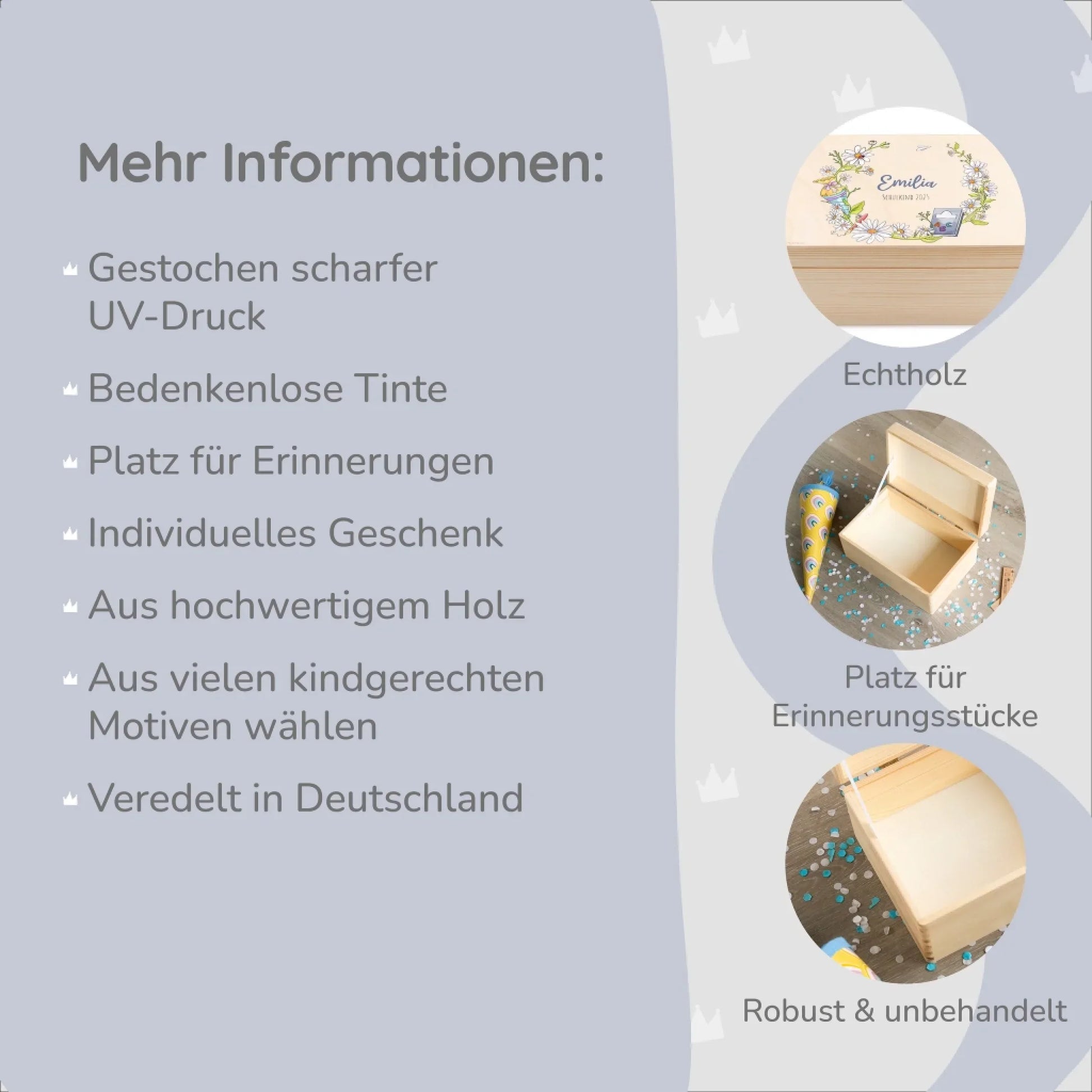 Unsere Holzbox kannst Du mit Namen und Wunschdaten gestalten. So entsteht ein ganz eigenes Zuhause für kleine Schätze, die später einmal ganz groß werden. Dank der hochwertigen Verarbeitung und dem farbenfrohen Druck bleibt alles genau so schön, wie es einmal war – selbst viele Jahre später.