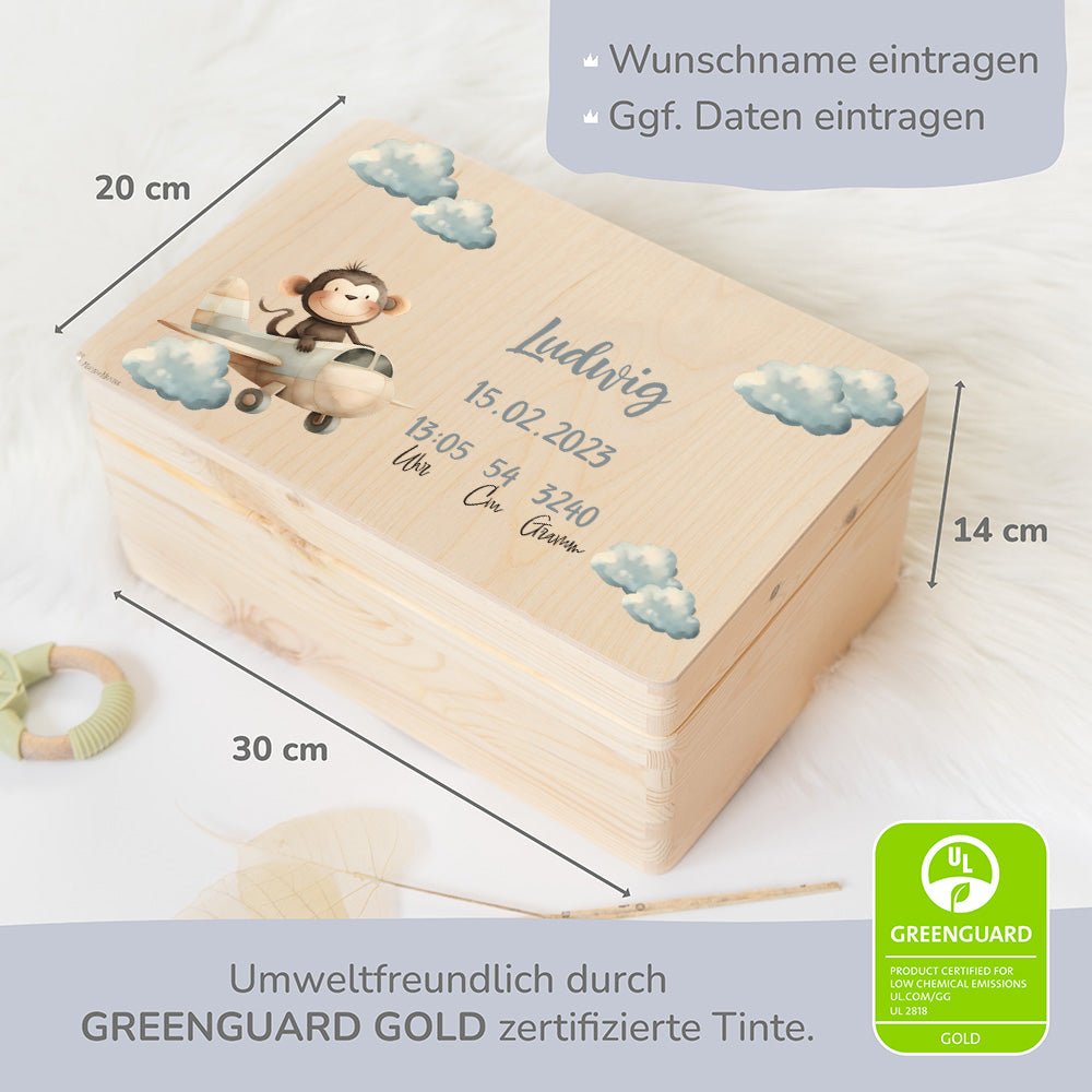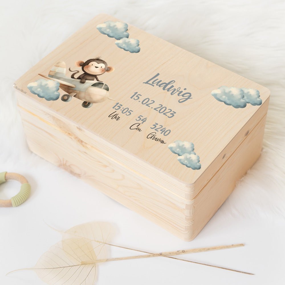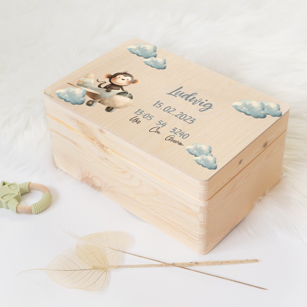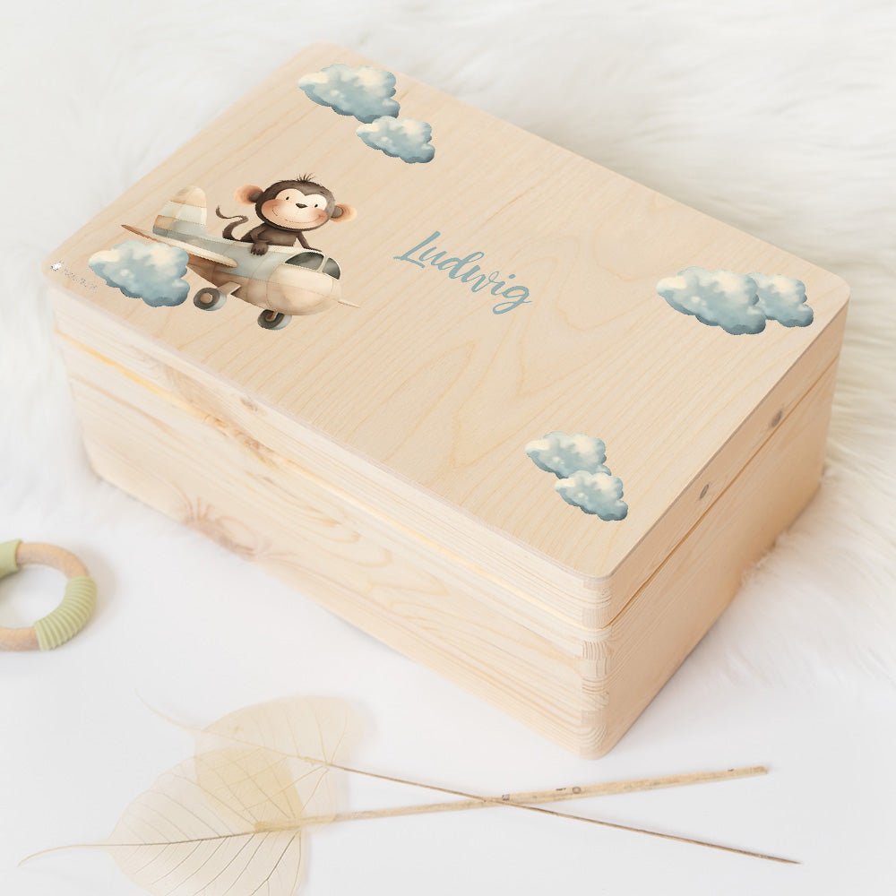 Affe im Flugzeug Motiv: Das Highlight dieser Kiste ist der individuelle Druck, der einen niedlichen Affen im Flugzeug zeigt. Dieses kindgerechte Motiv fängt die Fantasie und den Spaß der Kindheit ein und macht die Kiste zu einem ganz besonderen Geschenk.
