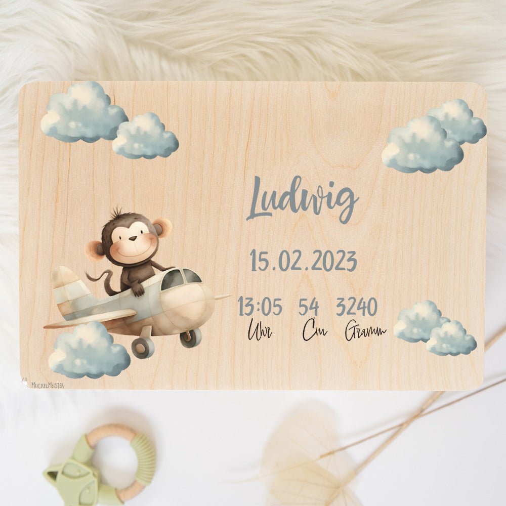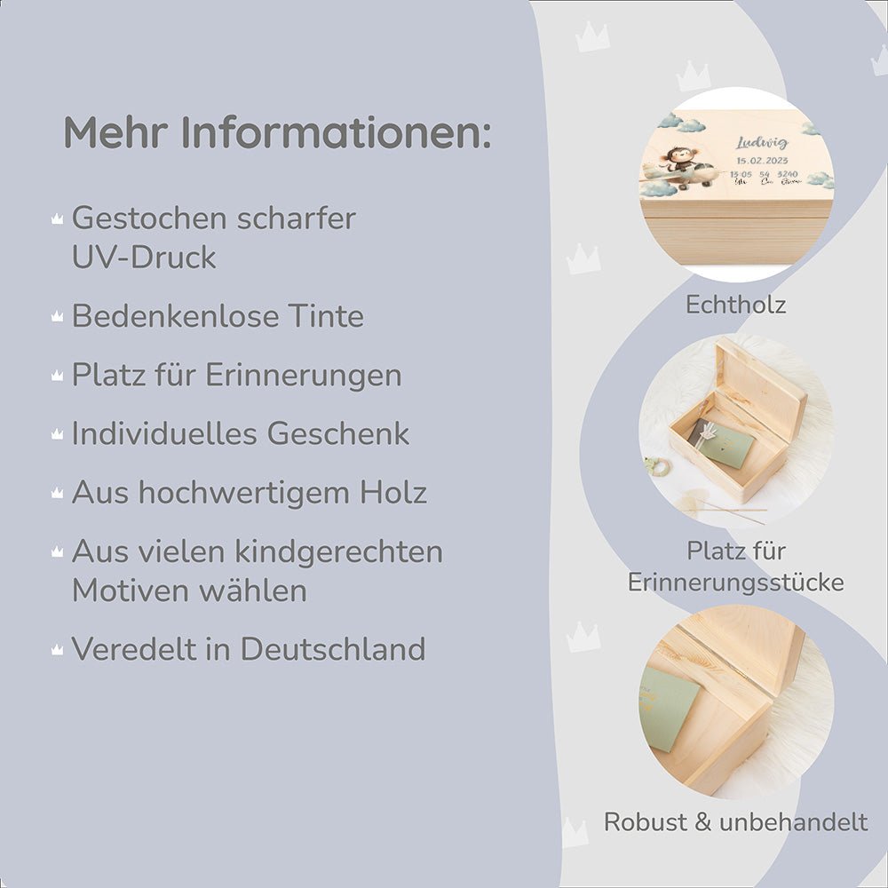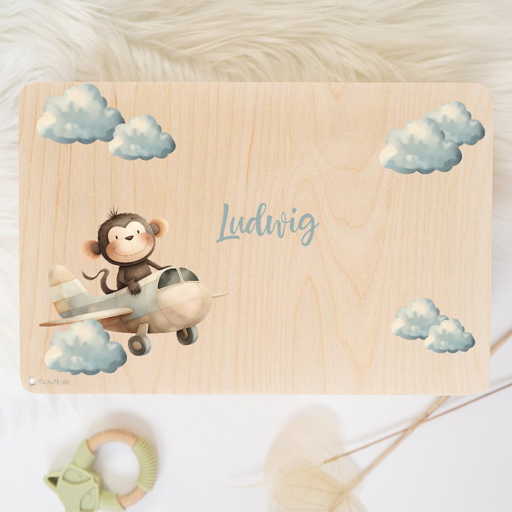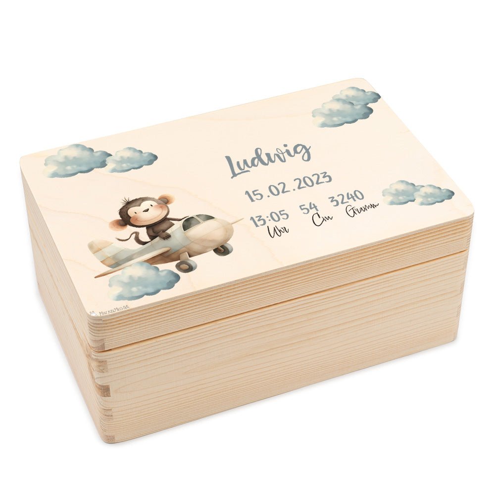 Affe im Flugzeug Motiv: Das Highlight dieser Kiste ist der individuelle Druck, der einen niedlichen Affen im Flugzeug zeigt. Dieses kindgerechte Motiv fängt die Fantasie und den Spaß der Kindheit ein und macht die Kiste zu einem ganz besonderen Geschenk.