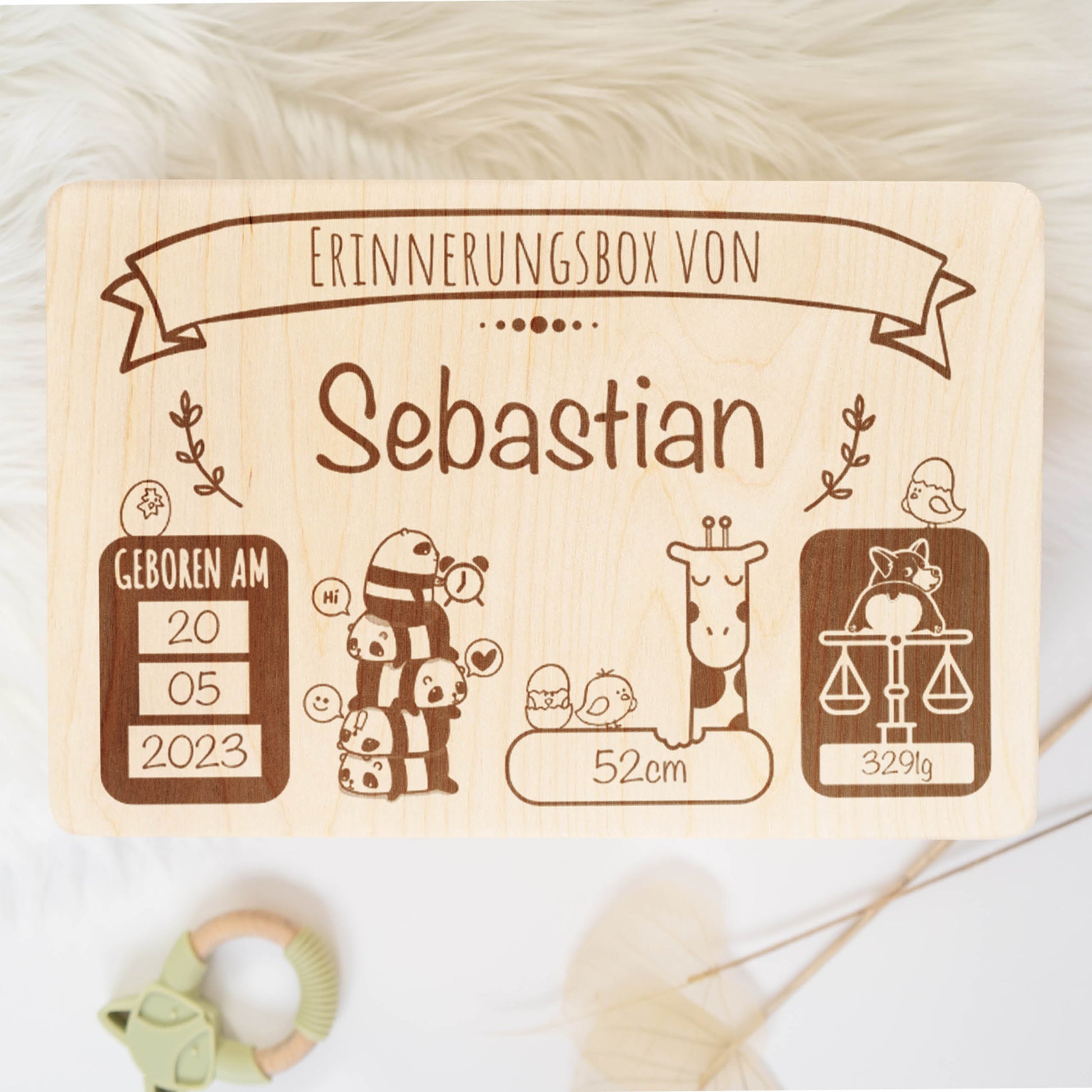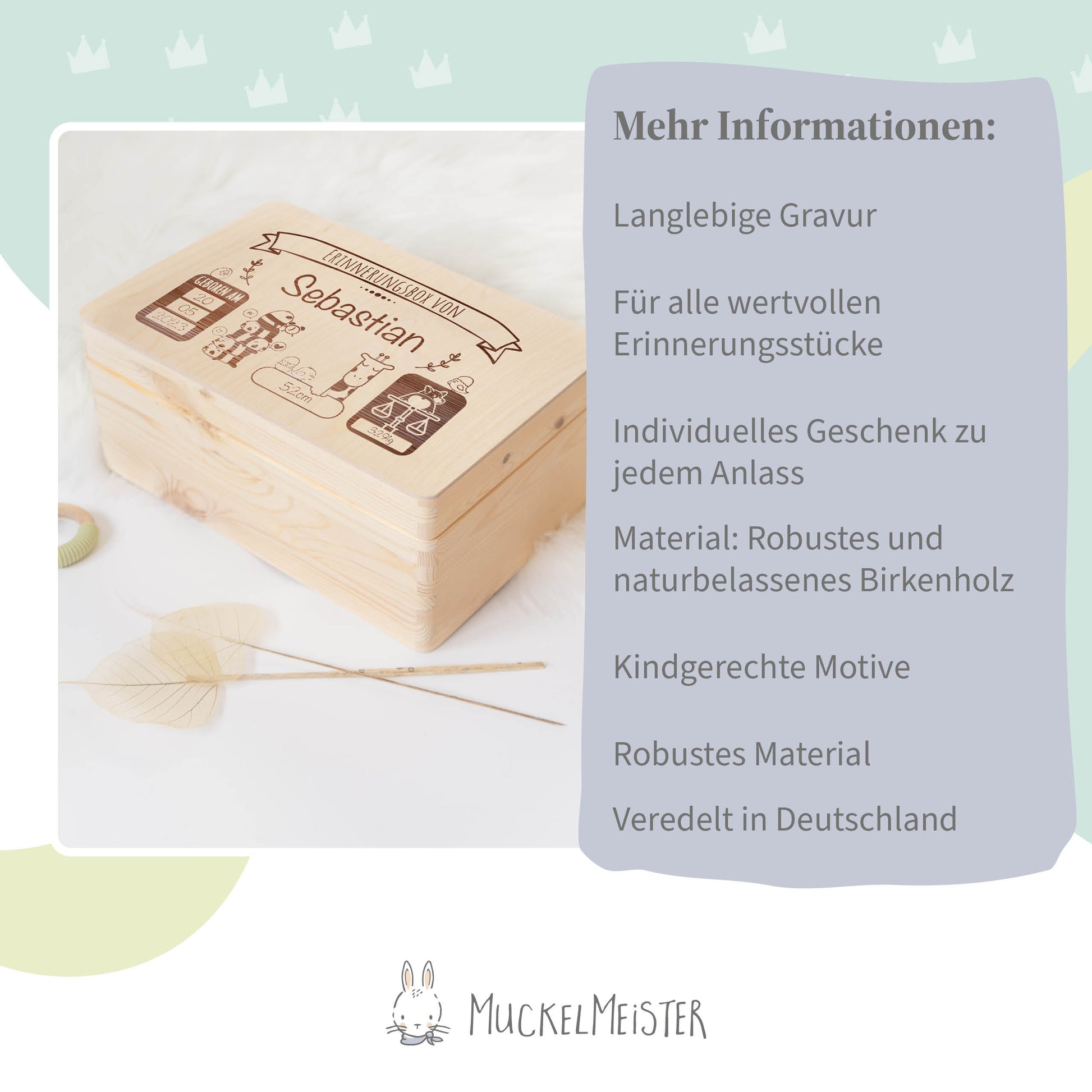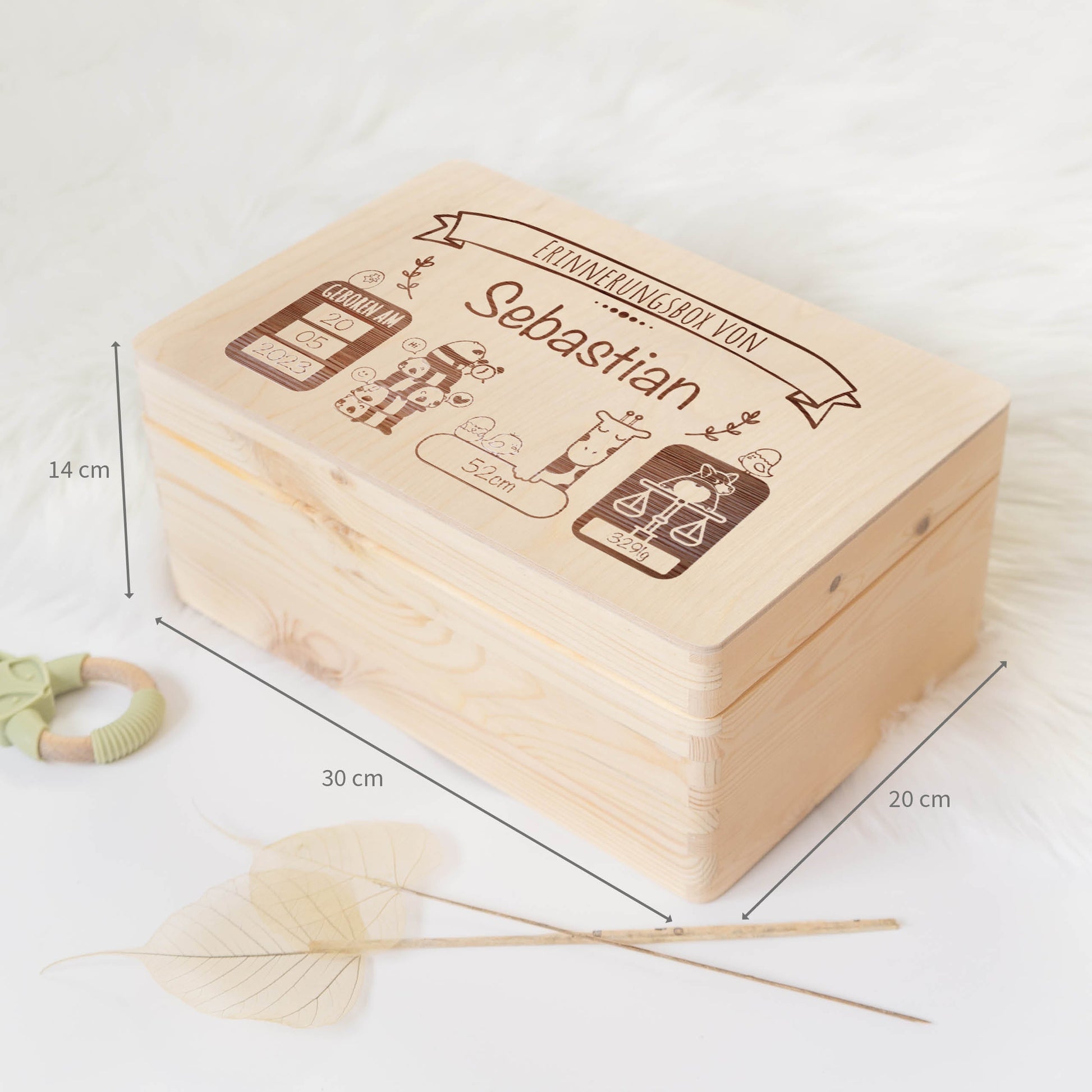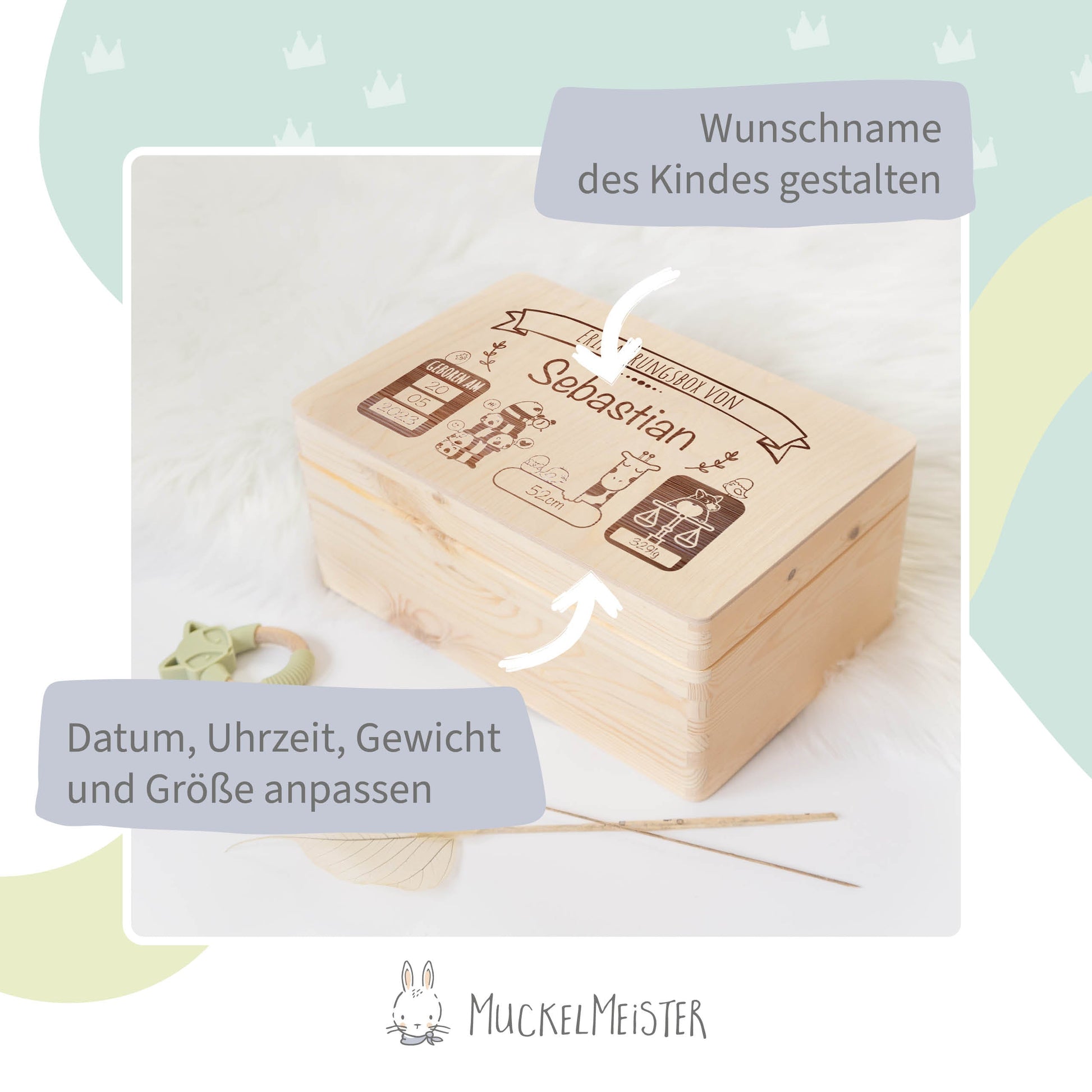 Individuelle Namensgravur: Personalisieren Sie die Kiste mit einer individuellen Gravur, Name, Geburtsdatum, Geburtsgewicht, Größe und Uhrzeit der Geburt. Für eine einzigartige Erinnerung.