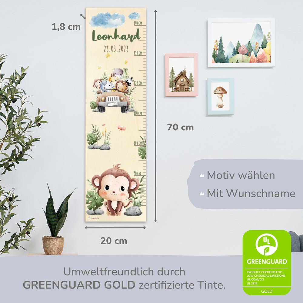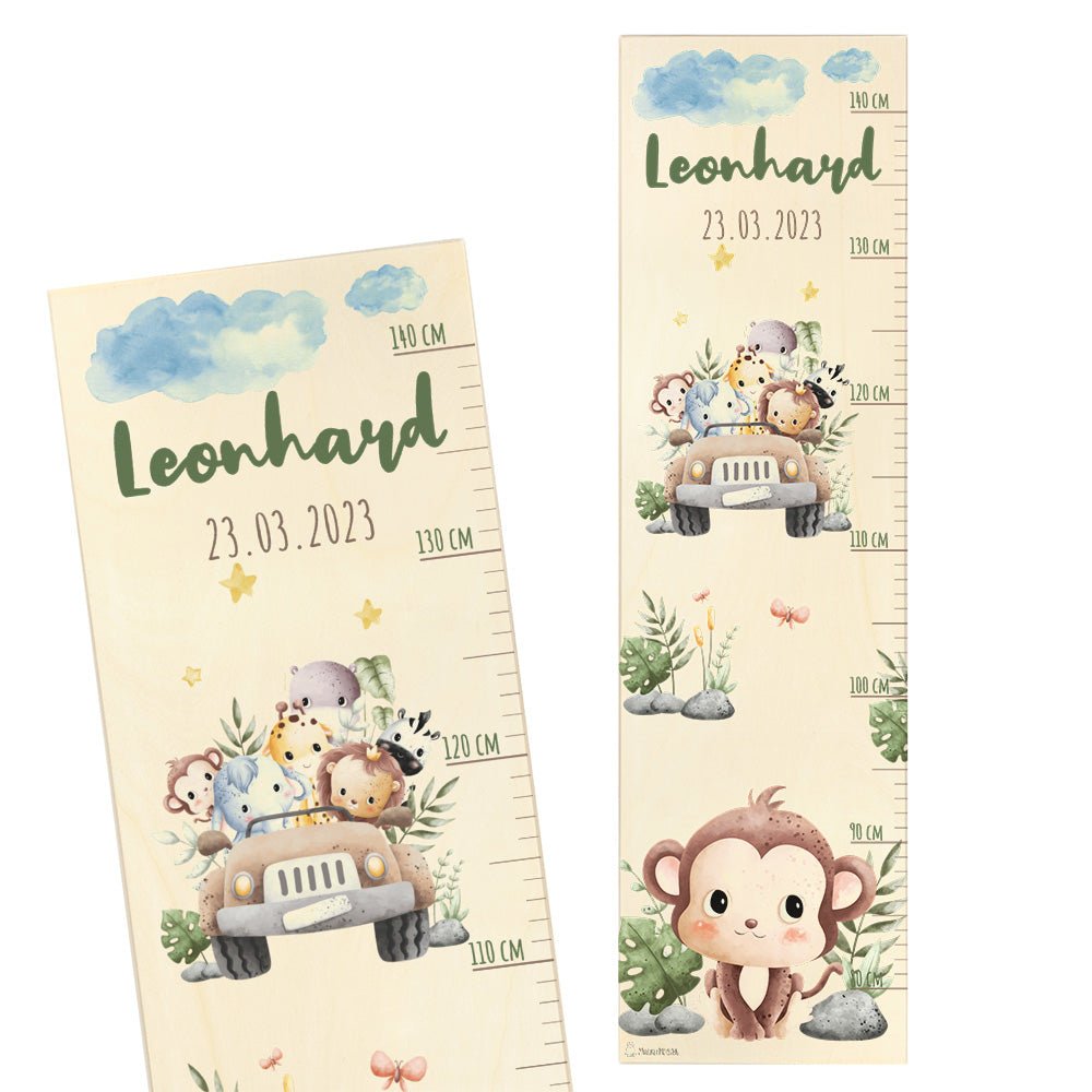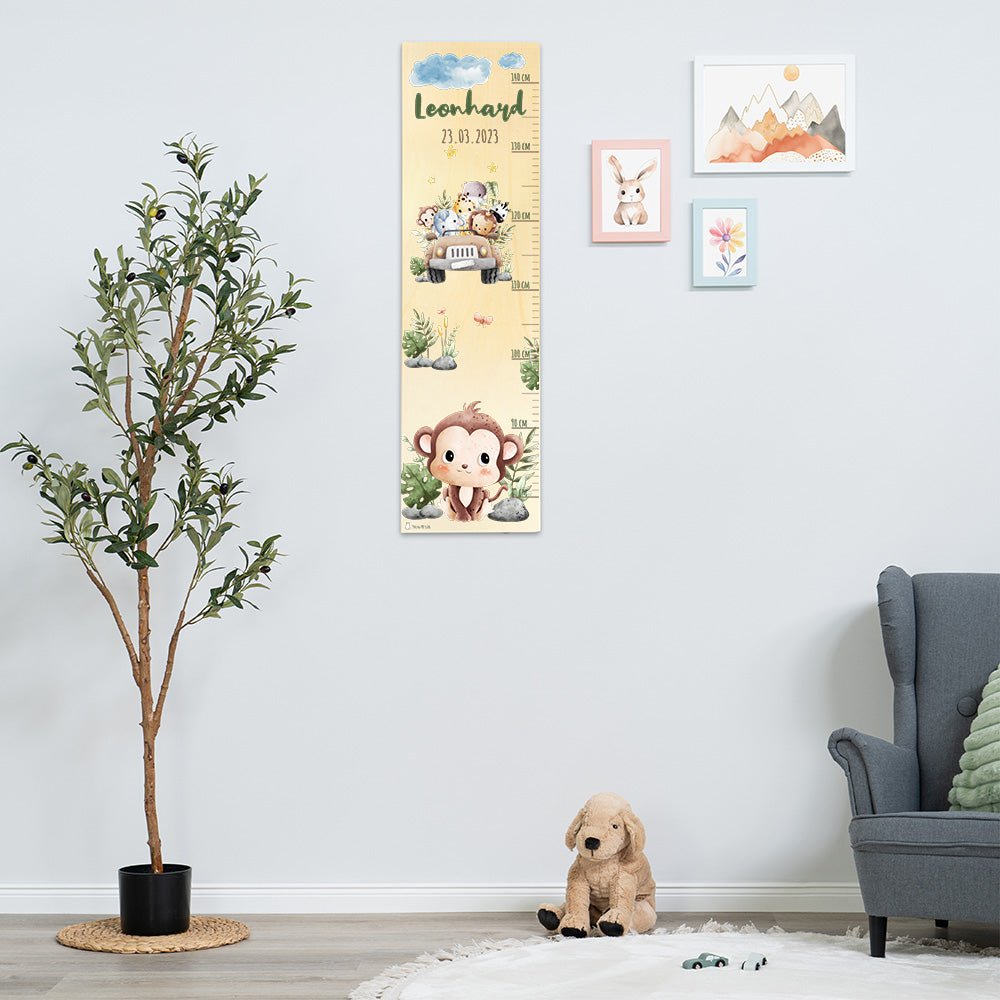 Begib dich auf eine spannende Safari durch die Savanne mit unserer Holz-Messlatte mit einem individuellen Motiv Affe mit Flugzeug! Diese liebevoll gestaltete Messlatte ist nicht nur ein praktisches Werkzeug, um das Wachstum deines kleinen Entdeckers zu verfolgen, sondern auch eine aufregende Dekoration, die jedes Kinderzimmer mit Abenteuerlust und Naturverbundenheit erfüllt.