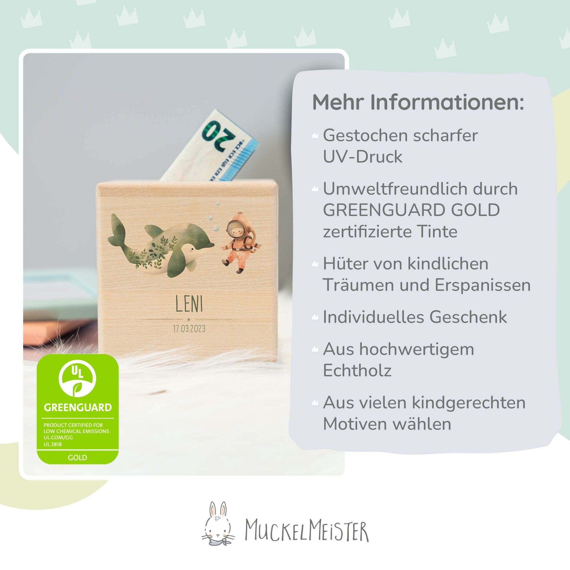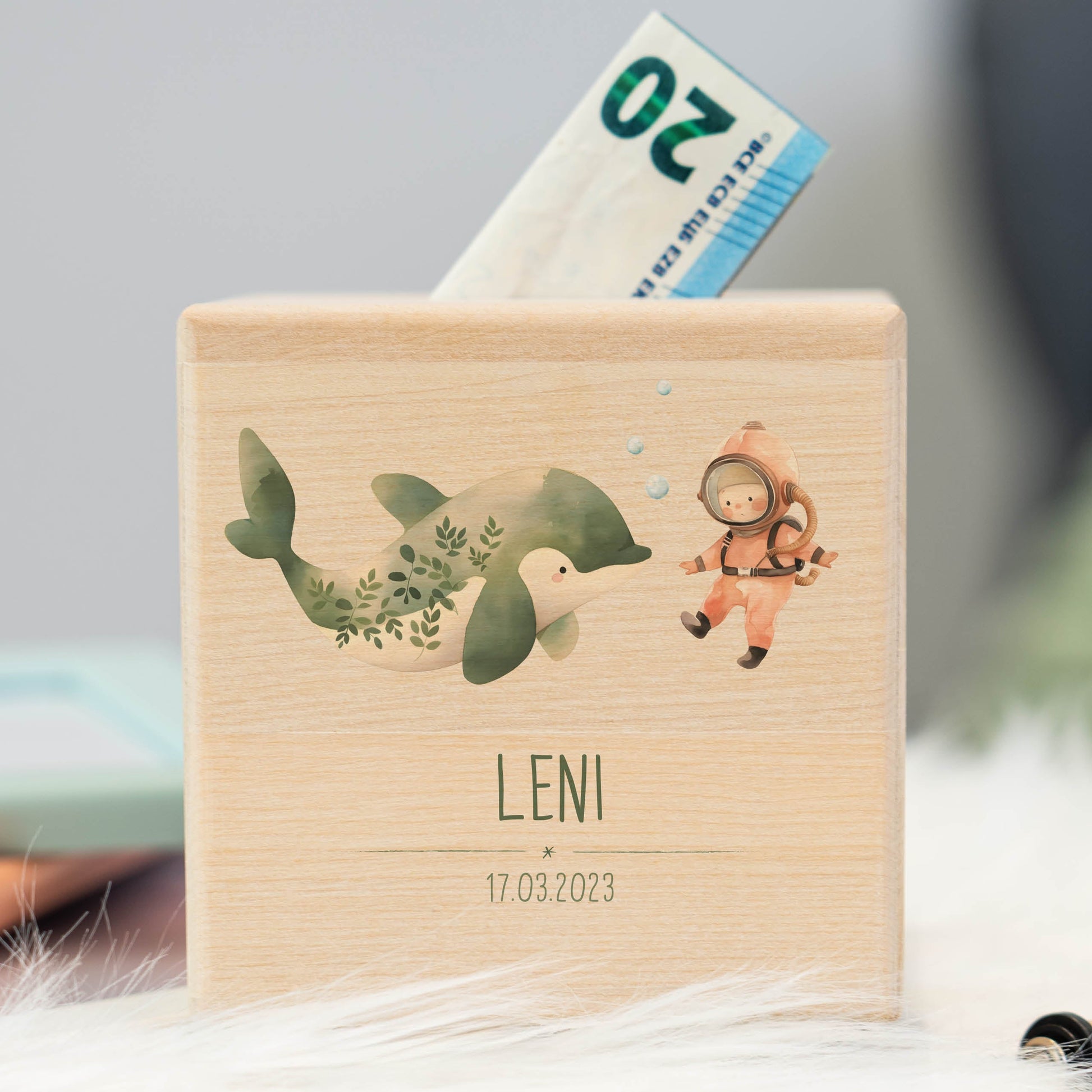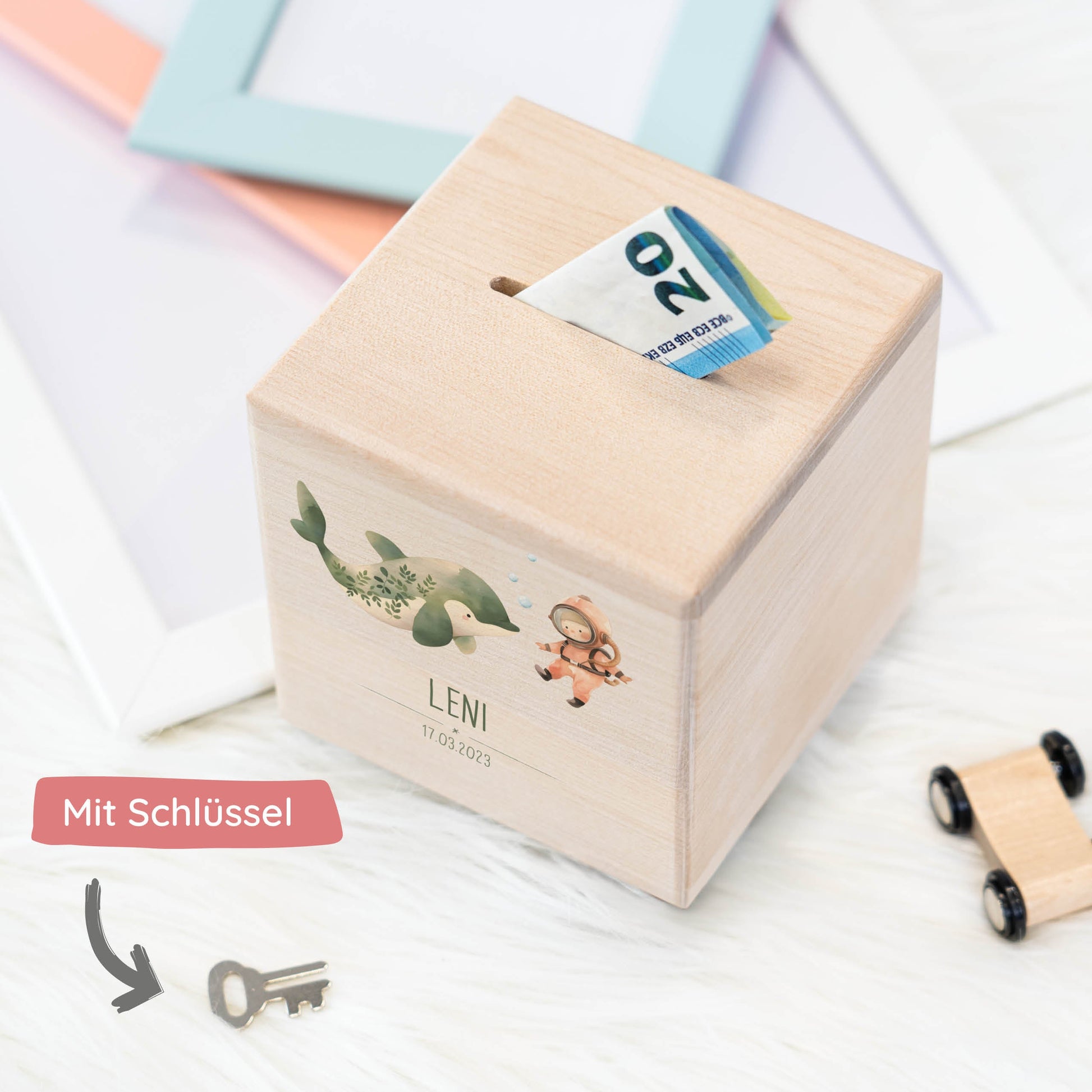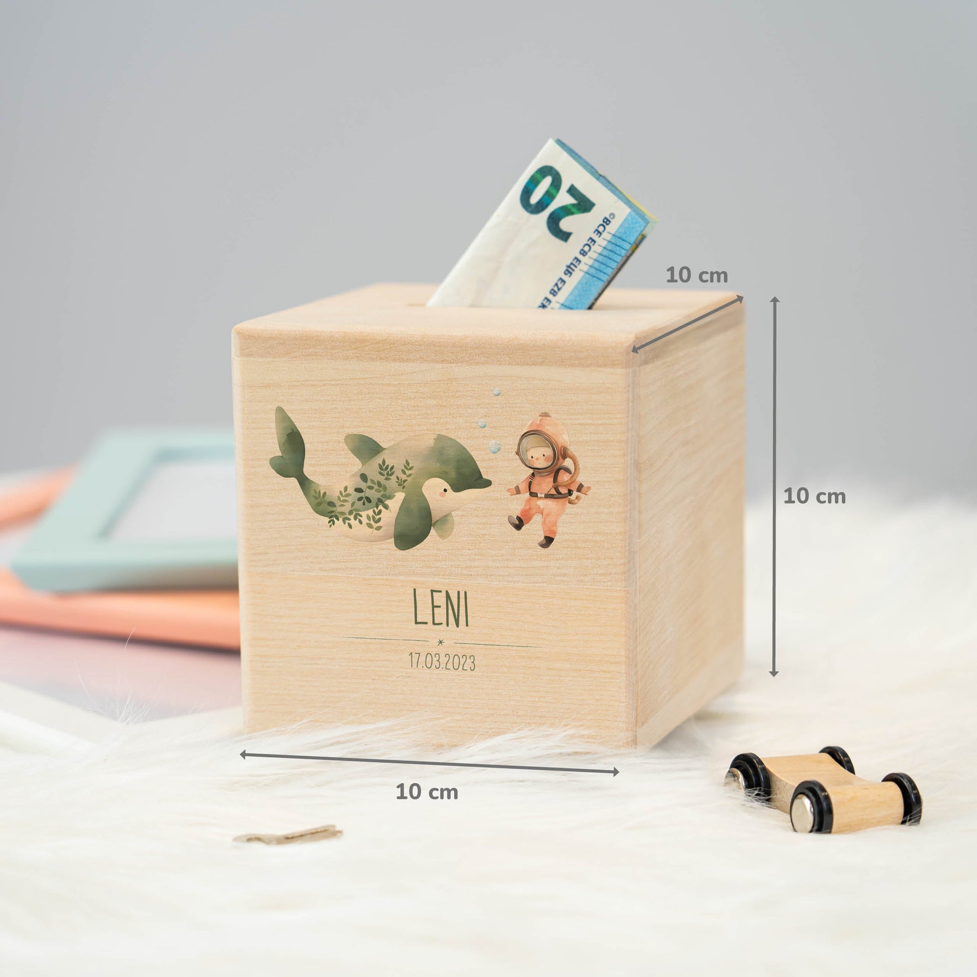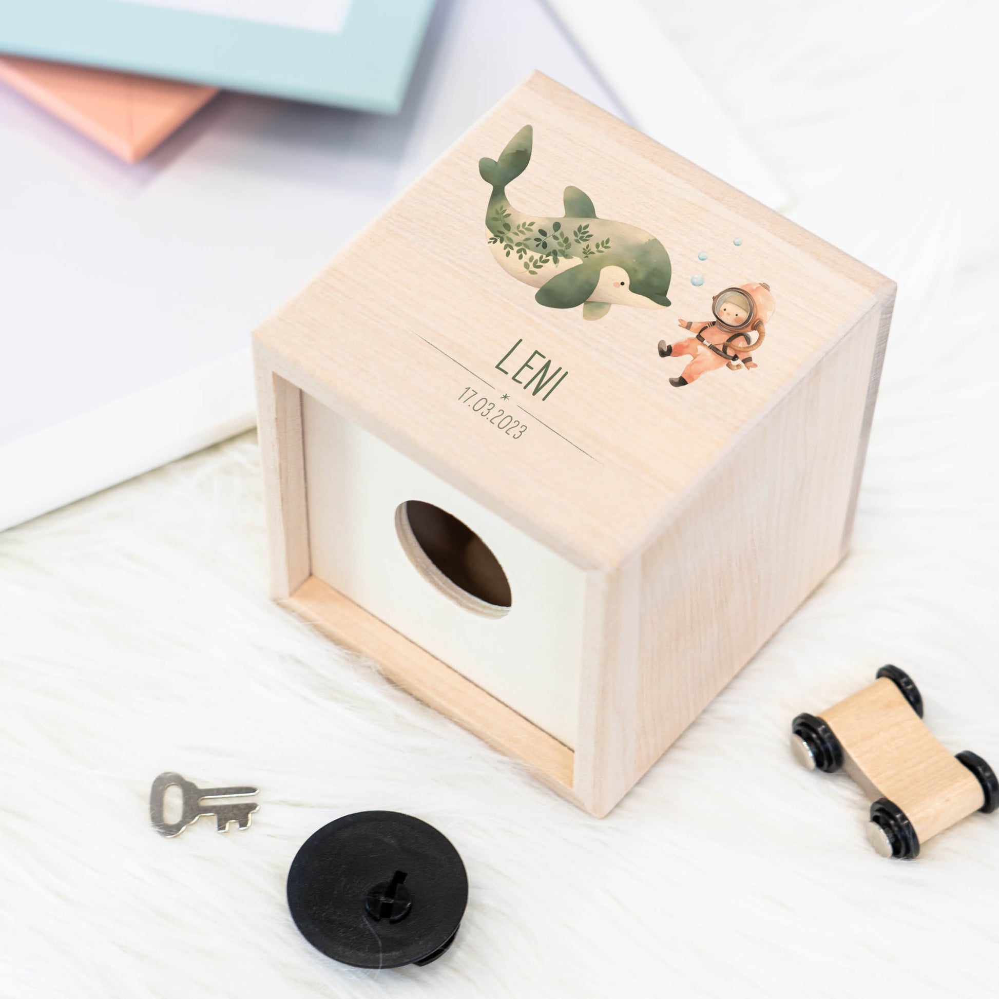 Tauche ein in eine fabelhafte Welt voller Abenteuer mit unserer bezaubernden „ Delfin “ Holz-Spardose! Diese handgefertigte Spardose ist nicht nur ein sicherer Ort, um das Taschengeld Ihrer Kleinen aufzubewahren, sondern auch ein charmantes Dekorationsstück, das jedes Kinderzimmer mit Freude erfüllt.