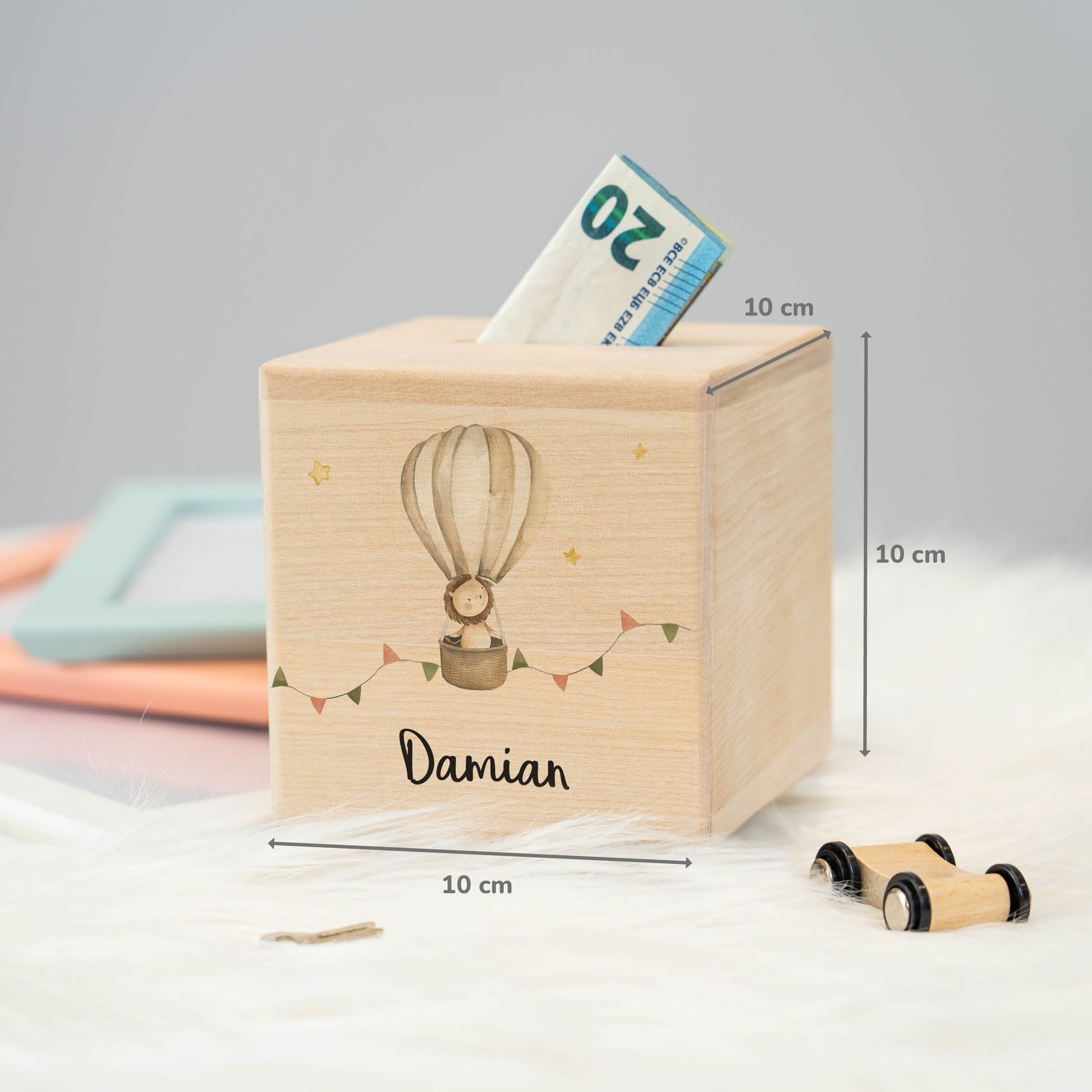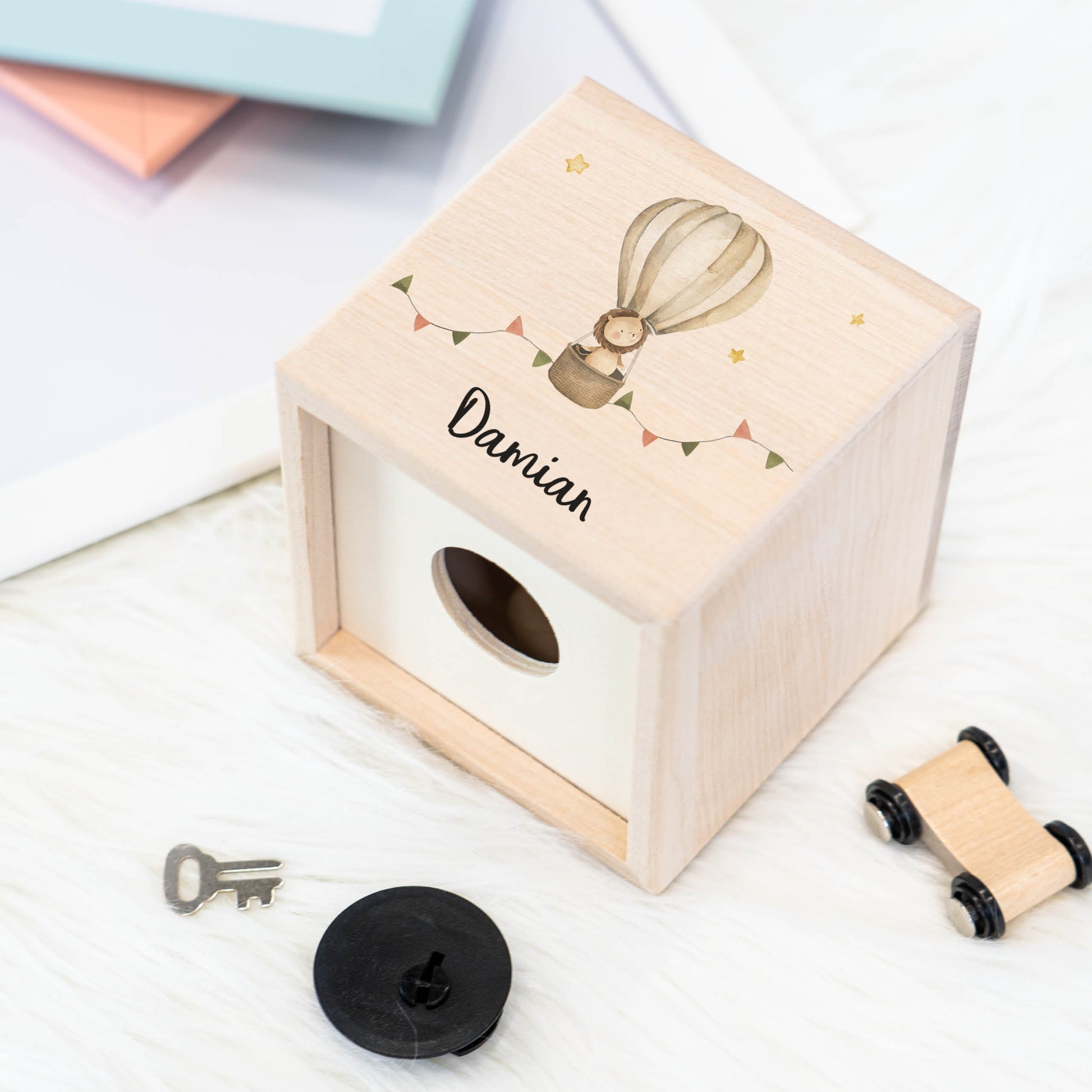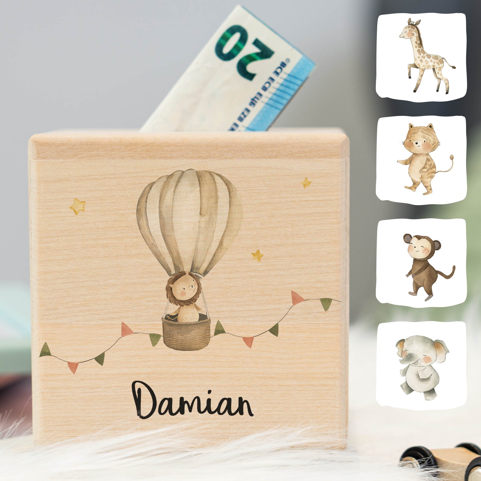 Willkommen zu einer aufregenden Reise hoch über den Wolken mit unserem entzückenden „Tiere im Heißluftballon“ Holz-Spardose! Diese kunstvoll gefertigte Spardose ist nicht nur ein sicherer Ort, um das Geld deiner Kleinen zu bewahren, sondern auch ein zauberhaftes Dekorationsstück, das jedes Kinderzimmer aufhellt.