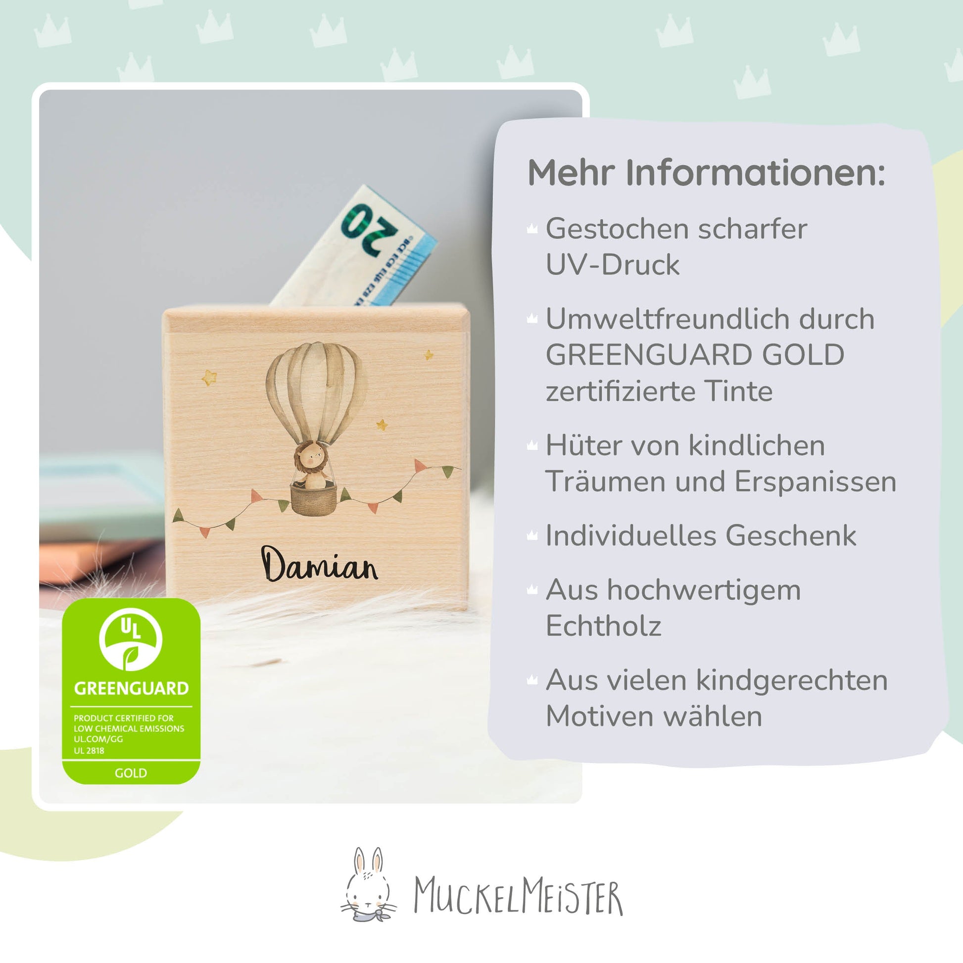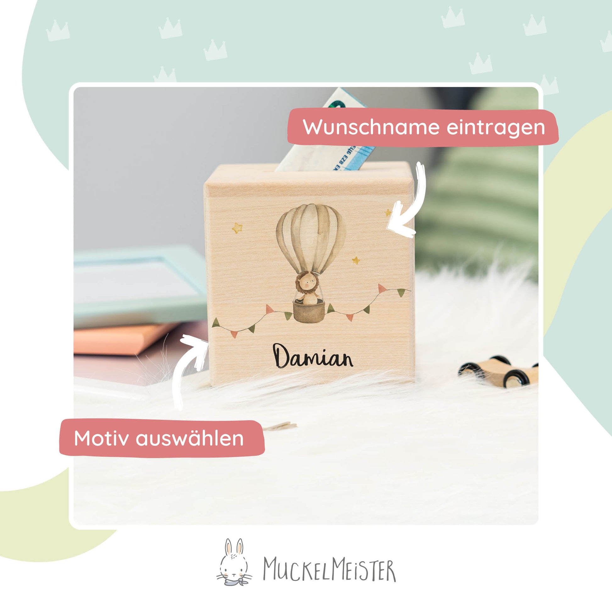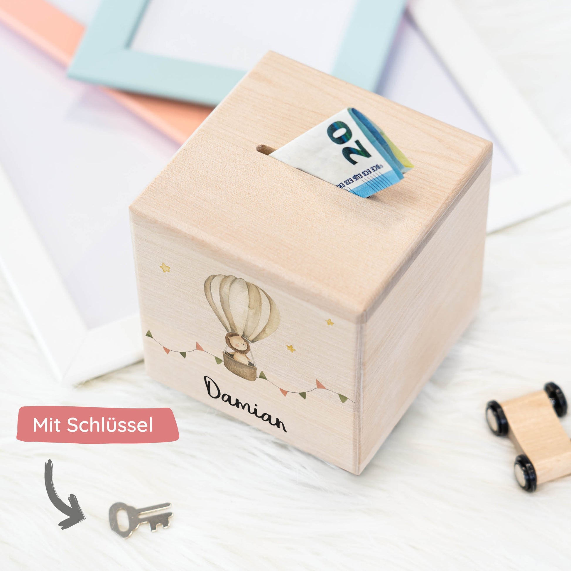 Willkommen zu einer aufregenden Reise hoch über den Wolken mit unserem entzückenden „Tiere im Heißluftballon“ Holz-Spardose! Diese kunstvoll gefertigte Spardose ist nicht nur ein sicherer Ort, um das Geld deiner Kleinen zu bewahren, sondern auch ein zauberhaftes Dekorationsstück, das jedes Kinderzimmer aufhellt.