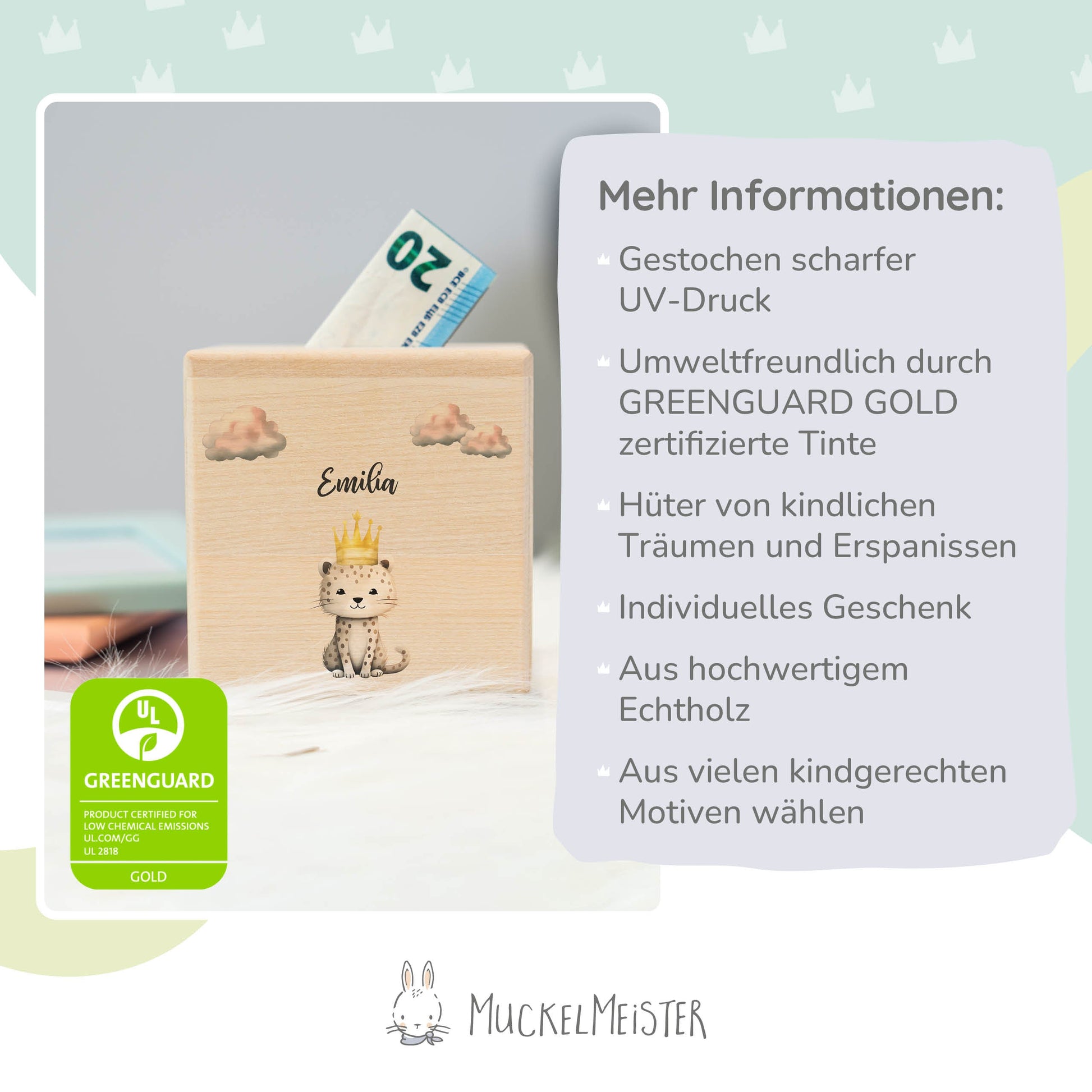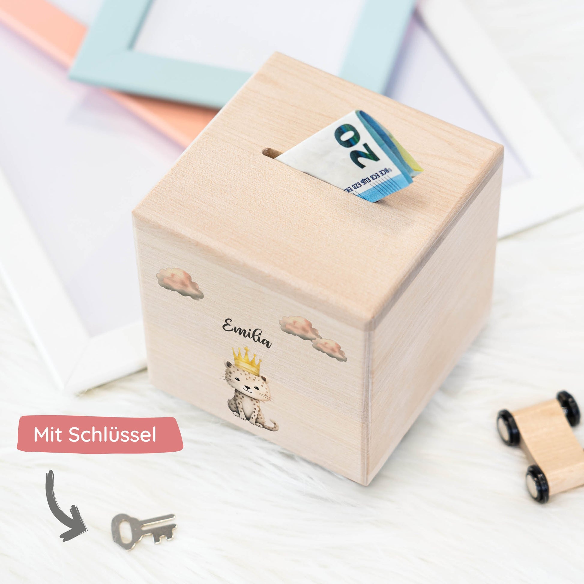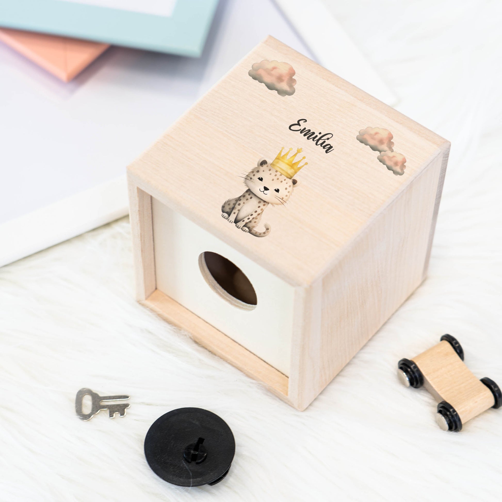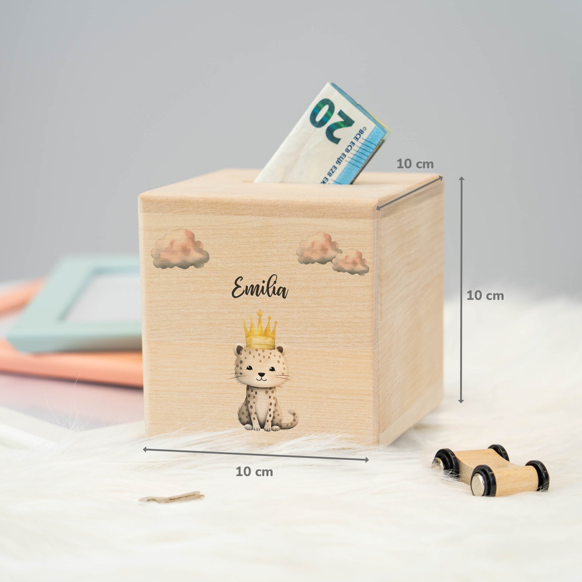 Willkommen im Reich des königlichen Sparens mit unserer majestätischen „Leopard mit Krone“ Holz-Spardose! Diese handgefertigte Spardose ist nicht nur ein sicherer Ort, um das Taschengeld Ihrer Kleinen aufzubewahren, sondern auch ein königliches Dekorationsstück, das jedes Kinderzimmer mit Eleganz erfüllt.