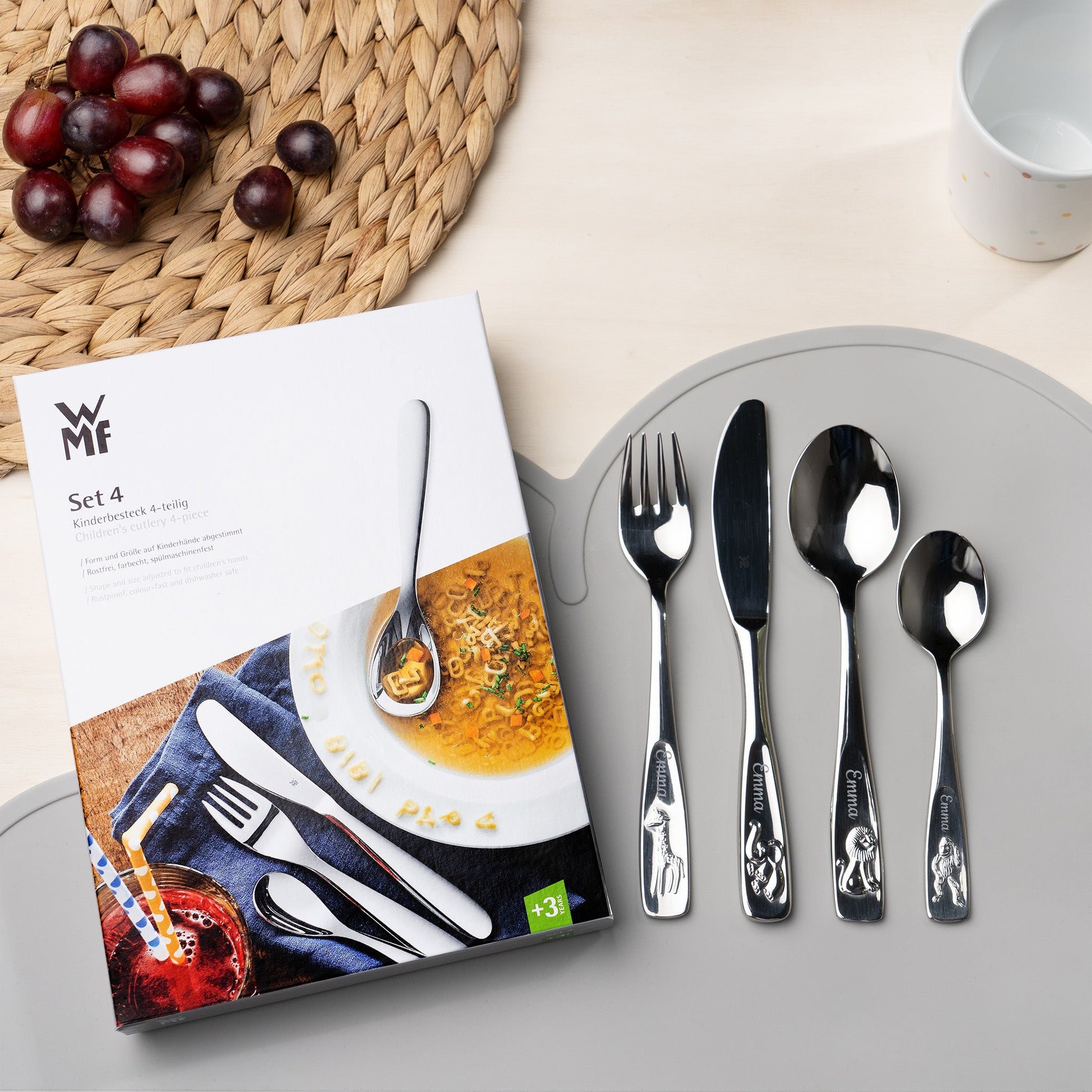 Modell „Tiere“ von WMF: Das Besteck-Set ist mit niedlichen Tiermotiven von WMF verziert, die die Fantasie und Begeisterung der Kinder anregen. Von verspielten Elefanten bis zu niedlichen Affen – jedes Teil des Besteck-Sets ist liebevoll gestaltet und macht das Essen zu einem unterhaltsamen Erlebnis.