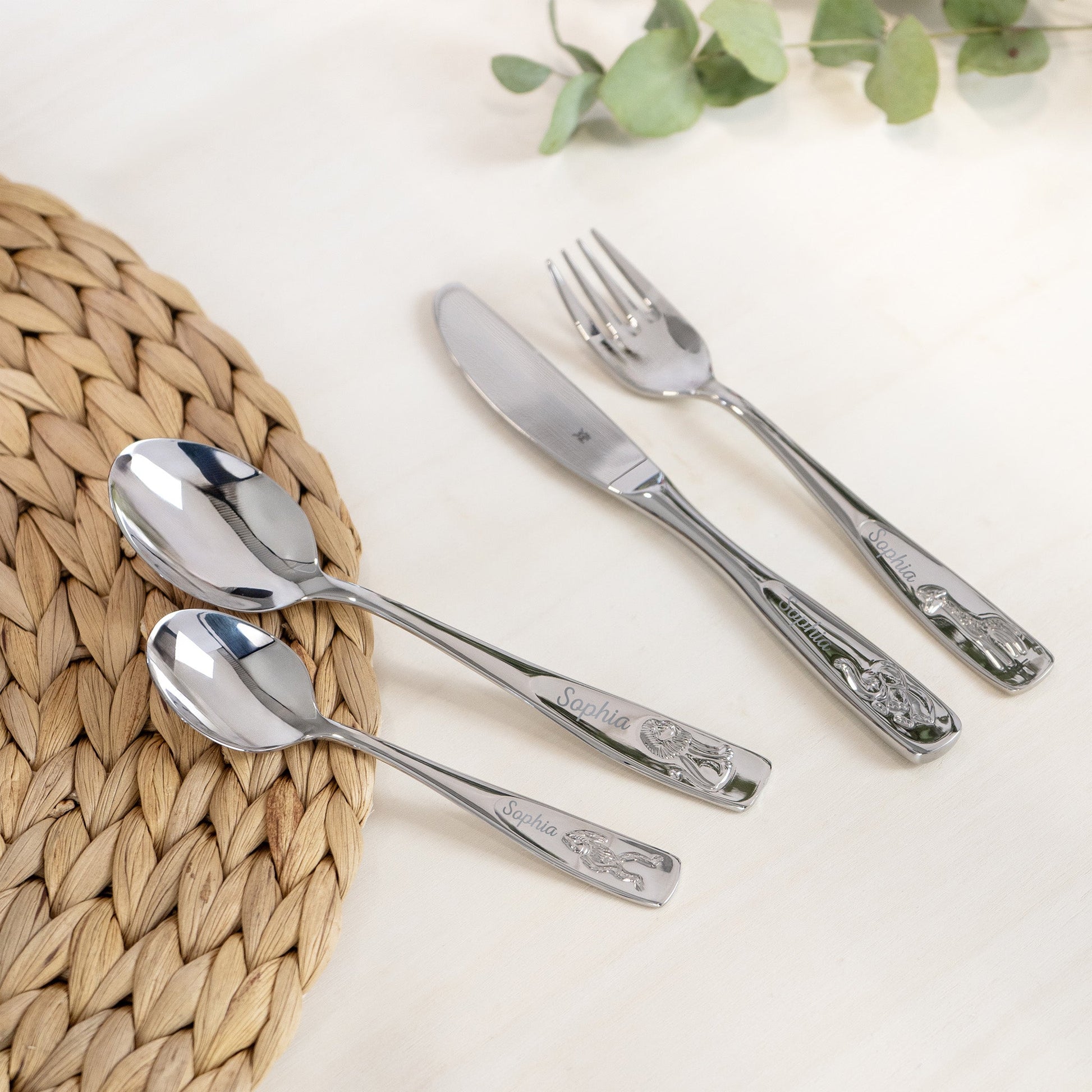 Individuelle Namensgravur: Jedes Besteckteil wird mit dem Namen des Kindes graviert, um ihm eine persönliche Notiz zu verleihen, um das Set zu einem einzigartigen Geschenk zu machen.