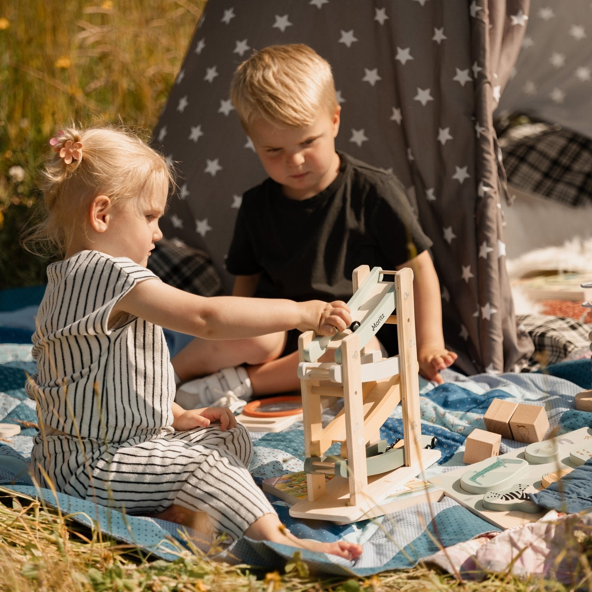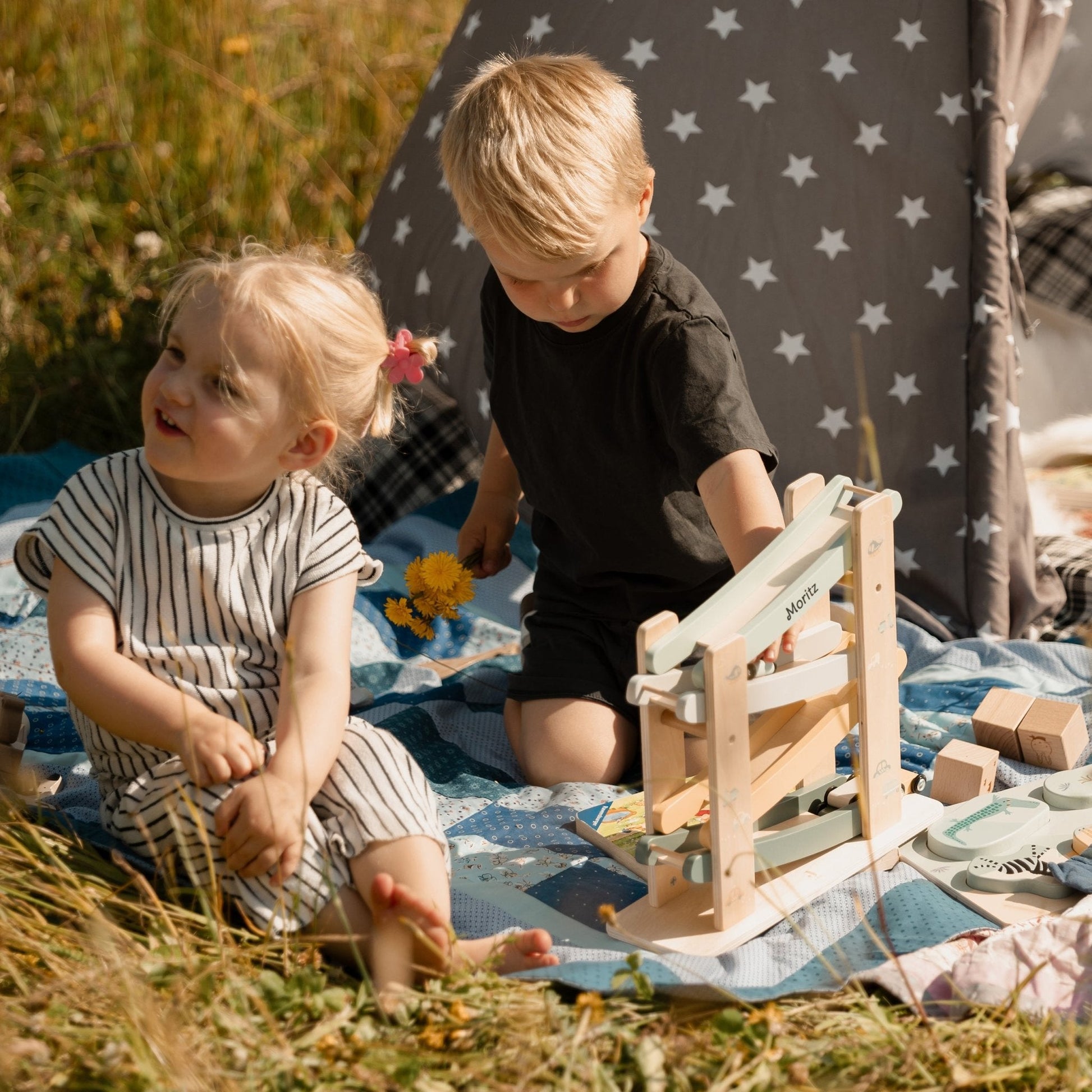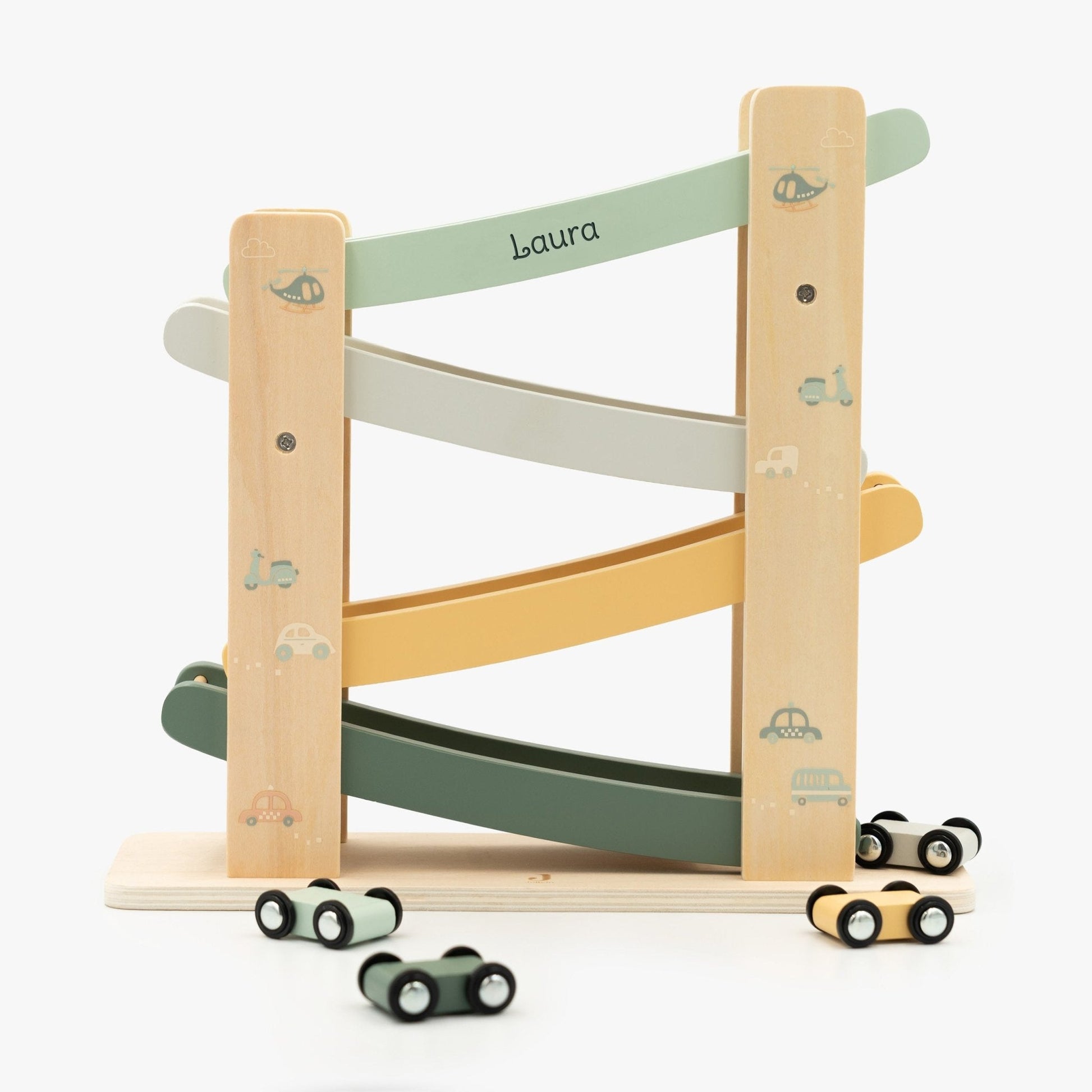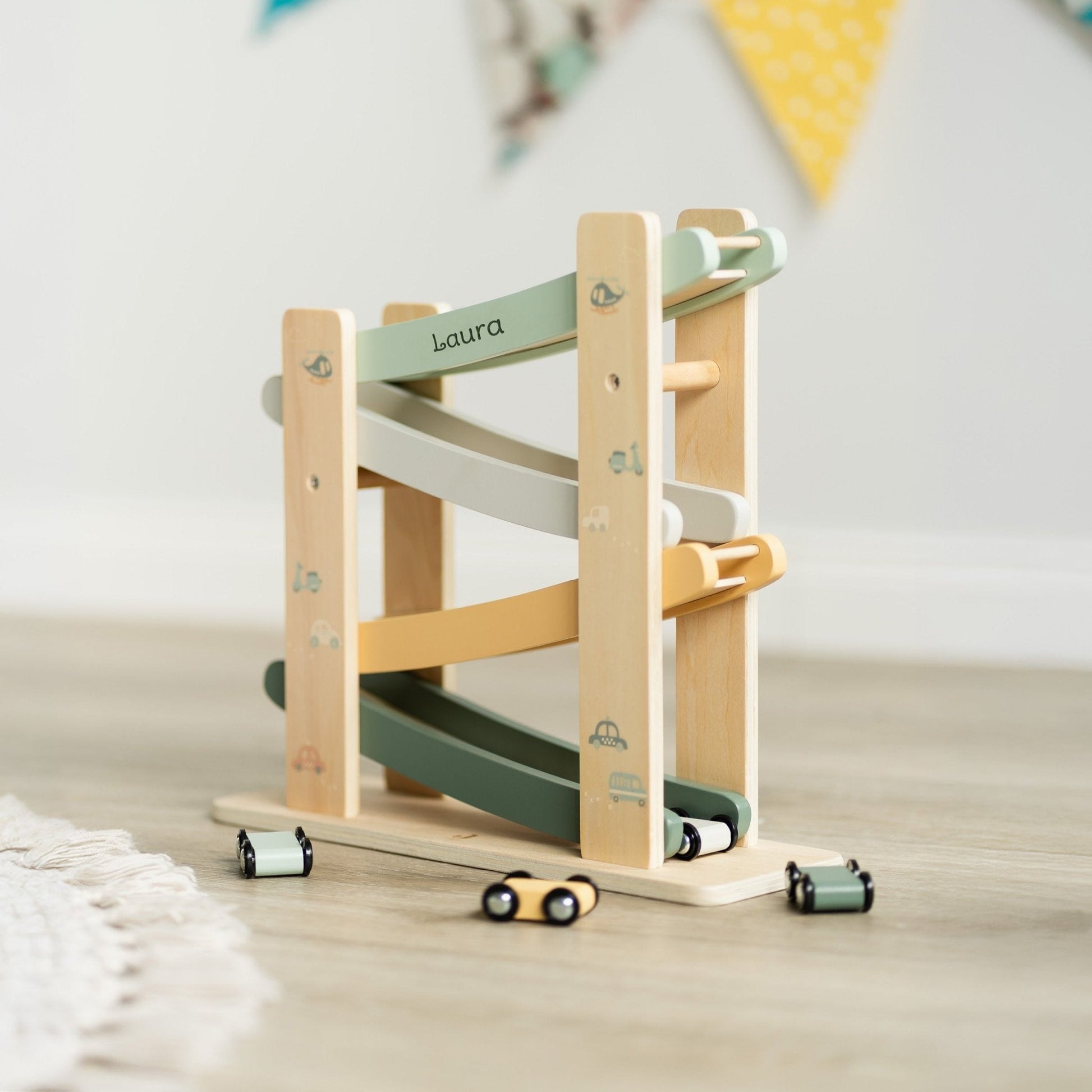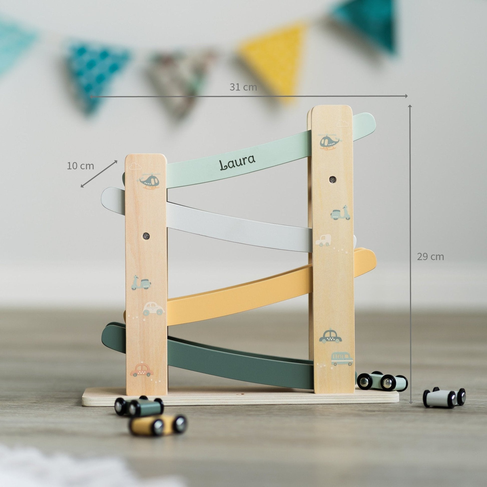 Manchmal braucht es nur ein paar rollende Räder, um Kinderaugen leuchten zu lassen. Diese liebevoll gestaltete Holzrennbahn sorgt für jede Menge Bewegung und Staunen. Die bunten Flitzer sausen Kurve für Kurve die Bahn hinunter – immer wieder aufs Neue.