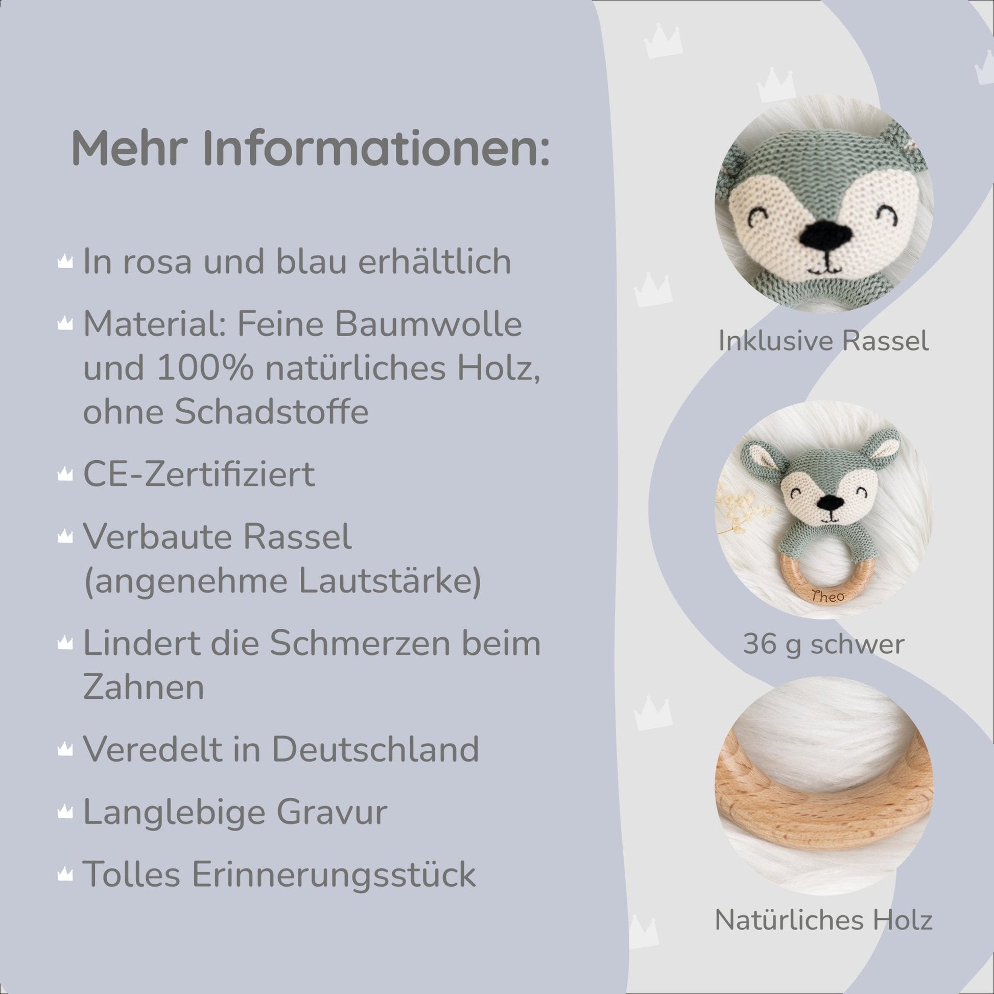 Entdecken Sie den idealen Begleiter für die ersten spielerischen Entdeckungen Ihres Babys - unseren personalisierten Greifling mit Rassel und individueller Gravur im entzückenden hellblauen Reh-Design! Dieser liebevoll gestaltete Greifling ist nicht nur ein einfaches Spielzeug, sondern auch ein einzigartiges Erinnerungsstück, das die frühen Lebensmomente Ihres kleinen Lieblings für immer festhält.