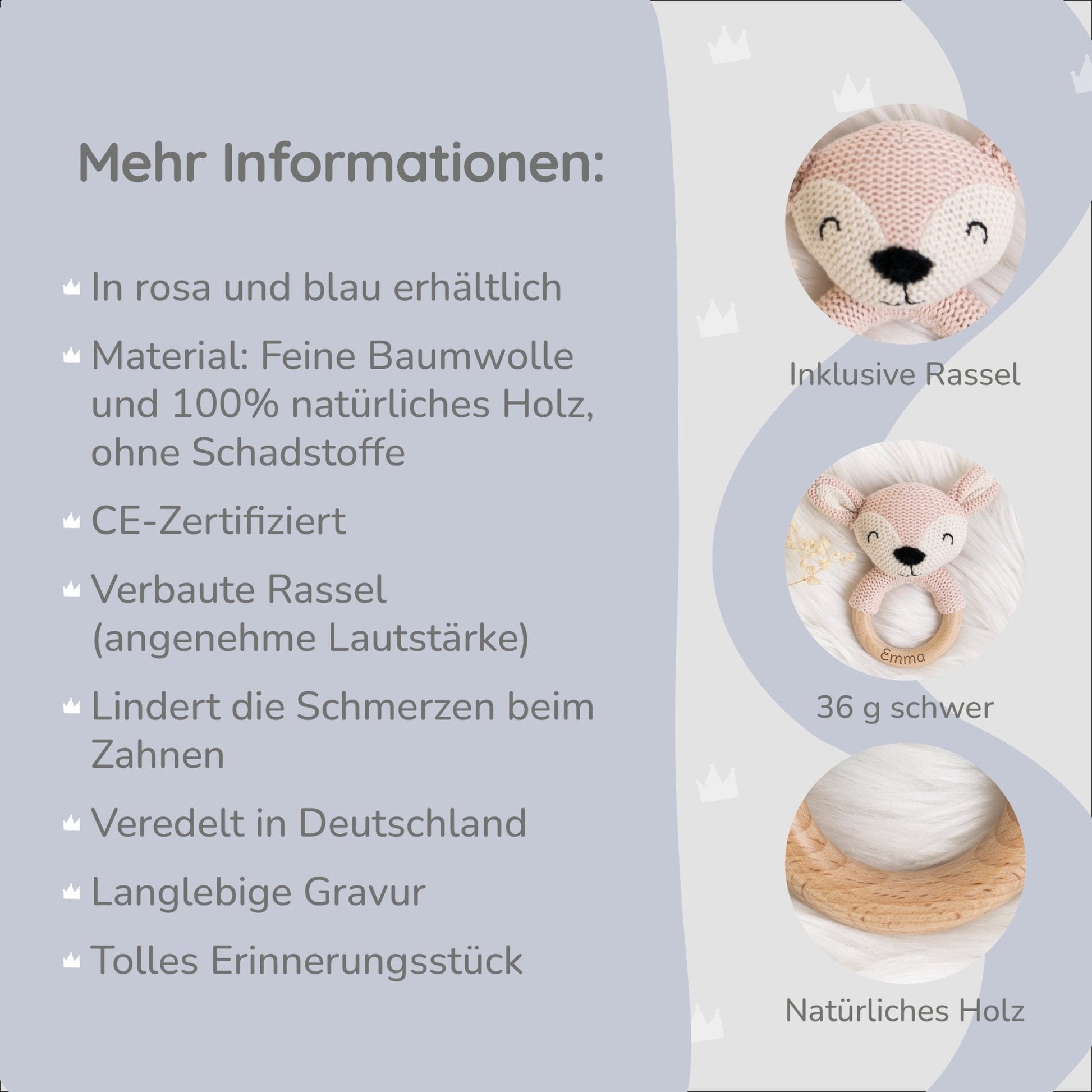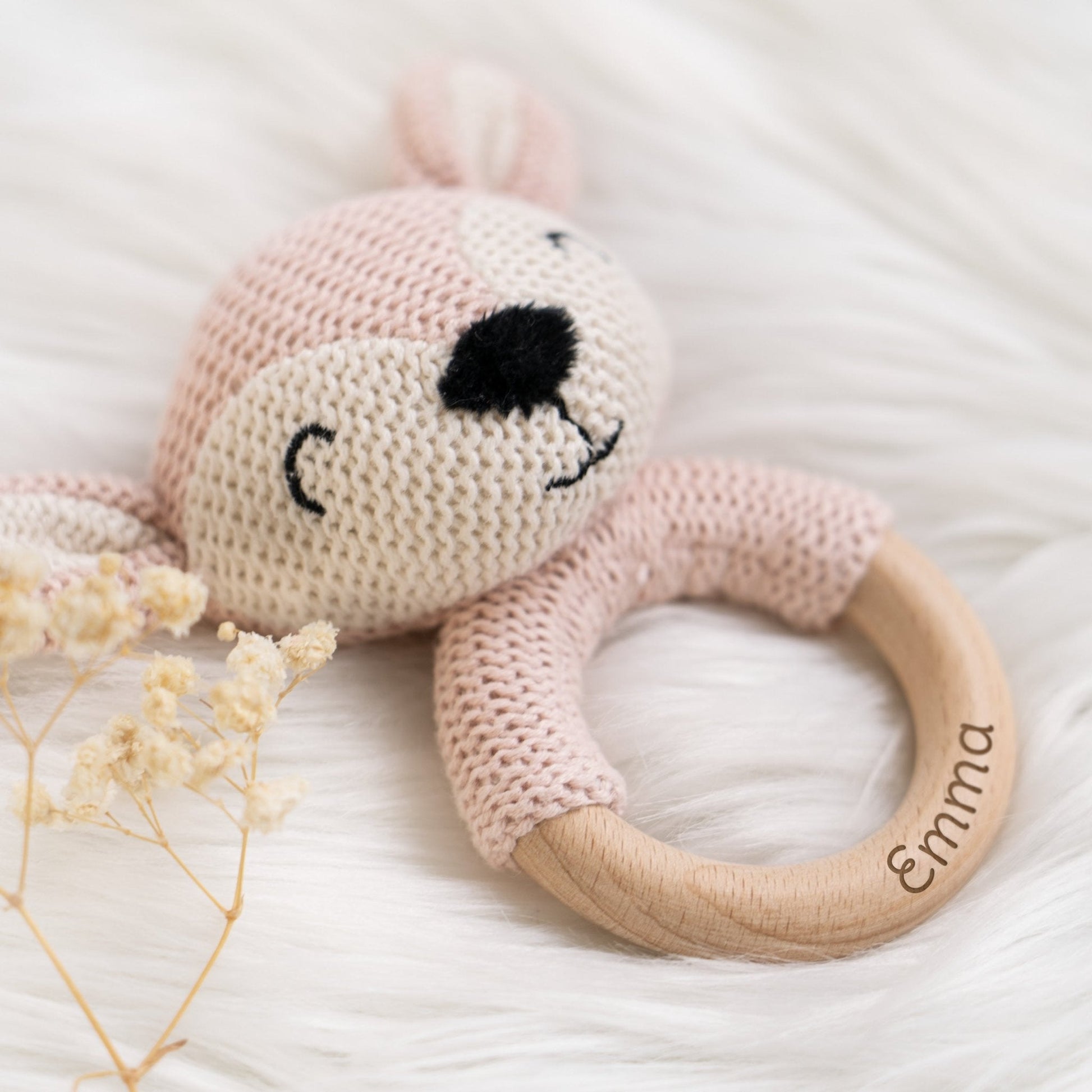 Entdecken Sie den perfekten Begleiter für die ersten spielerischen Entdeckungen Ihres Babys - unseren personalisierten Greifling mit Rassel und individueller Gravur im niedlichen Reh-Design! Dieser liebevoll gestaltete Greifling ist nicht nur ein Spielzeug, sondern auch ein einzigartiges Erinnerungsstück, das die frühen Lebensmomente Ihres kleinen Schatzes festhält.