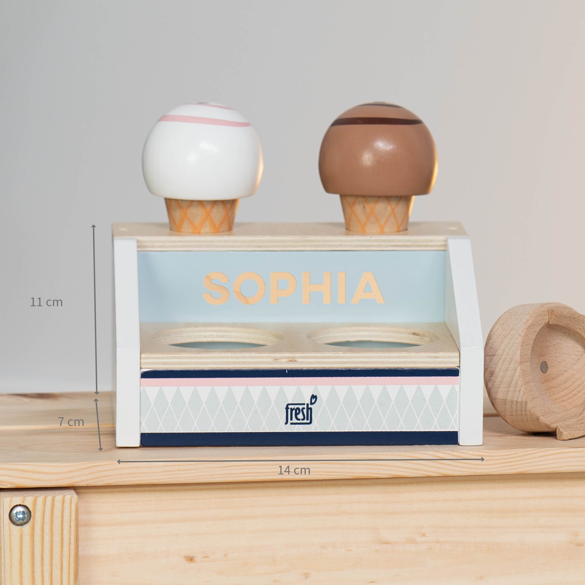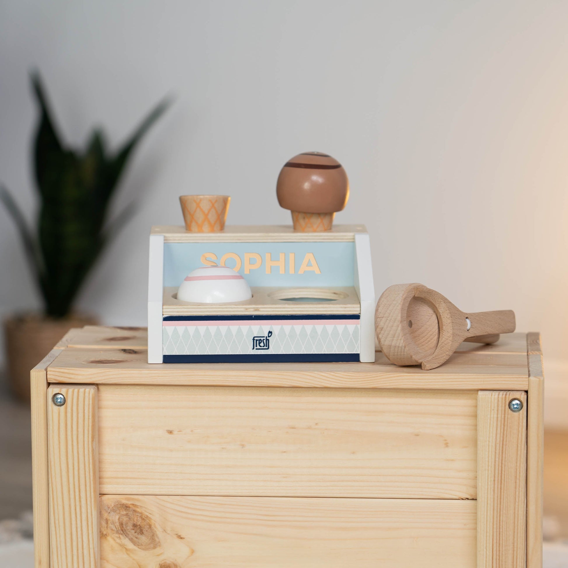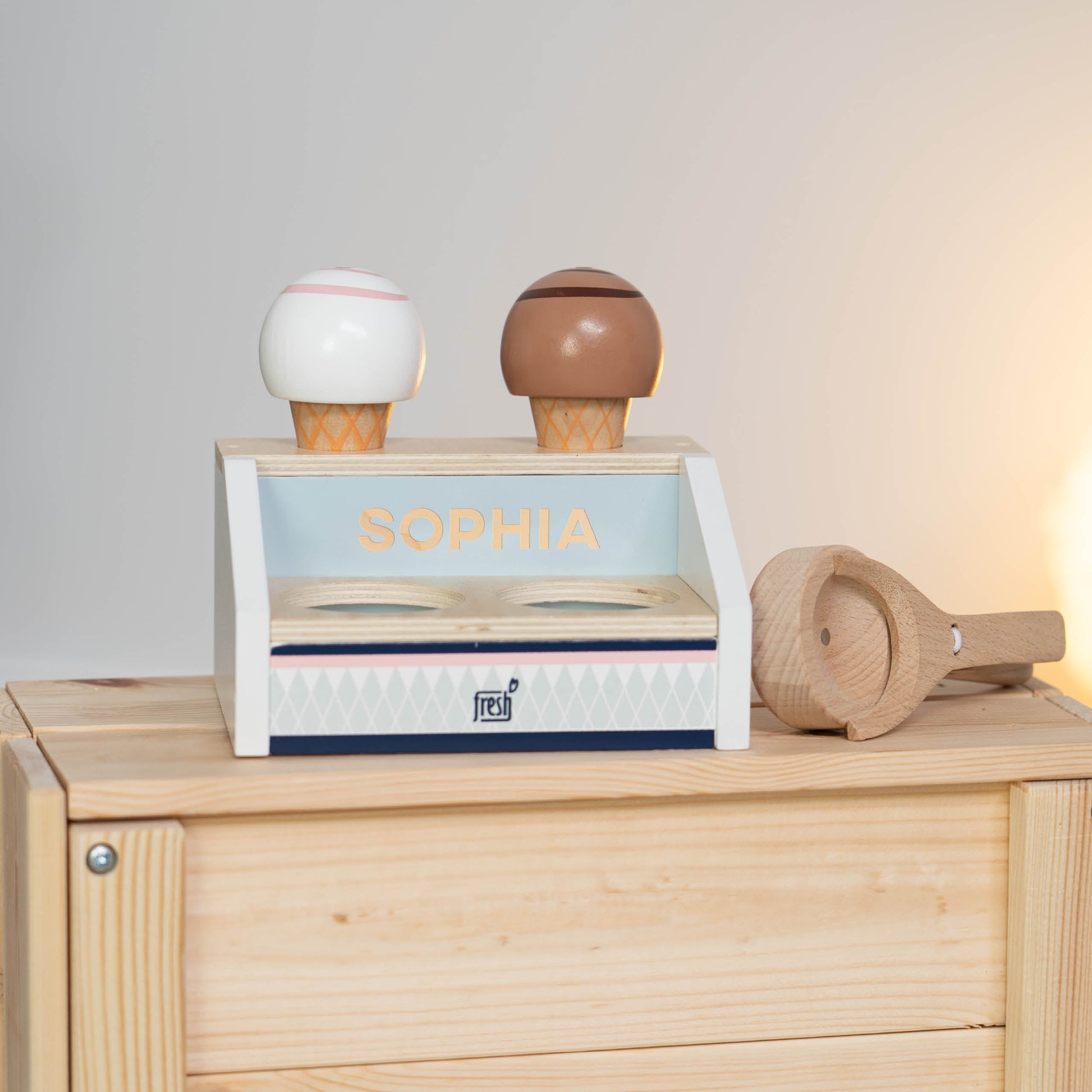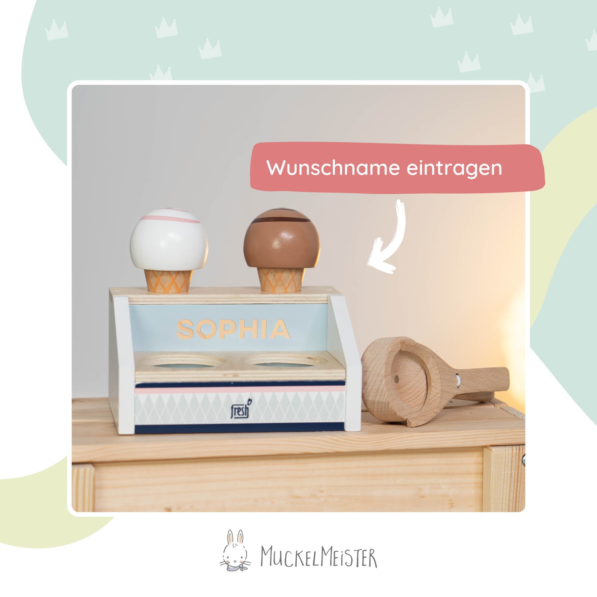 Durch die Personalisierung z.B. deines Wunschnamens per Lasergravur wird die Eistheke ein Hingucker für jeden Kaufladen.