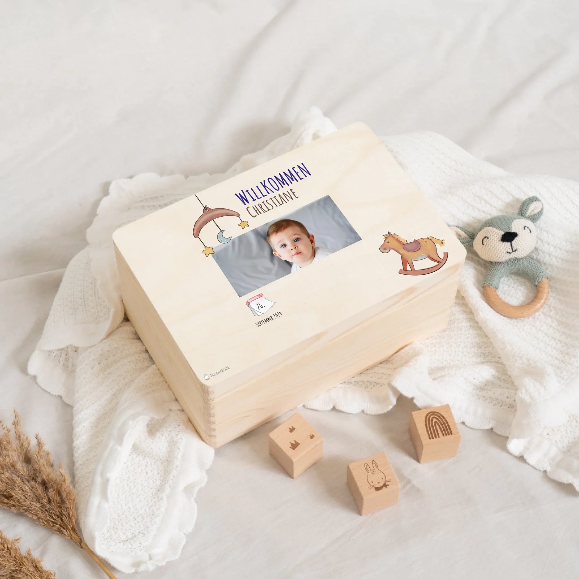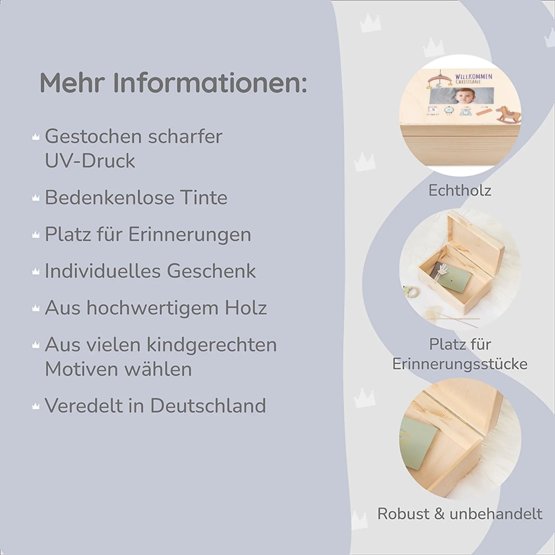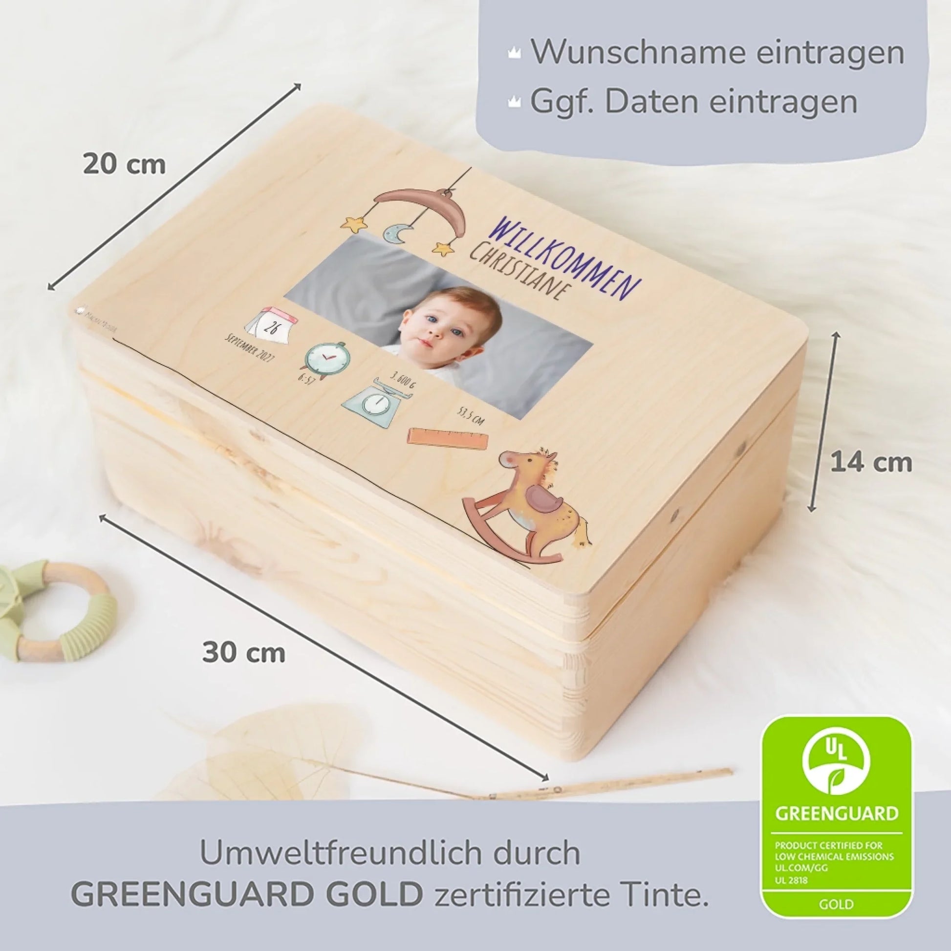 Personalisierung: Verleihen Sie der Erinnerungskiste eine persönliche Note, indem Sie den Namen und die Geburtsdaten des Kindes aufdrucken lassen. Dies macht die Kiste zu einem einzigartigen Andenken, das ein Leben lang geschätzt wird.