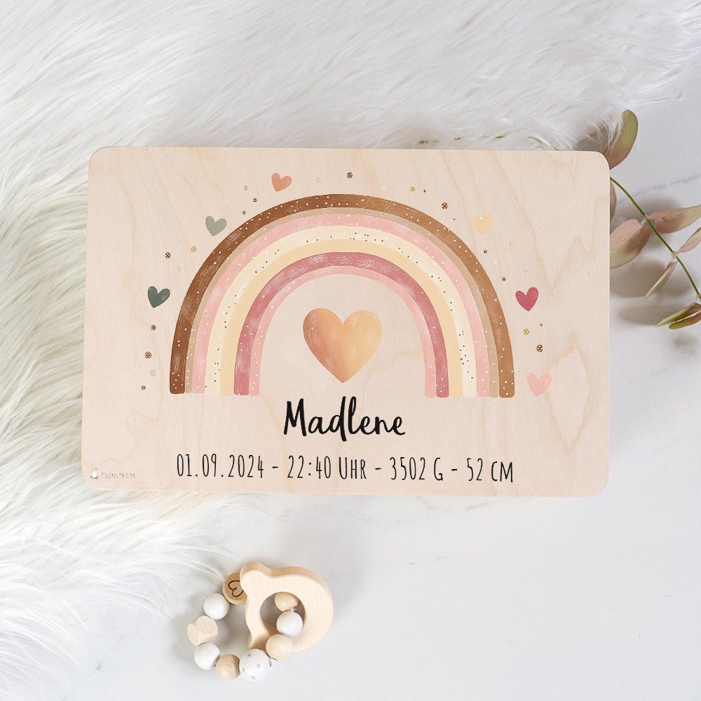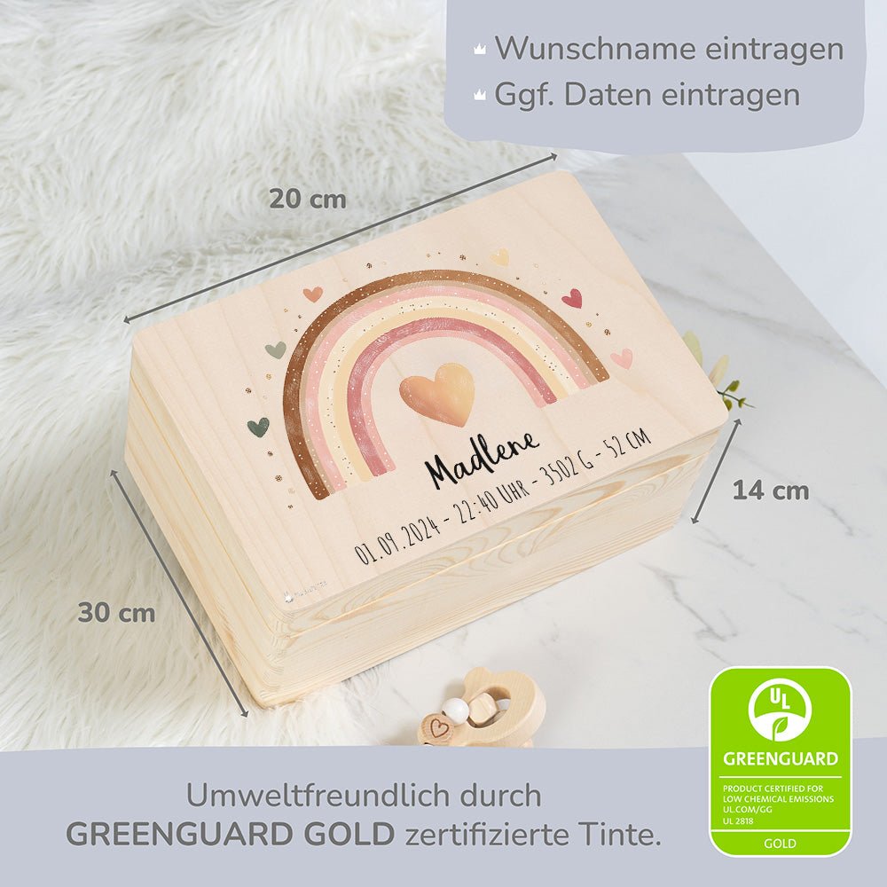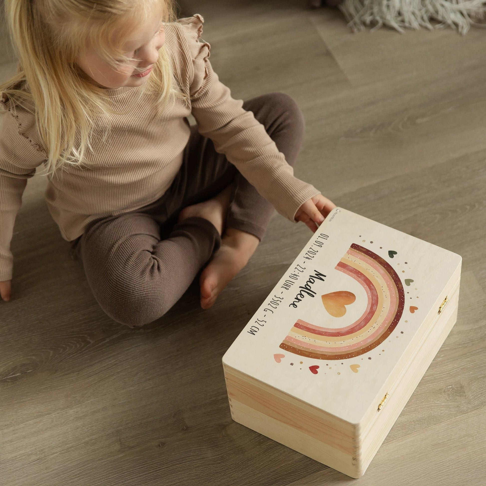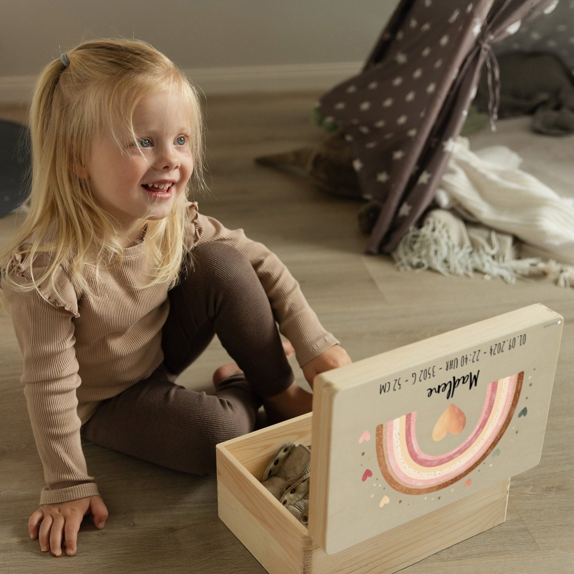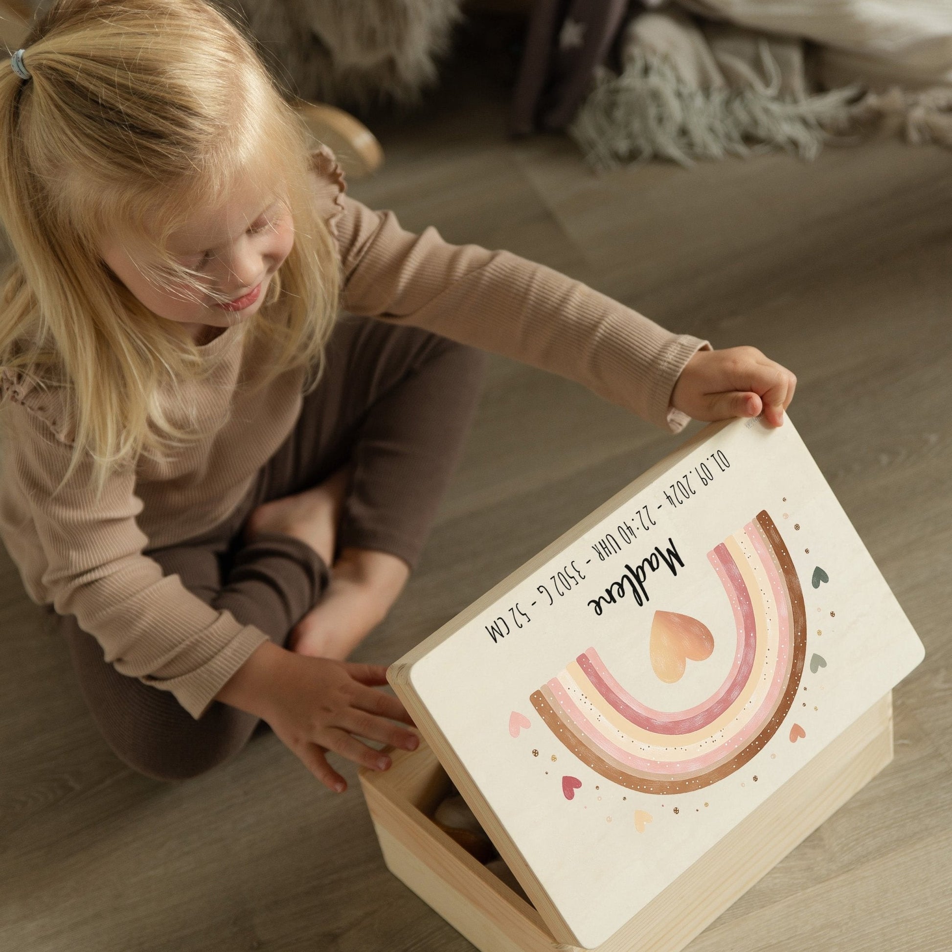 Personalisierung: Der zarte Regenbogen mit niedlichen Herzen in sanften Pastell-Rosatönen wirkt beruhigend und liebevoll zugleich. Und weil jedes Kind einzigartig ist, wird die Box mit Name, Geburtsdatum, Größe und Gewicht ganz persönlich per hochwertigem UV-Druck gestaltet.