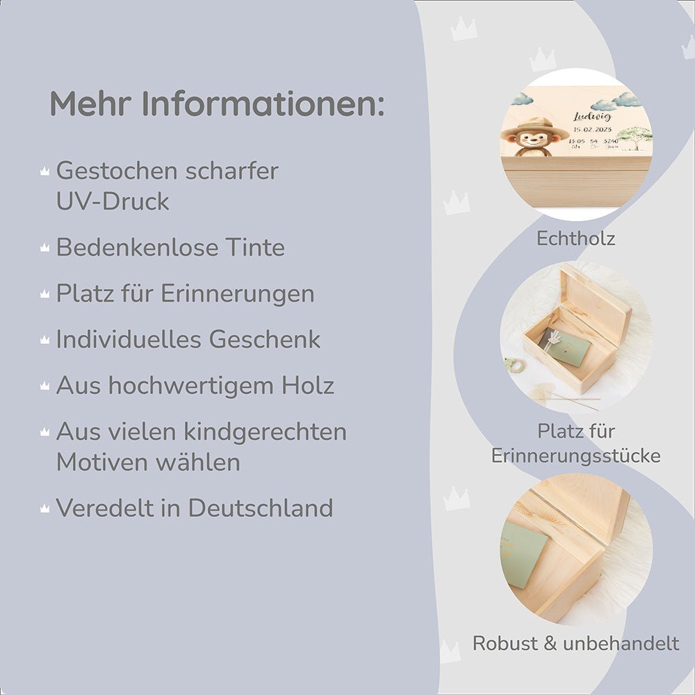 Die Ideale Erinnerungskiste zur Geburt. Unsere personalisierte Erinnerungskiste aus Holz ist die ideale Wahl. Mit großzügigen Maßen von 30x20x14cm bietet diese liebevoll gestaltete Kiste ausreichend Platz für die Aufbewahrung von Fotos, der ersten Schuhe, des ersten Schnullers, Erinnerungsstücken und anderen kostbaren Gegenständen, die die ersten Lebensmomente deines kleinen Schatzes begleiten.