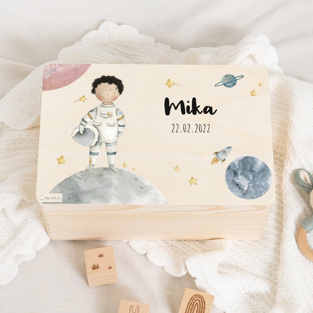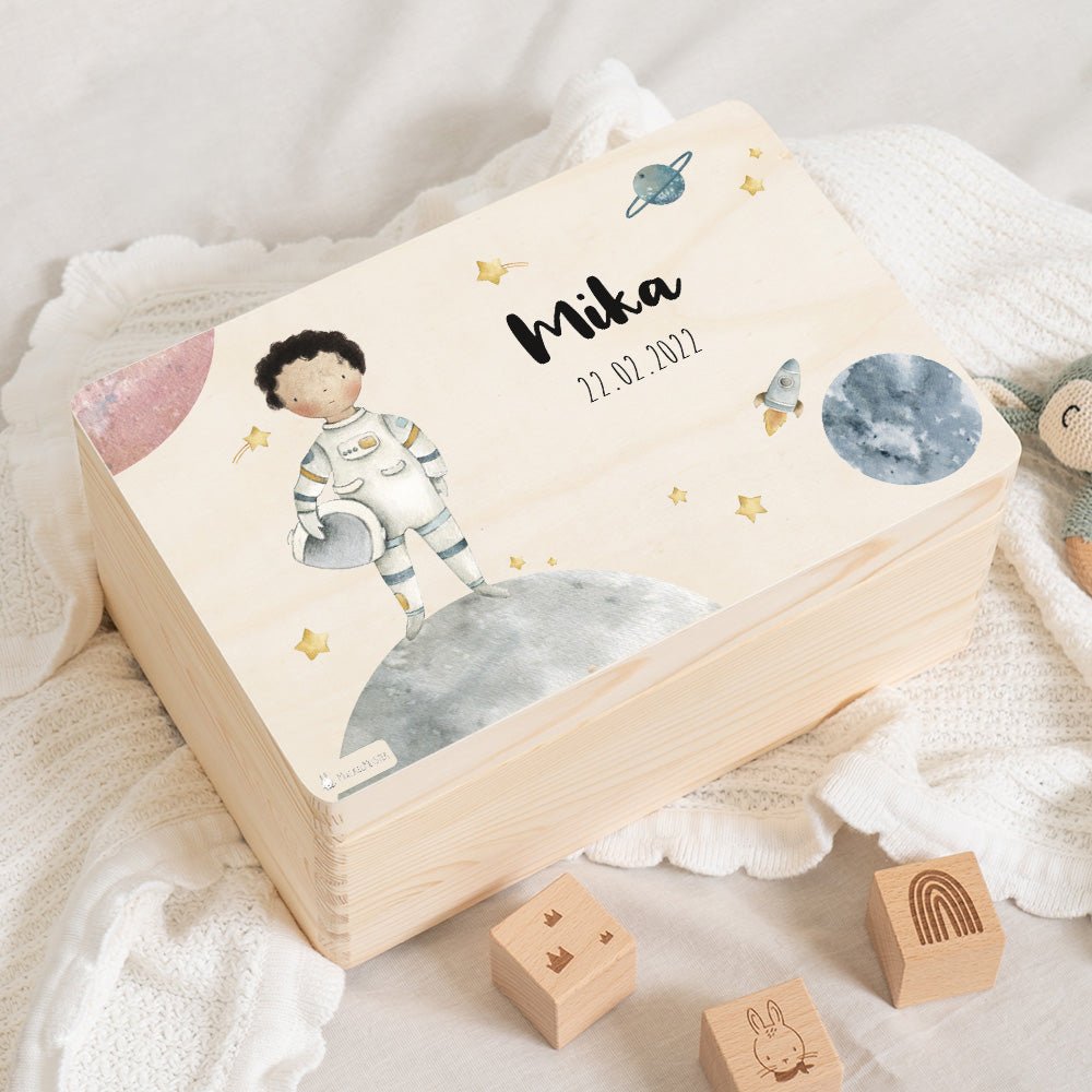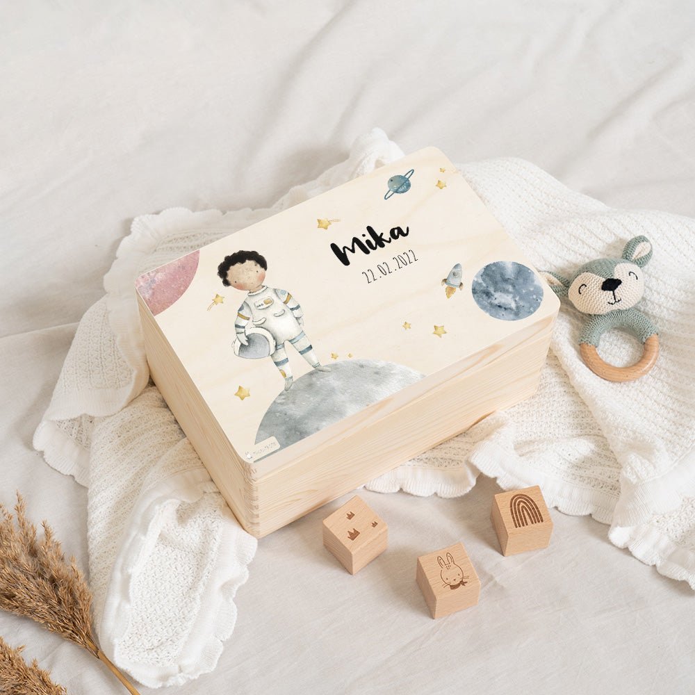 Begib dich auf eine Reise zu den Sternen und halte die galaktischen Erlebnisse deines kleinen Astronauten mit unserer Erinnerungsbox mit Astronautenmotiv für die Ewigkeit fest!