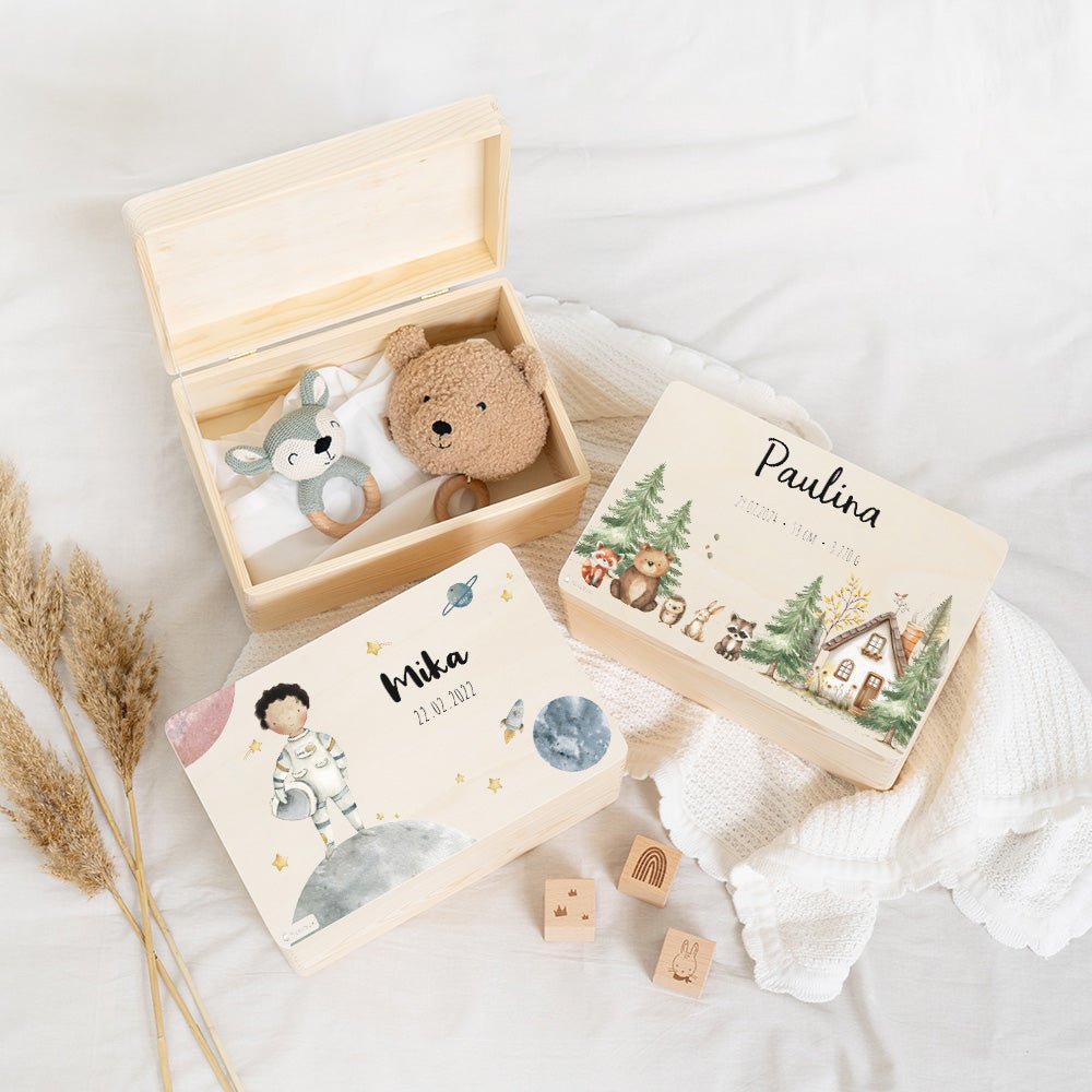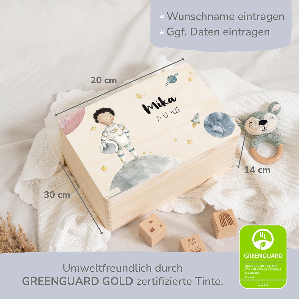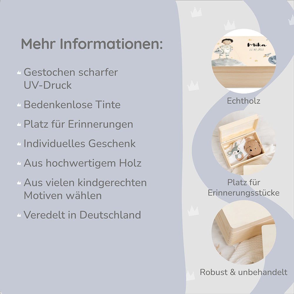 Hochwertiges Holz: Hergestellt aus robustem und langlebigem Holz, bietet unsere Erinnerungsbox eine sichere und stilvolle Aufbewahrungslösung für die kostbaren Erinnerungen an die Weltraumabenteuer deines kleinen Astronauten.