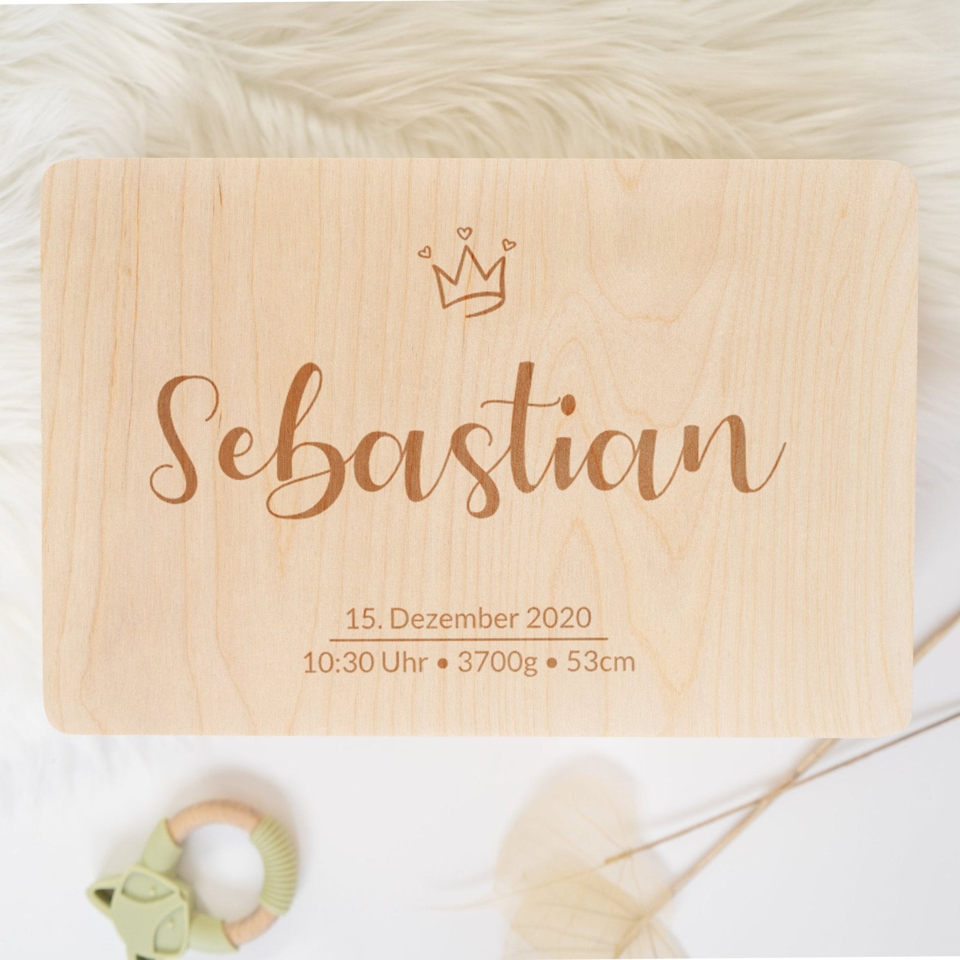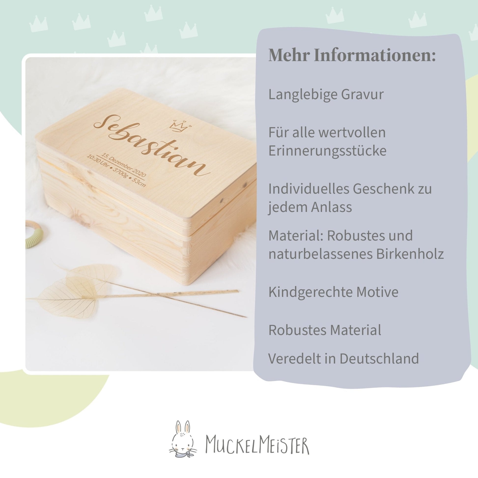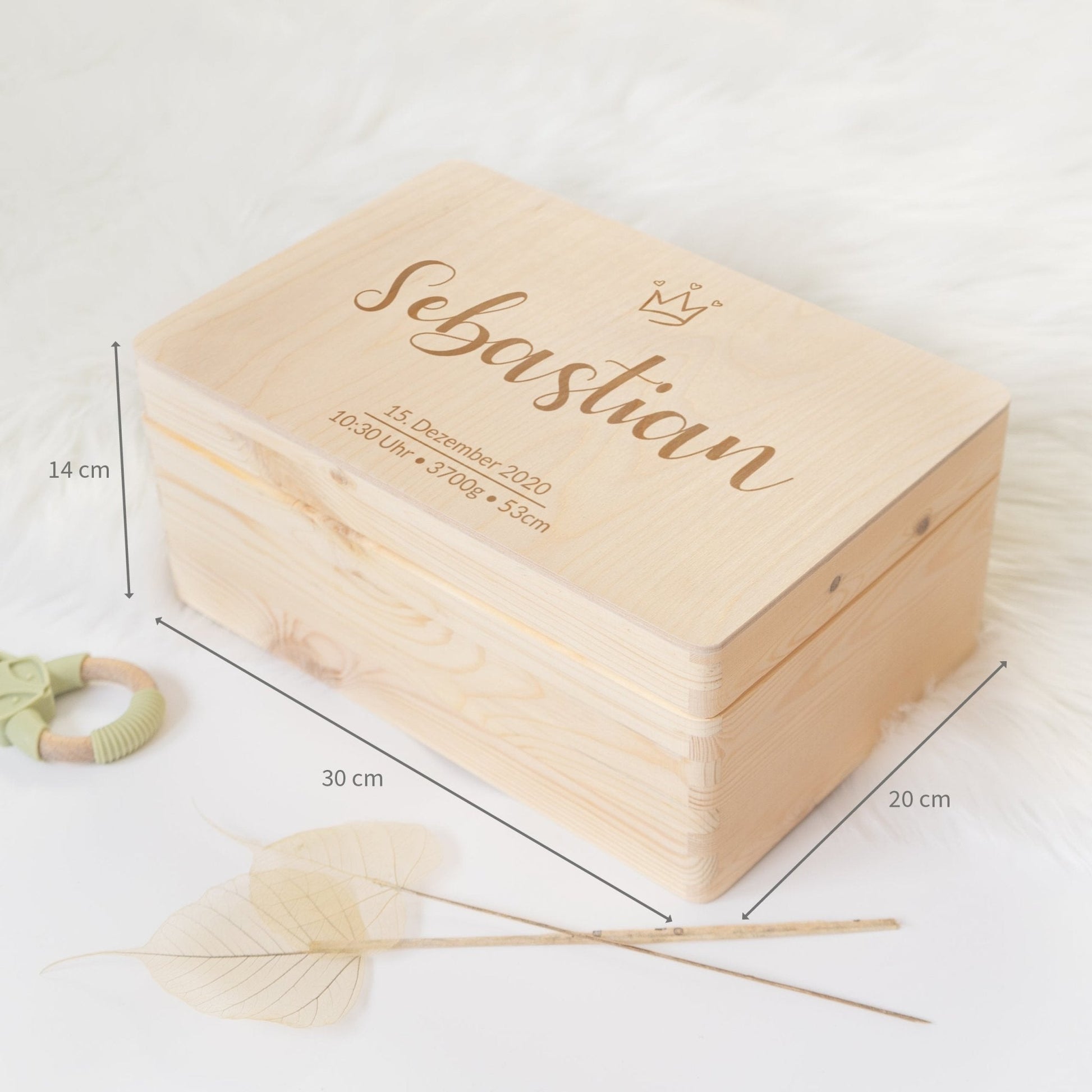 Individuelle Namensgravur: Personalisiere die Kiste mit einer individuellen Gravur, Name, Geburtsdatum, Geburtsgewicht, Größe und Uhrzeit der Geburt. Für eine einzigartige Erinnerung.