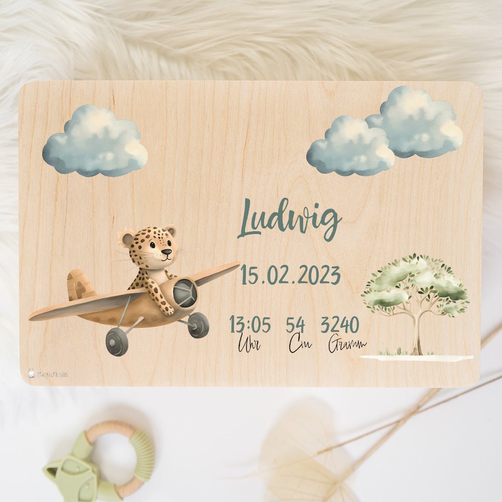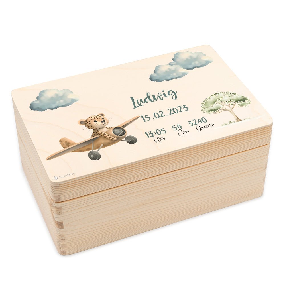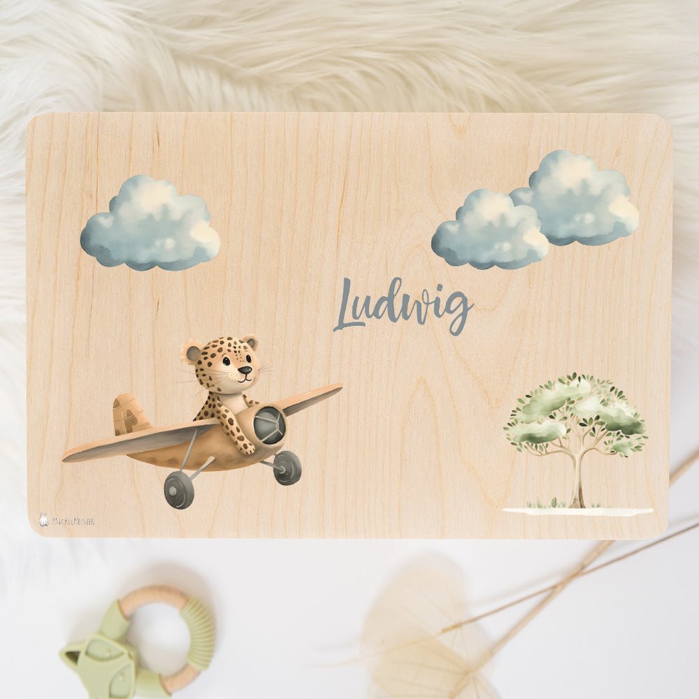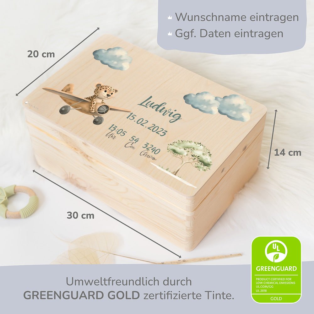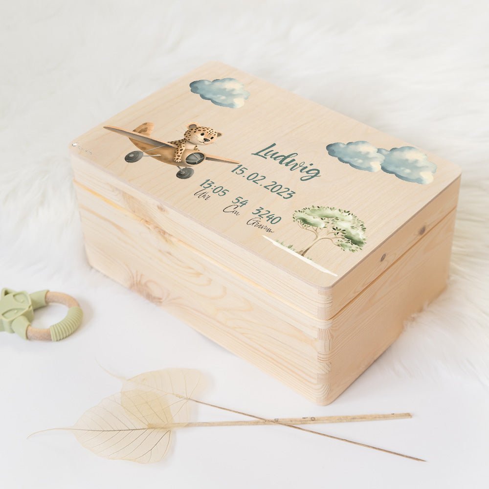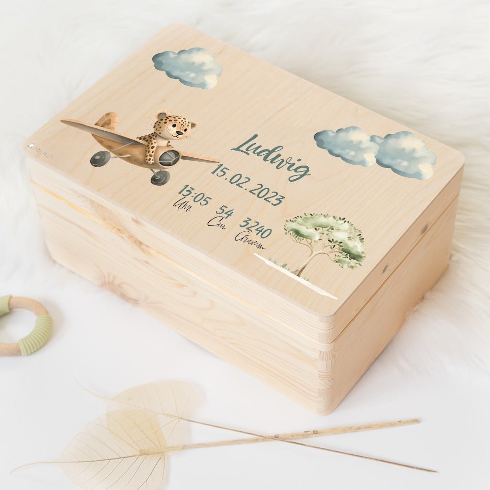 Leopard im Flugzeug Motiv: Das Herzstück dieser Kiste ist der individuelle Druck, der einen majestätischen Leoparden im Flugzeug zeigt. Mit diesem Motiv taucht das Kind in hohe und weite Welt der Lüfte ein.
