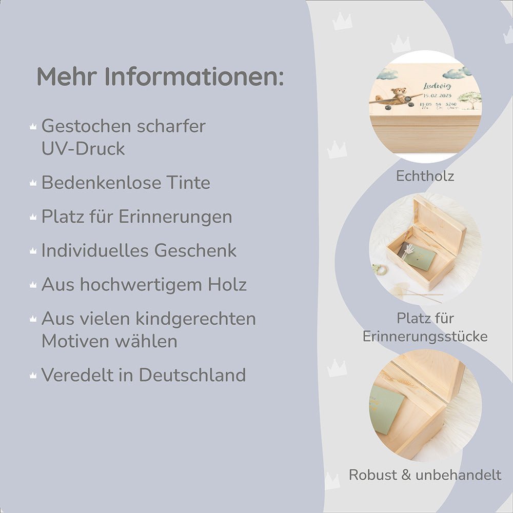 Hochwertiges Holz: Hergestellt aus hochwertiger und langlebiger Fichte und einem Deckel aus Birke, bietet unsere Erinnerungskiste eine stabile und sichere Aufbewahrungslösung für die wertvollen Erinnerungen an die Geburt des Kindes.