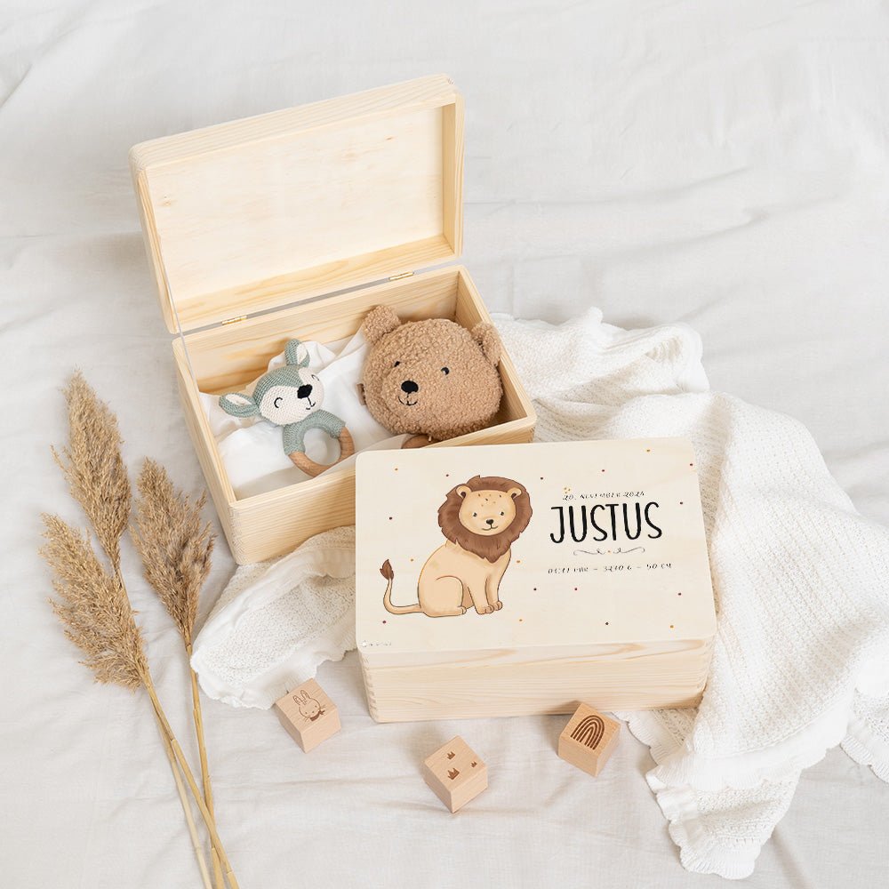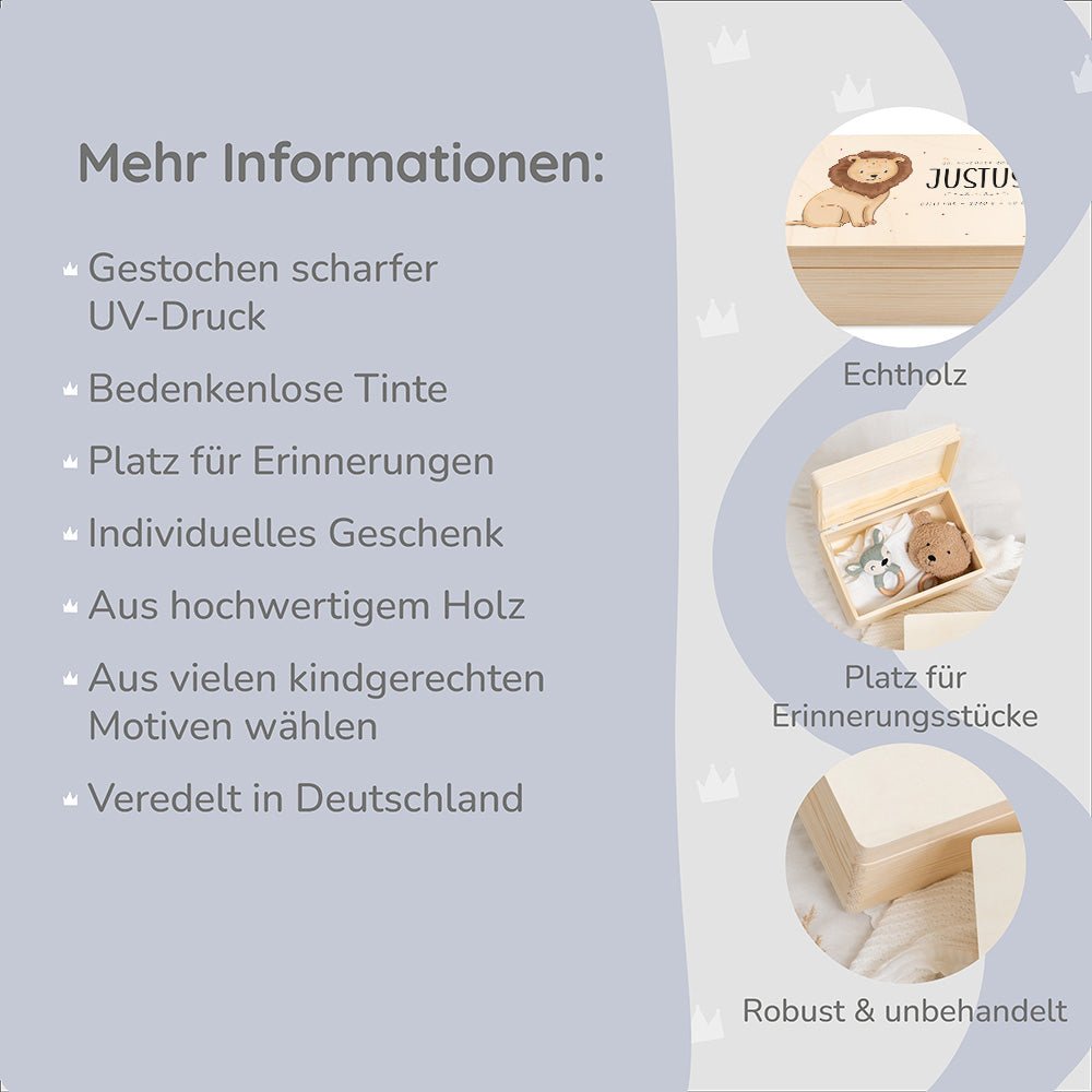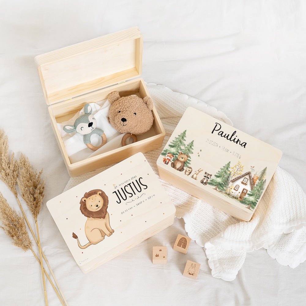 Personalisierung: Verleihen Sie der Erinnerungskiste eine persönliche Note, indem Sie den Namen und die Geburtsdaten des Kindes aufdrucken lassen. Dies macht die Kiste zu einem einzigartigen Andenken, das ein Leben lang geschätzt wird.