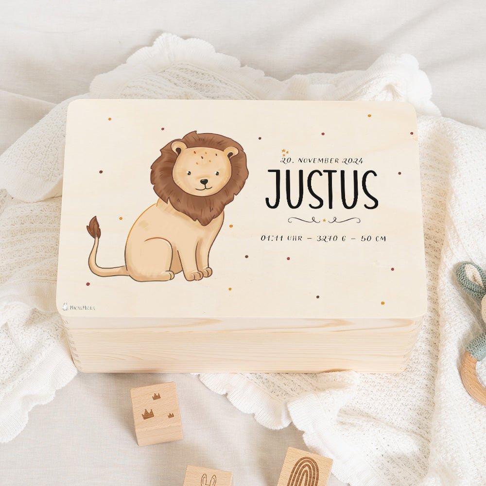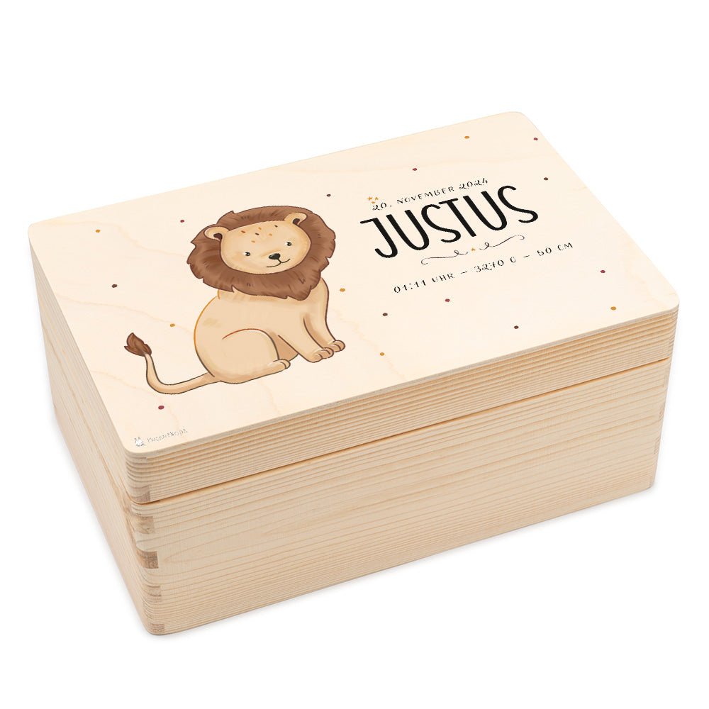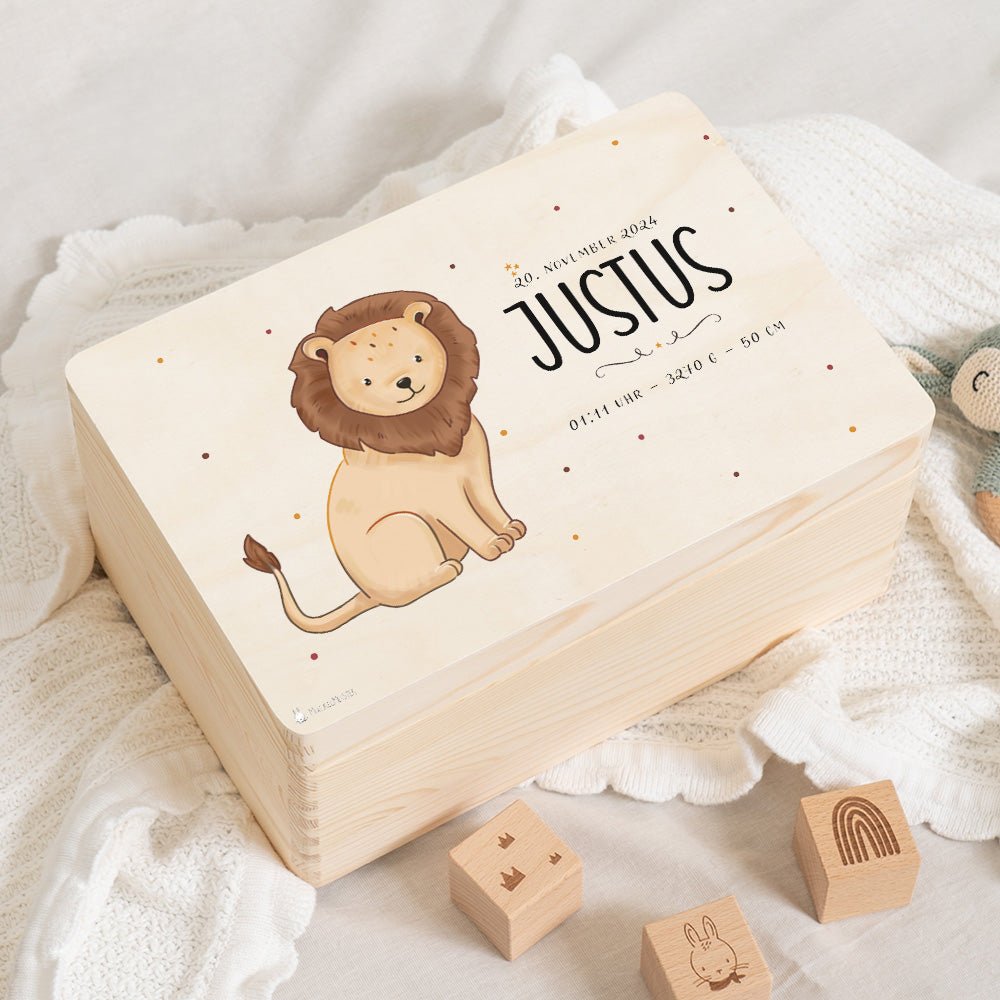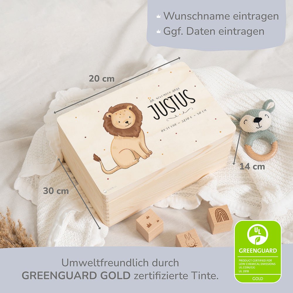 Personalisierung: Verleihen Sie der Erinnerungskiste eine persönliche Note, indem Sie den Namen und die Geburtsdaten des Kindes aufdrucken lassen. Dies macht die Kiste zu einem einzigartigen Andenken, das ein Leben lang geschätzt wird.