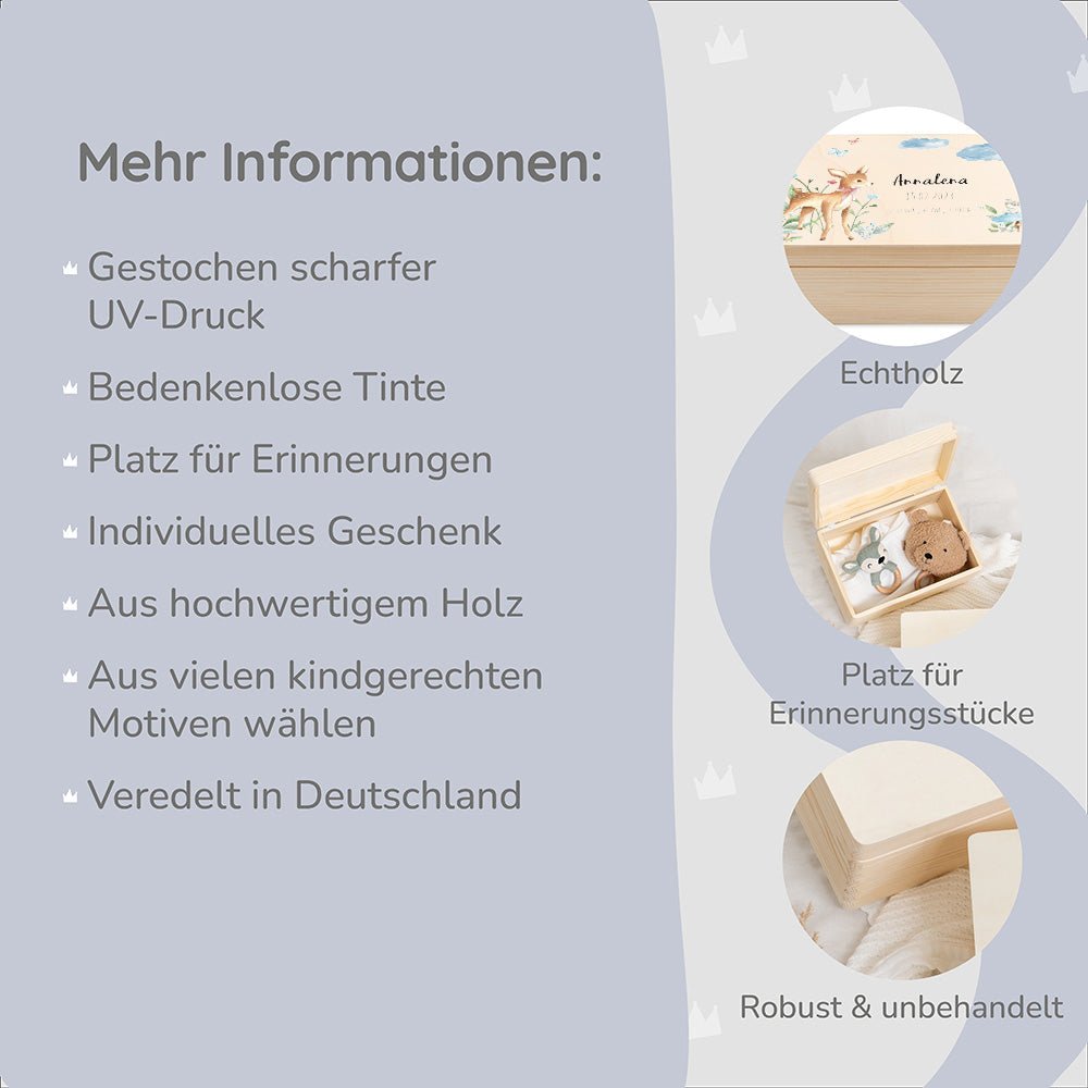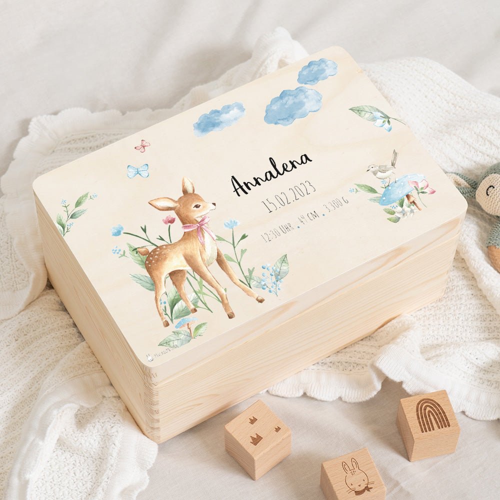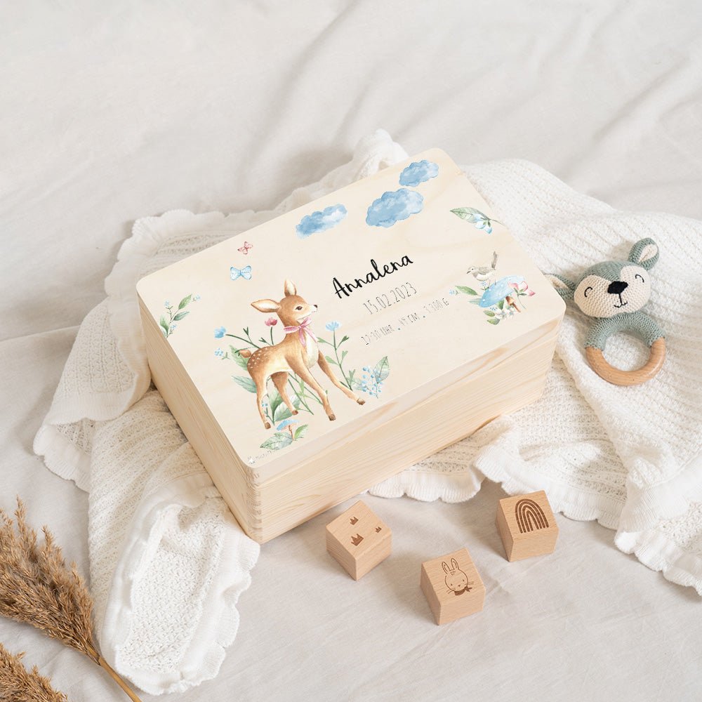 Bewege dich durch die Zeit und die Erinnerungen deines Kindes mit unserer Erinnerungsbox mit Reh Motiv, einer zeitlosen Schatztruhe für kostbare Momente und besondere Erlebnisse!