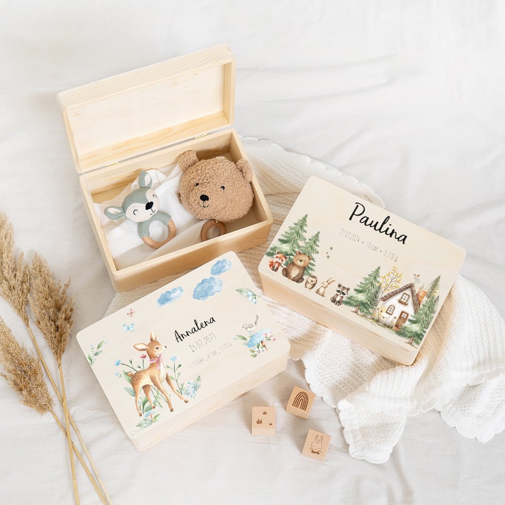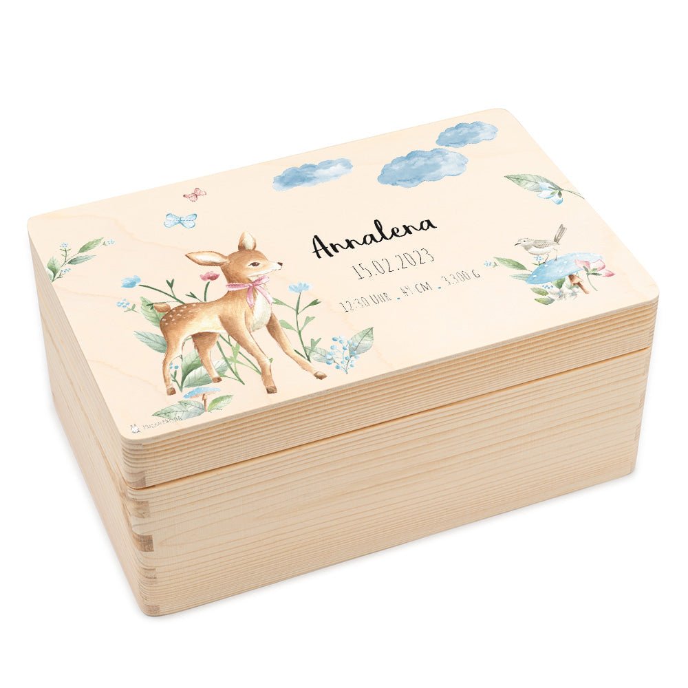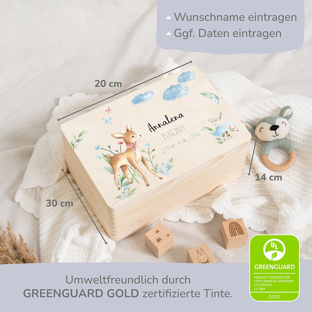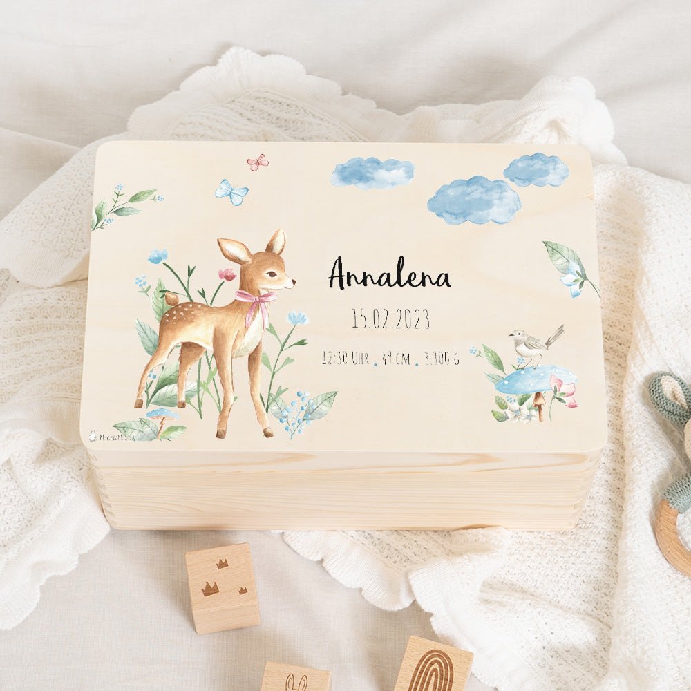 Bewege dich durch die Zeit und die Erinnerungen deines Kindes mit unserer Erinnerungsbox mit Reh Motiv, einer zeitlosen Schatztruhe für kostbare Momente und besondere Erlebnisse!
