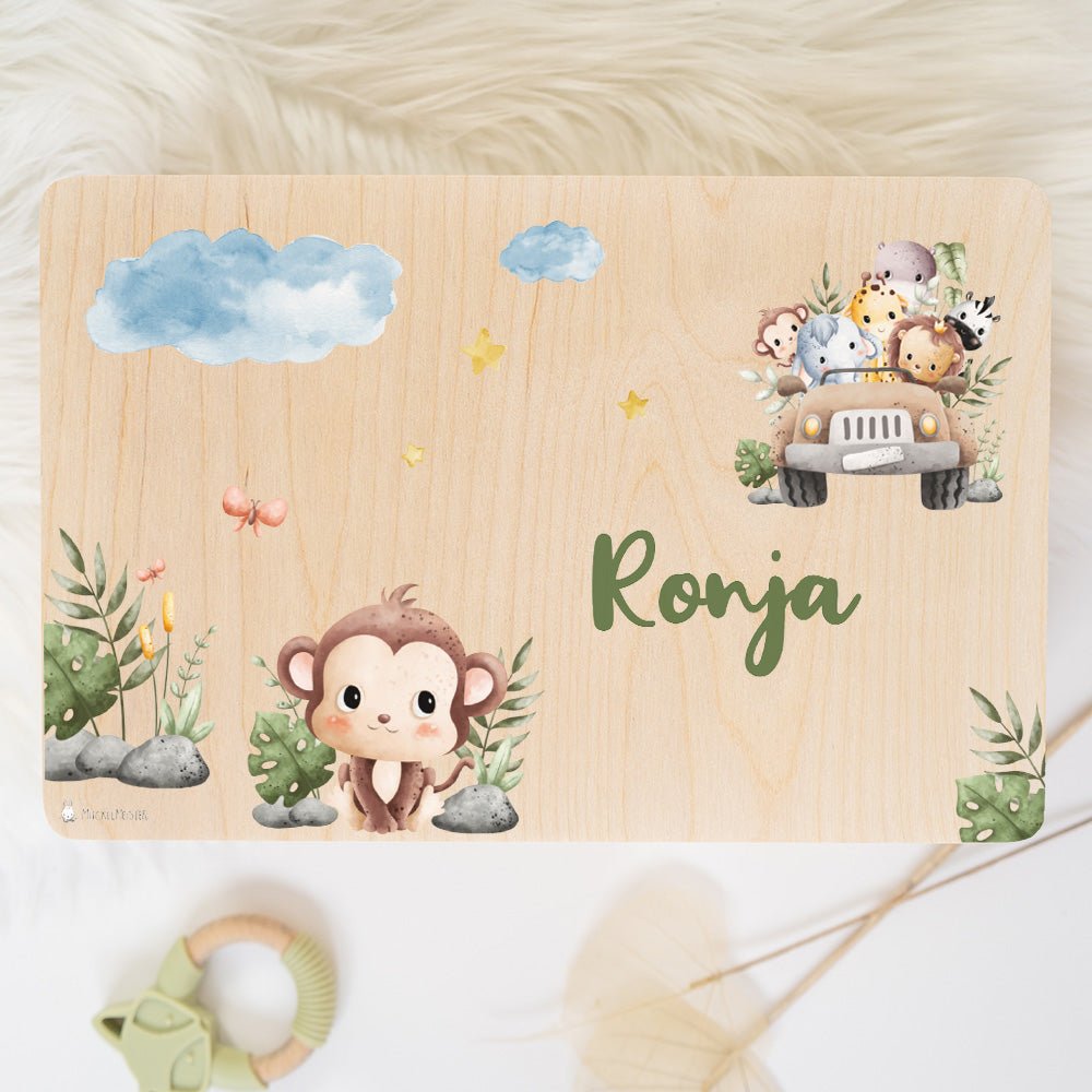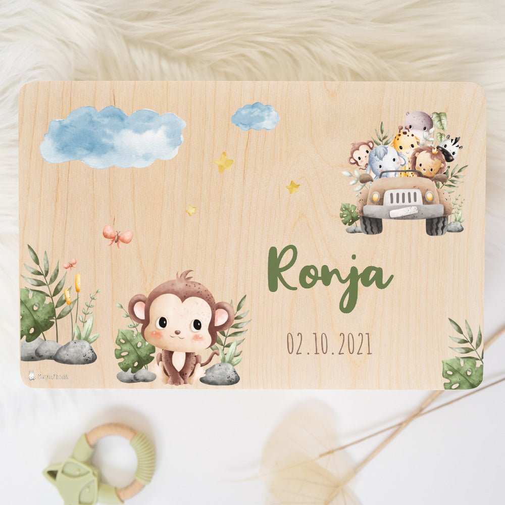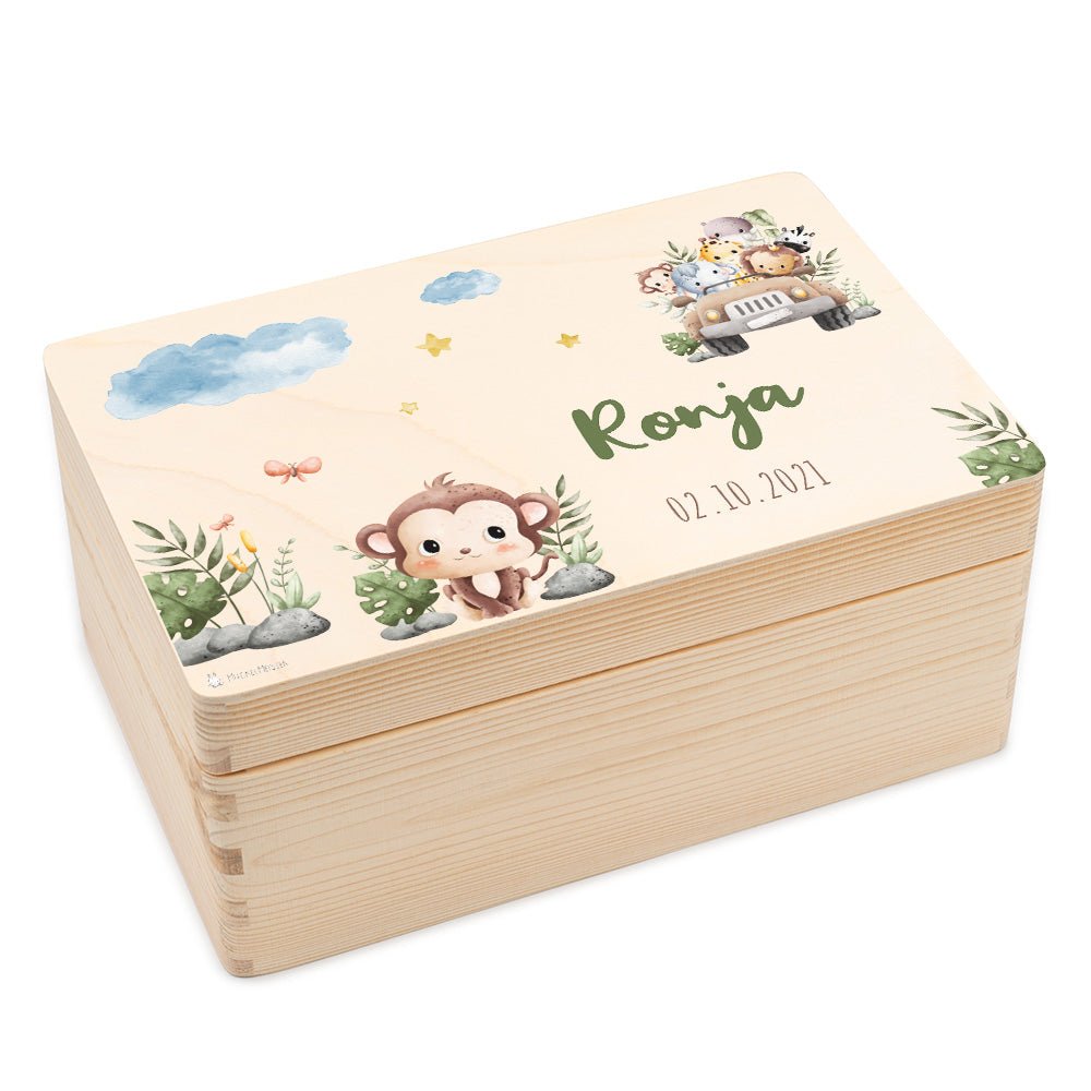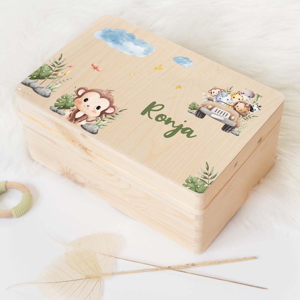 Möchtest du die Abenteuer und Erlebnisse deines kleinen Entdeckers stilvoll festhalten? Unsere 30x20x14cm große Erinnerungsbox aus Holz mit einem Safari Motiv ist die ideale Lösung! Diese liebevoll gestaltete Box bietet ausreichend Platz, um die aufregenden Safari-Erinnerungen deines Kindes sicher aufzubewahren und stilvoll zu präsentieren.