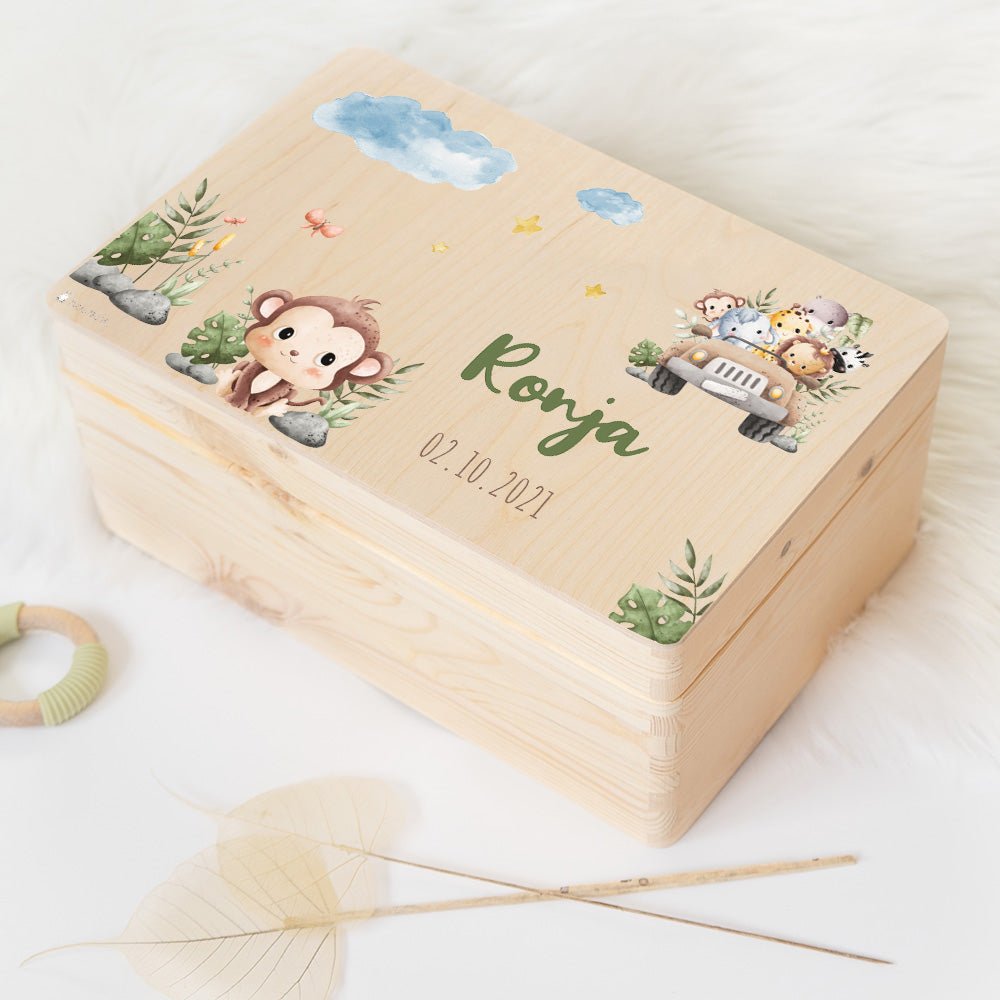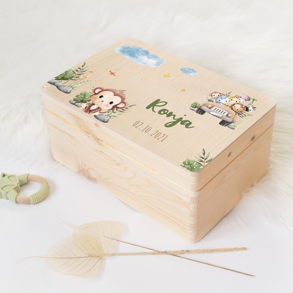 Begib dich auf eine Safari der Erinnerungen mit unserer Erinnerungsbox mit Safari Motiv, einem zeitlosen Schatz für die aufregendsten Momente und Abenteuer deines kleinen Entdeckers!