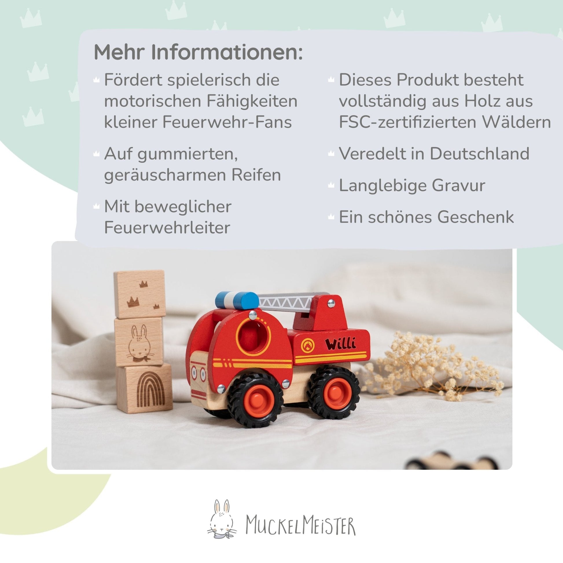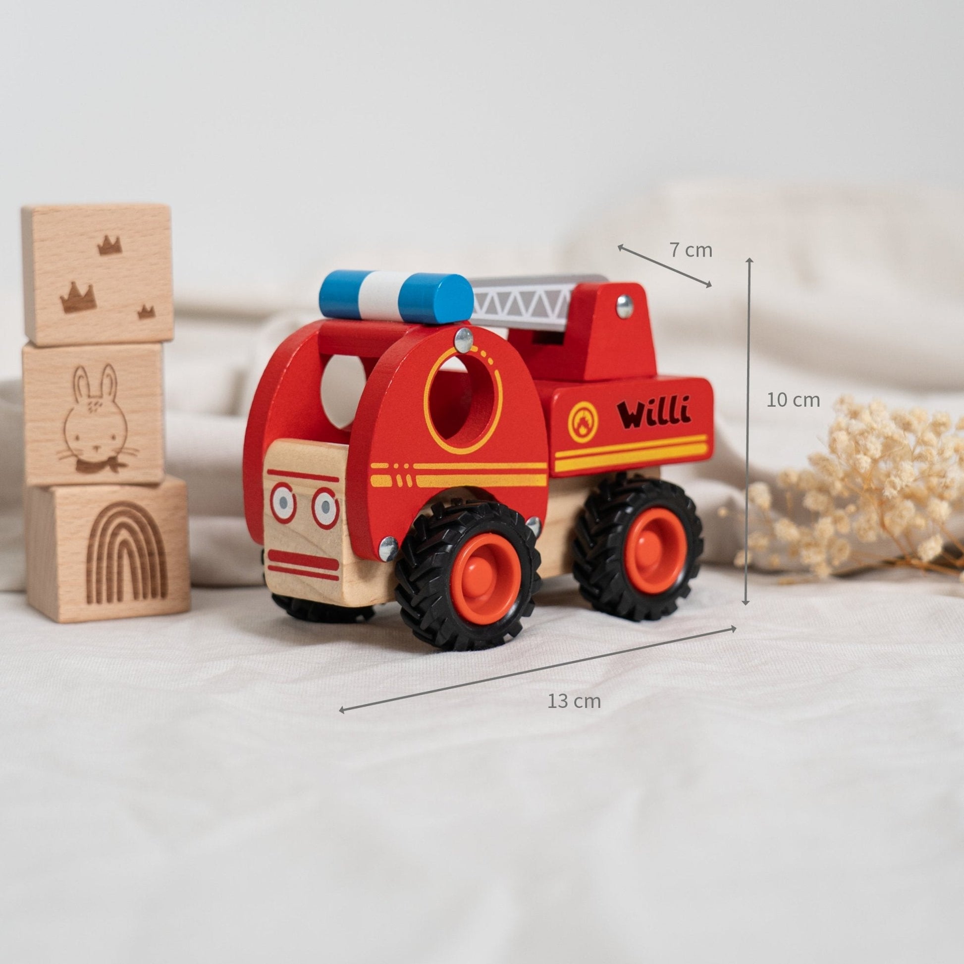 Mit dem Feuerwehrfahrzeug aus Holz schenken Sie nicht nur ein sicheres und langlebiges Spielzeug, sondern auch ein treues Begleiter für mutige Abenteuer und heldenhafte Einsätze im Kinderzimmer.