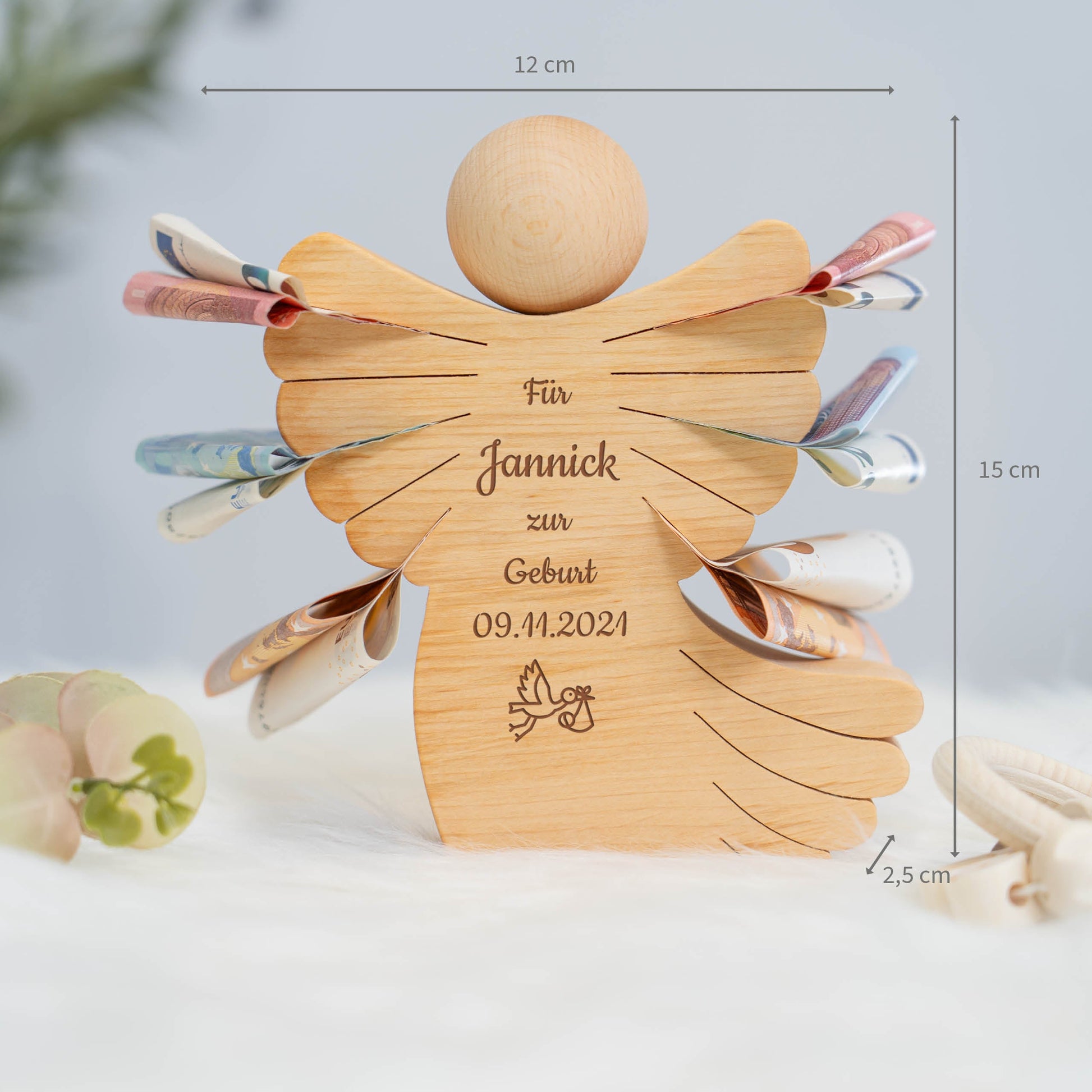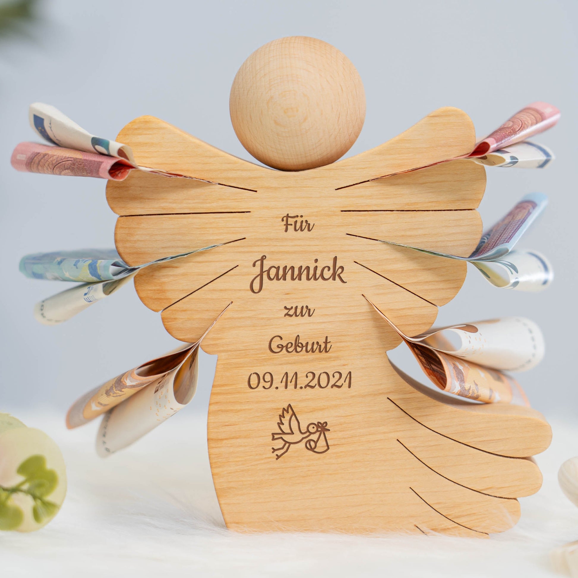 Geldscheinengel mit Gravur zur Geburt