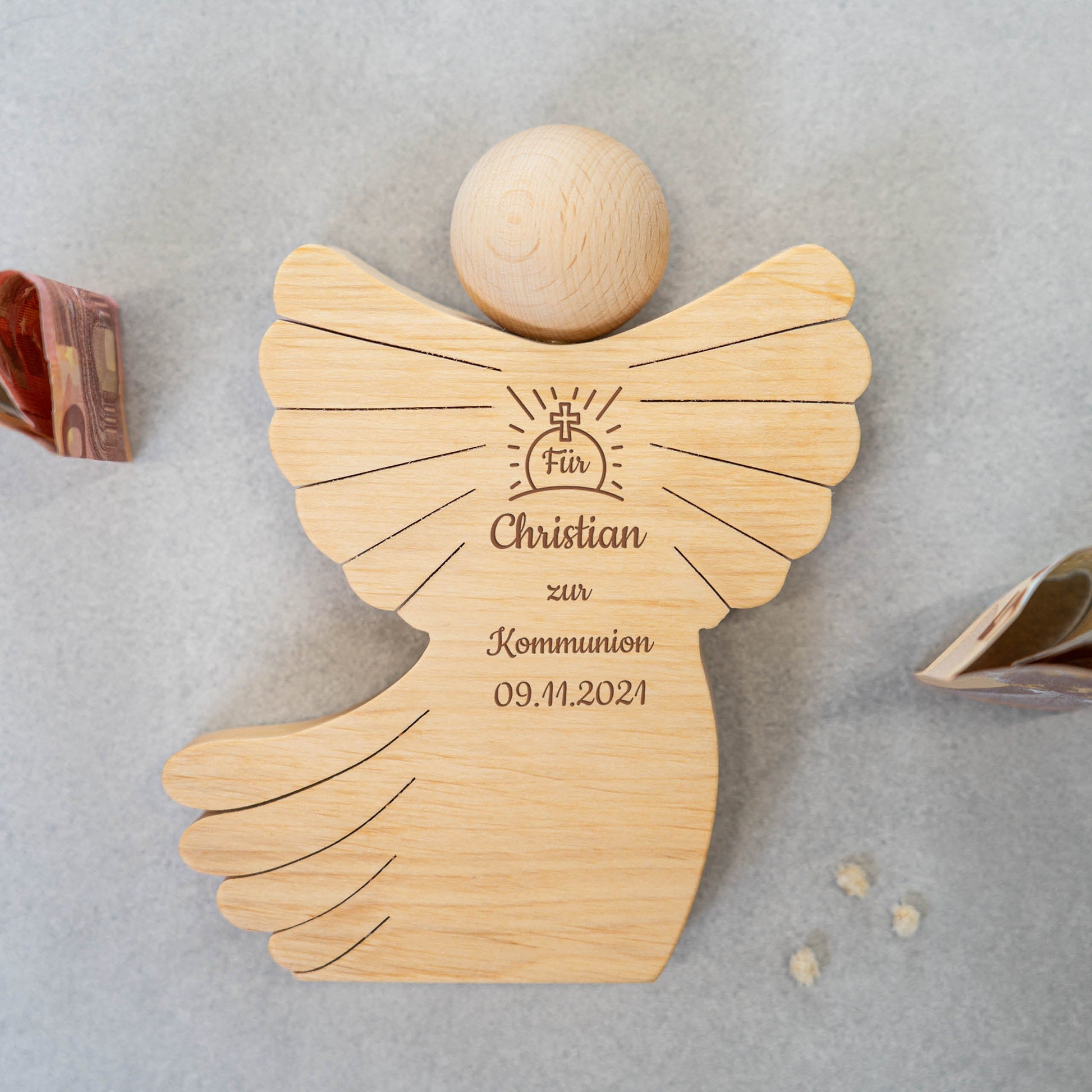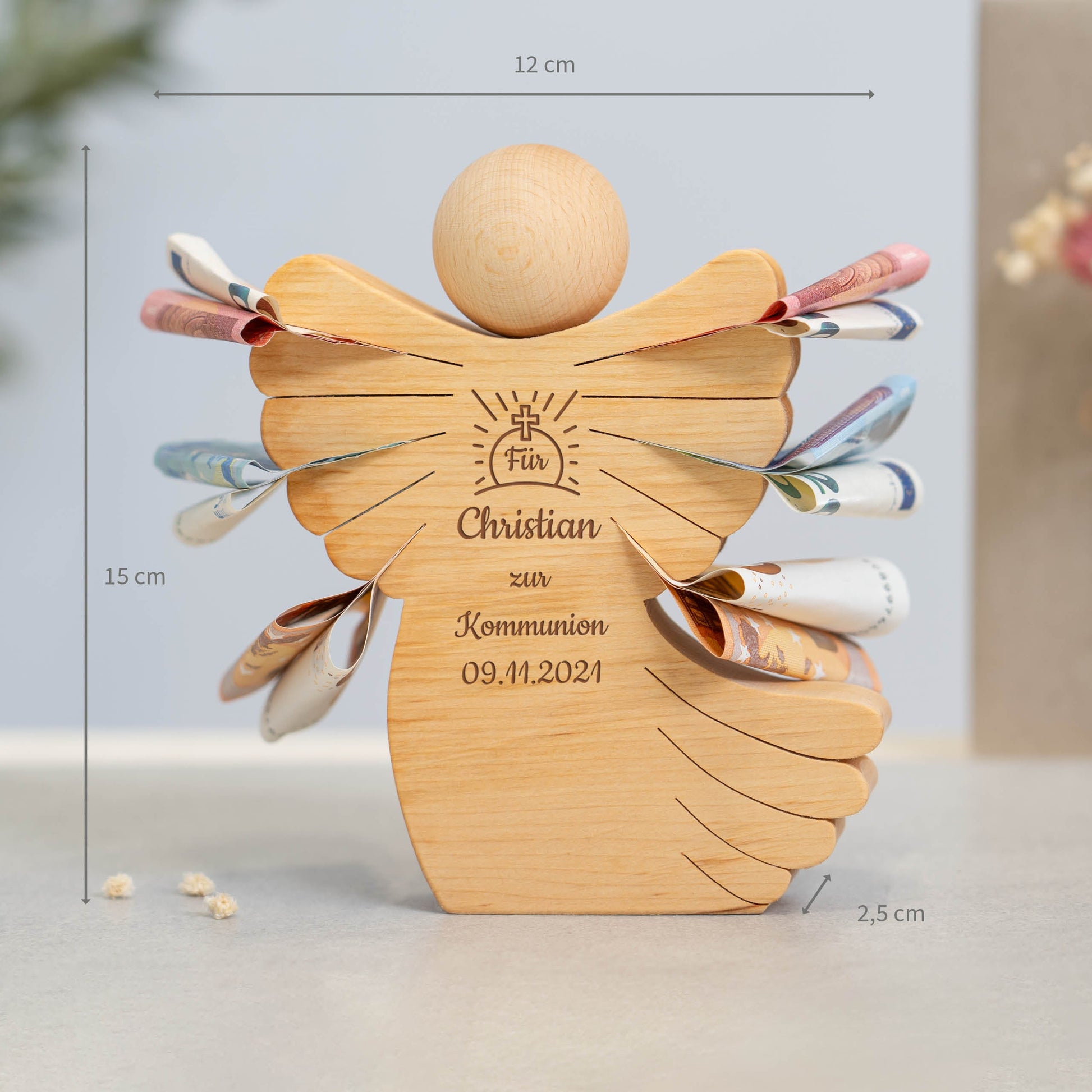 Unser handgefertigter Geldscheinengel aus geöltem Erleholz ist das ideale Geschenk zur Kommunion. Mit einer Größe von 15,5 x 12 x 2,5 cm ist er ein dekoratives und gleichzeitig persönliches Geschenk. Der Engel kann mit einer Lasergravur personalisiert werden, die den Namen des Kommunionskindes und das Datum der Kommunion umfasst. Ein besonderes Andenken an diesen bedeutenden Tag.