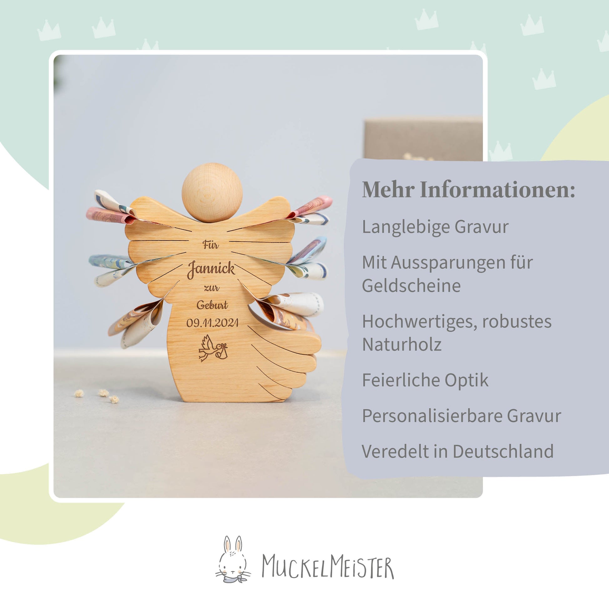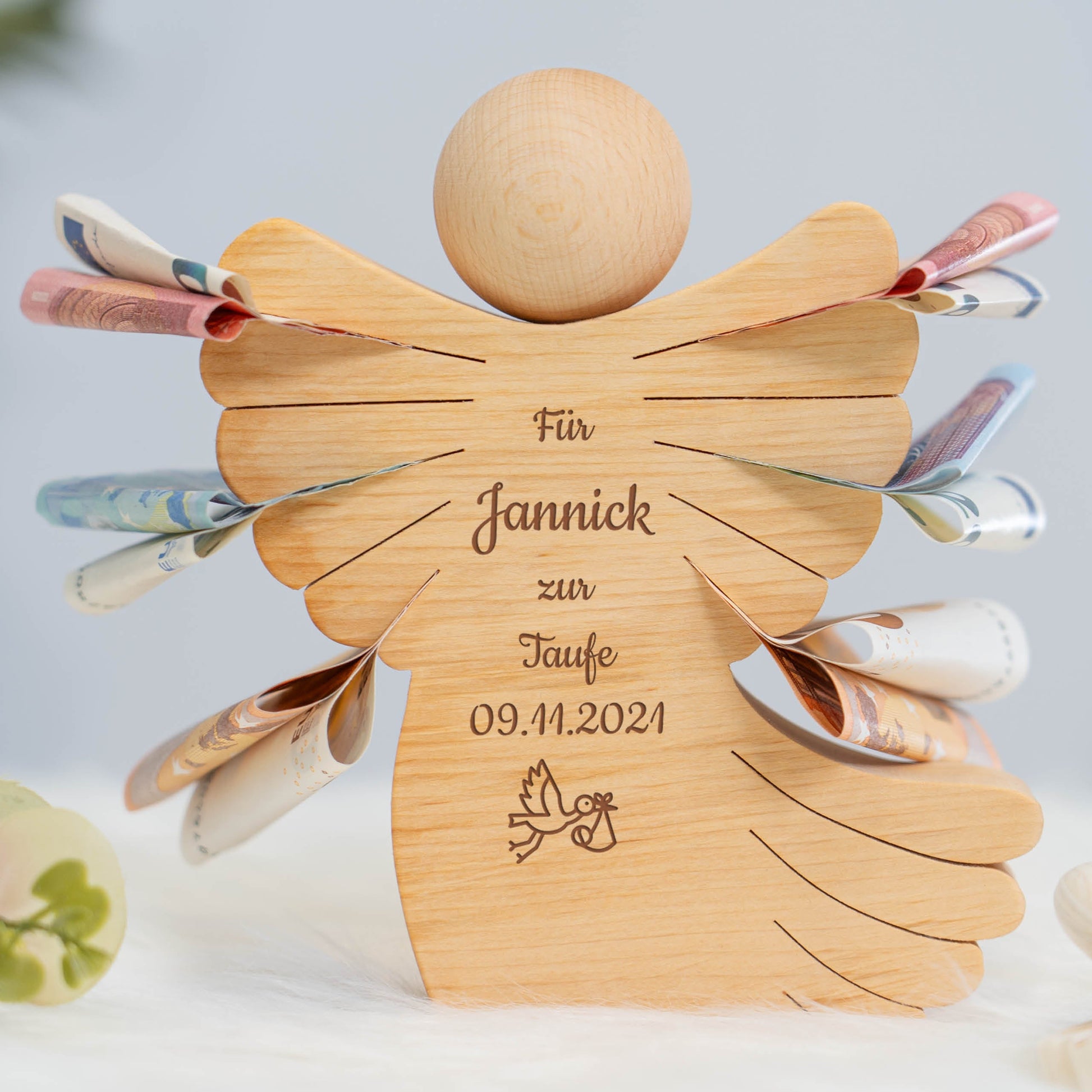 Mit diesem Produkt kombinieren wir traditionelle Handwerkskunst mit moderner Lasergravurtechnologie, um ein persönliches und bleibendes Geschenk für besondere Anlässe zu schaffen. Mit unserem süßen Geldscheinengel wird jedes Geldgeschenk zu einem unvergesslichen Highlight zur Taufe.