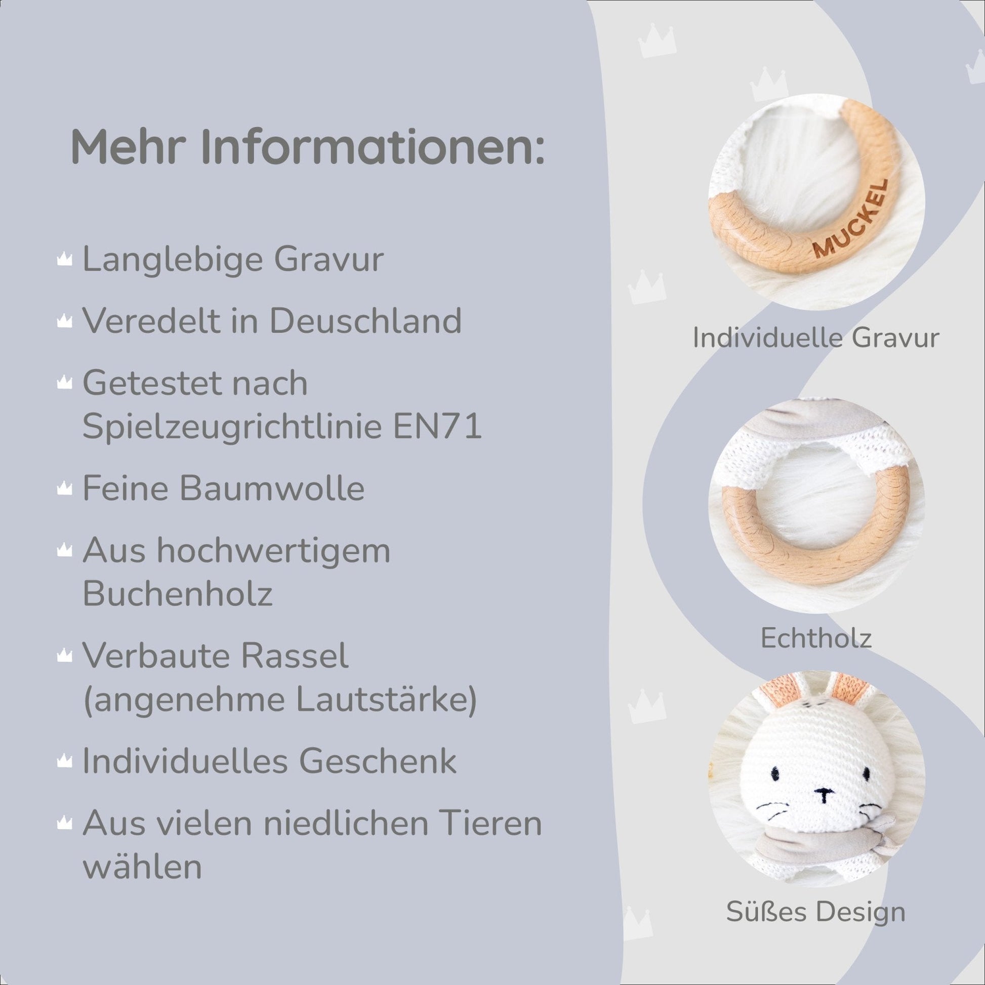 Entdecken Sie unseren liebevoll handgefertigten Greifling im niedlichen Muckelmeister-Hasen-Design, der nicht nur ein echter Hingucker, sondern auch ein vielseitiger Begleiter für die Kleinsten ist.