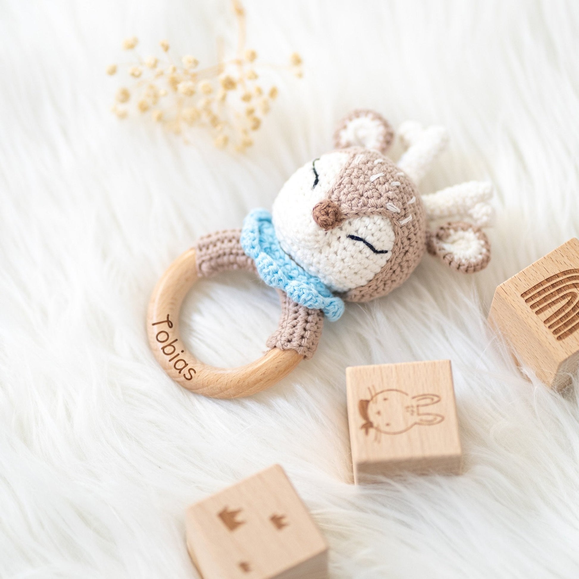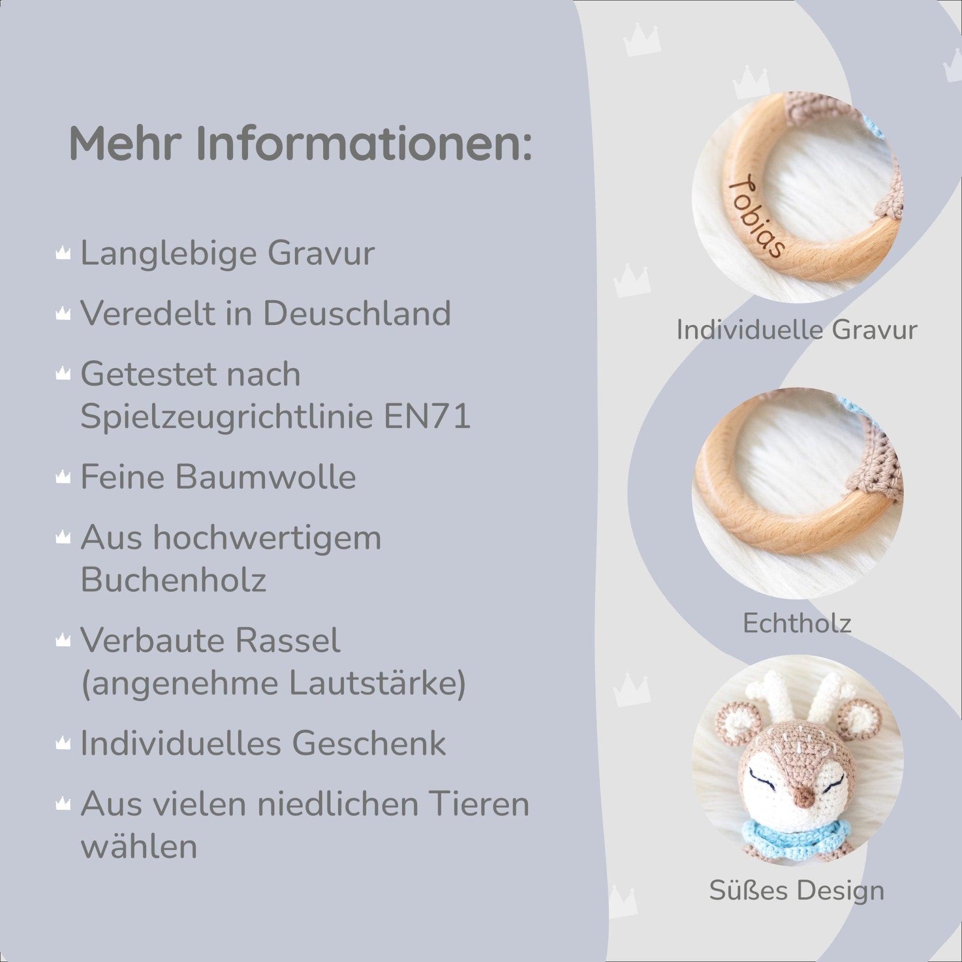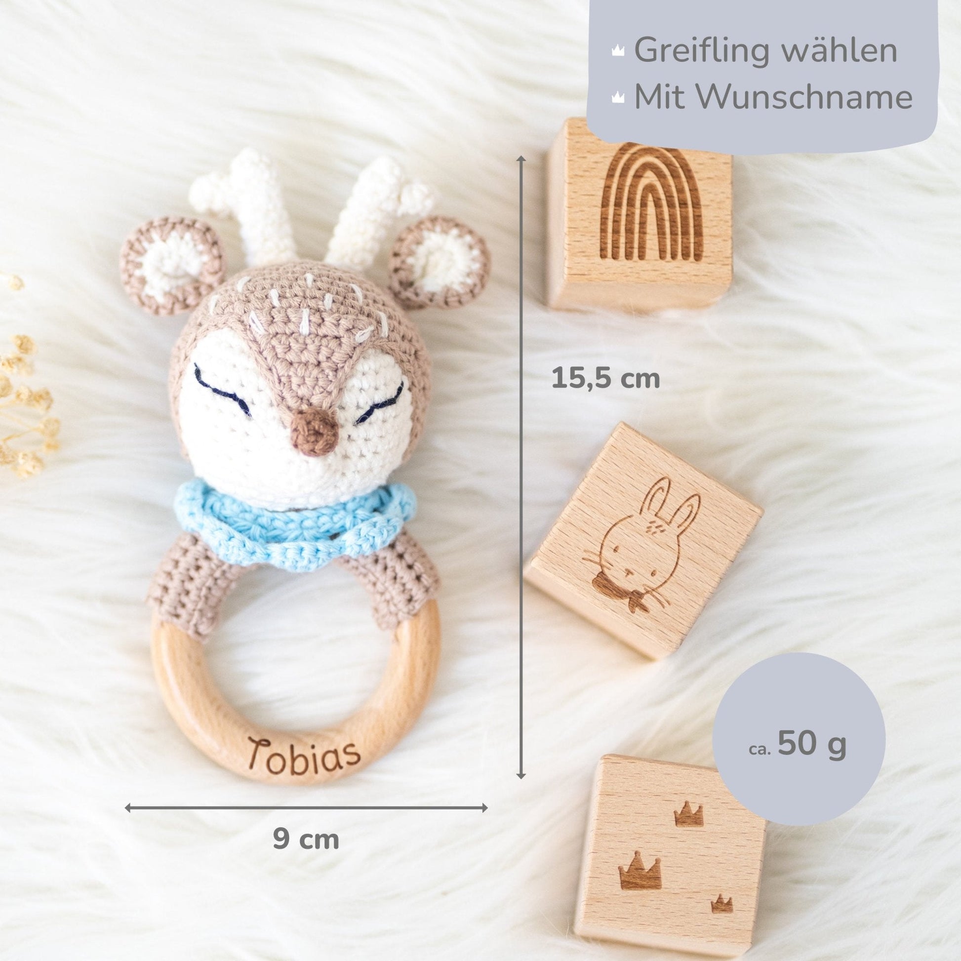 Personalisierter Greifling im Reh-Design mit blauem Schal – Perfekt für kleine Entdecker!