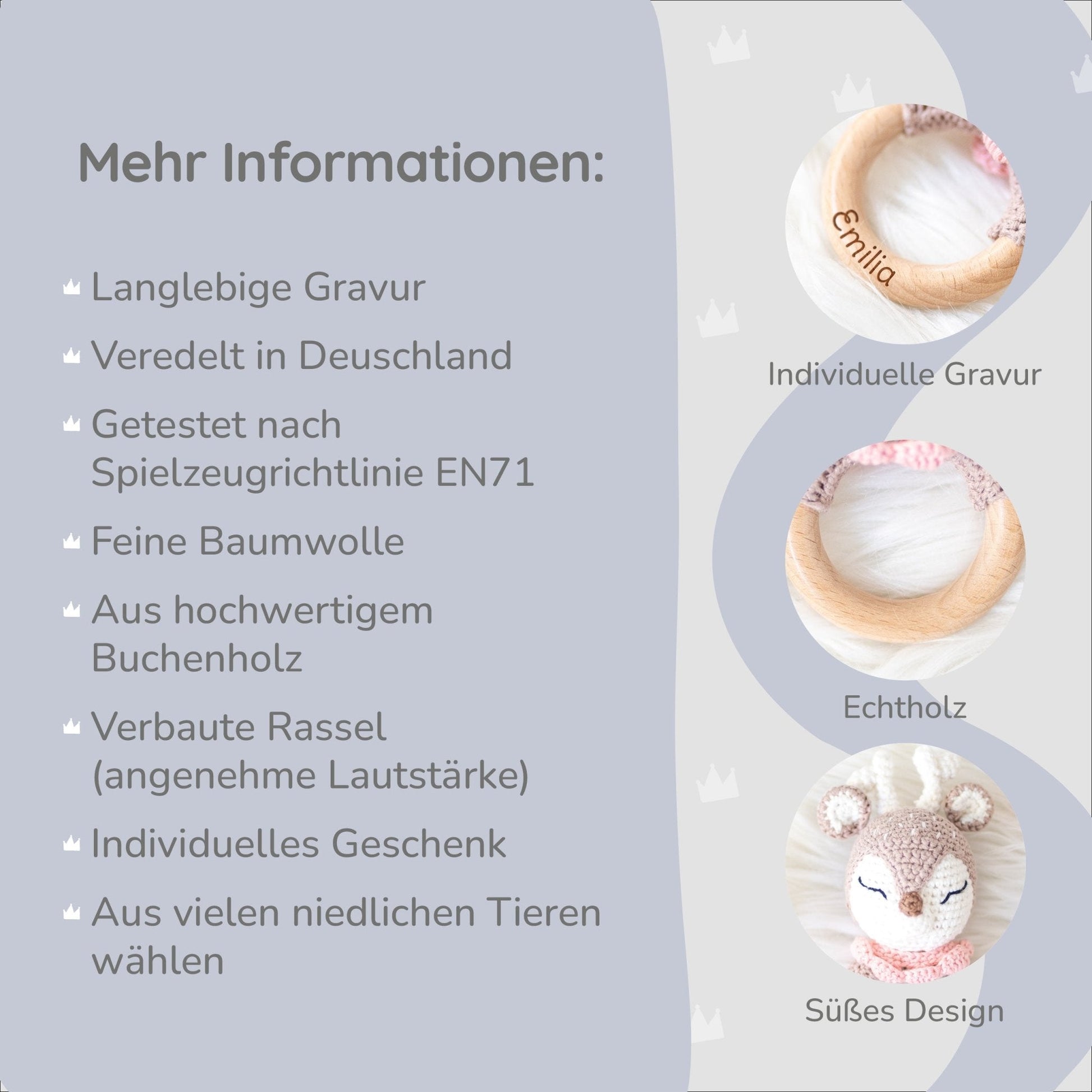Entdecken Sie unseren liebevoll handgefertigten Greifling im niedlichen Reh-Design mit einem charmanten rosa Schal, der nicht nur ein echter Hingucker, sondern auch ein vielseitiger Begleiter für die Kleinsten ist.