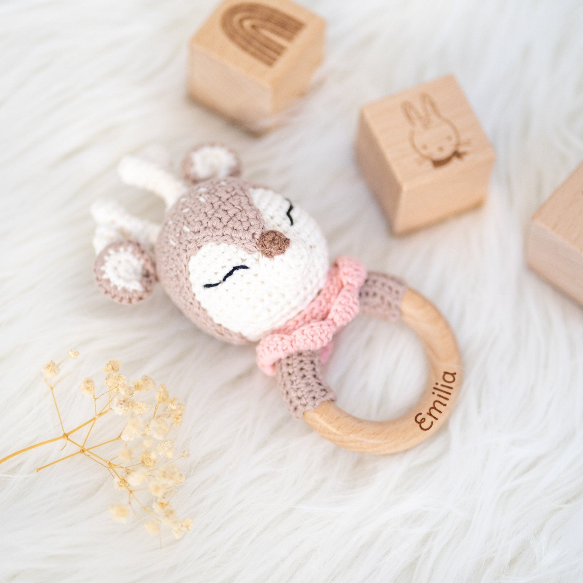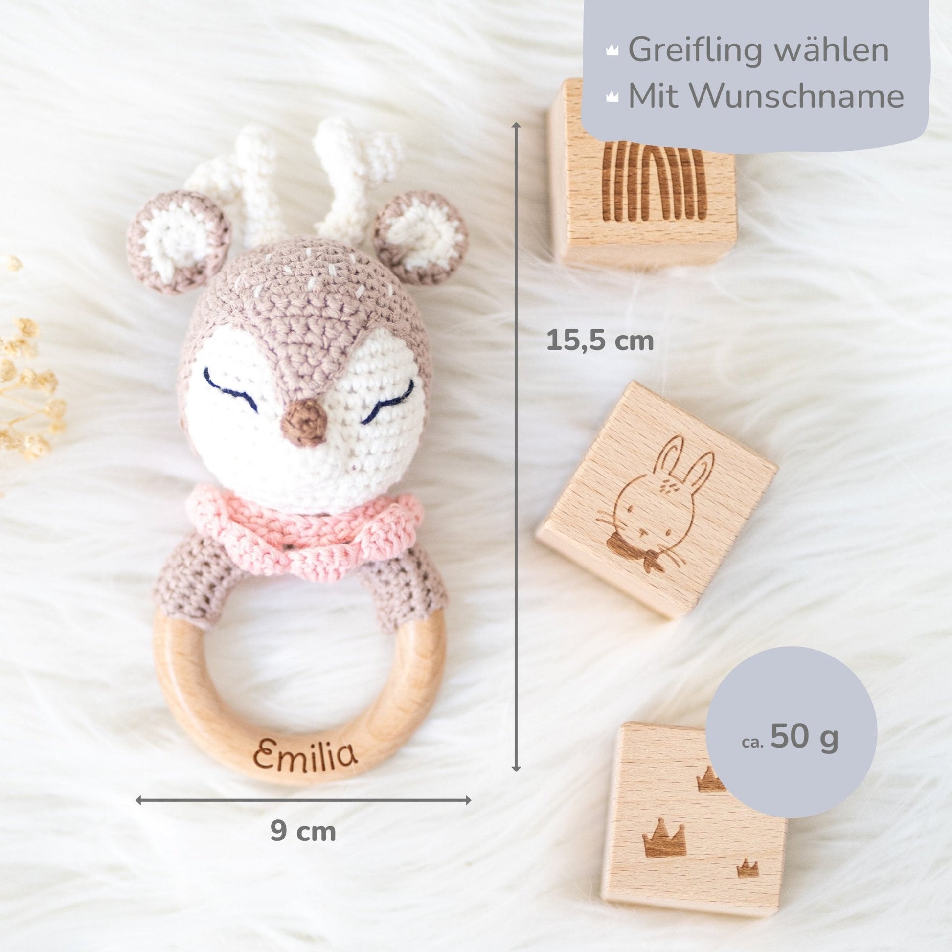 Personalisierter Greifling im Reh-Design mit rosa Schal – Perfekt für kleine Entdecker!