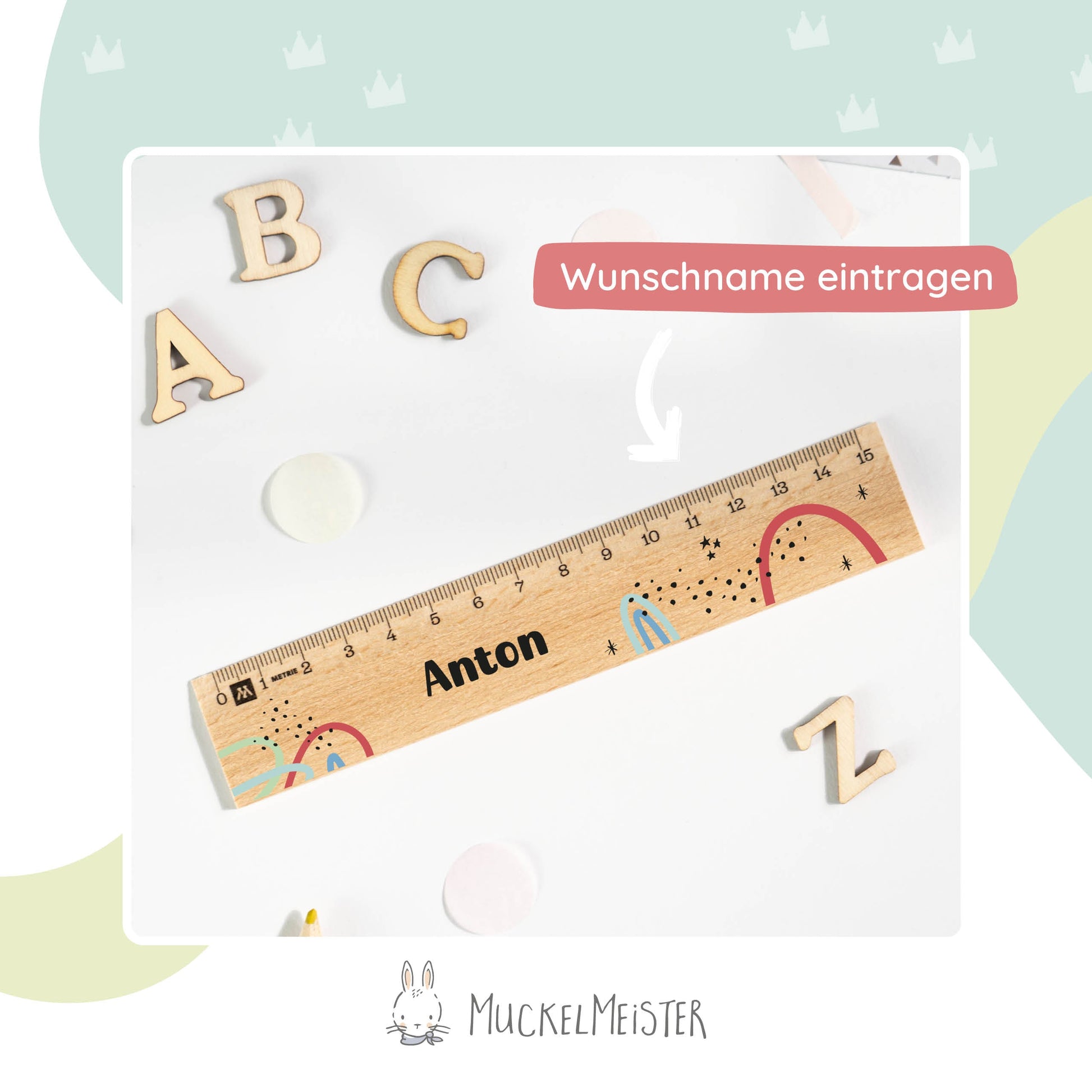 Holzlineal mit Namen zur Einschulung - Motiv Bunt