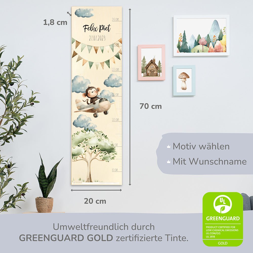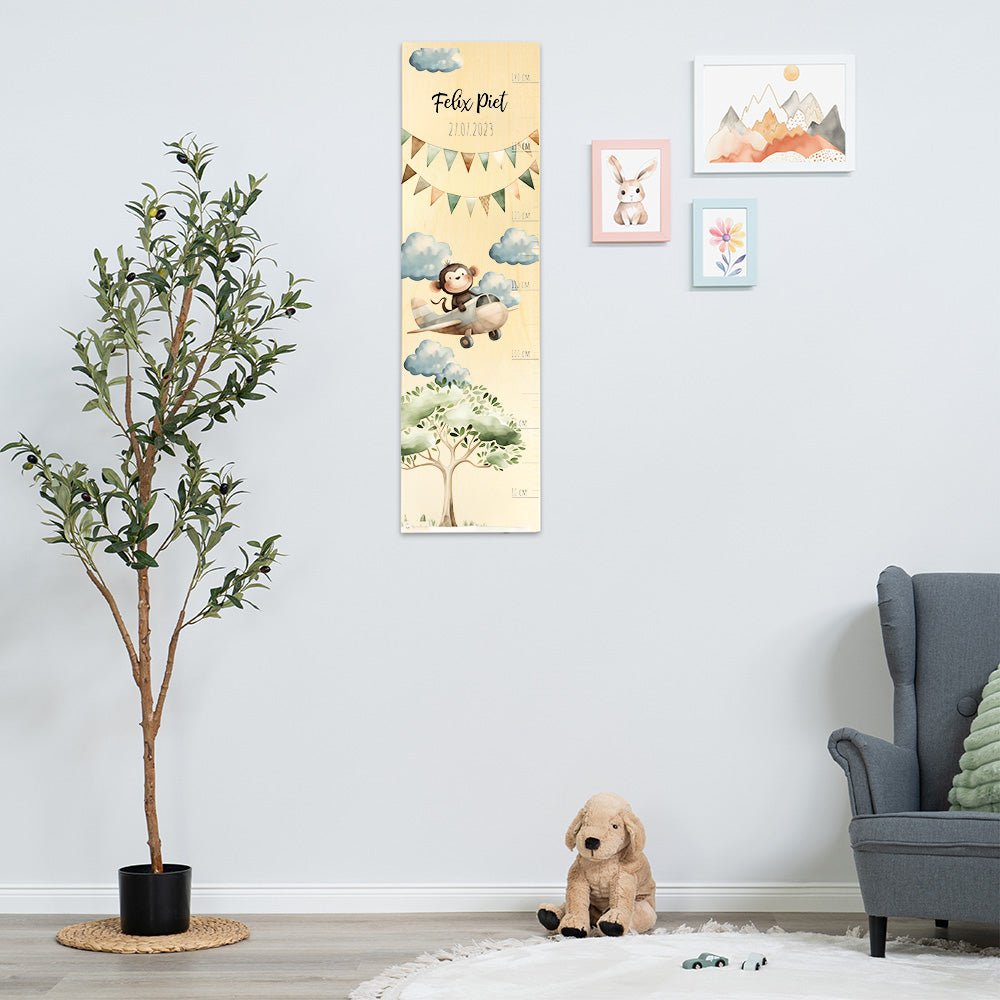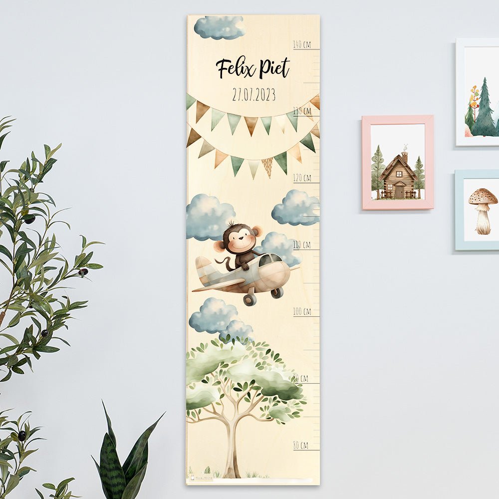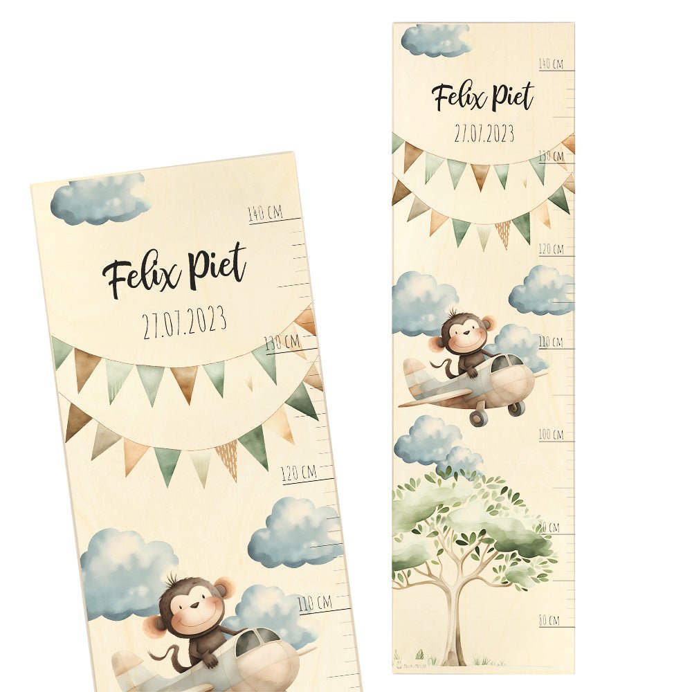 Begib dich auf eine spannende Safari durch die Savanne mit unserer Holz-Messlatte mit einem individuellen Motiv Affe mit Flugzeug! Diese liebevoll gestaltete Messlatte ist nicht nur ein praktisches Werkzeug, um das Wachstum deines kleinen Entdeckers zu verfolgen, sondern auch eine aufregende Dekoration, die jedes Kinderzimmer mit Abenteuerlust und Naturverbundenheit erfüllt.