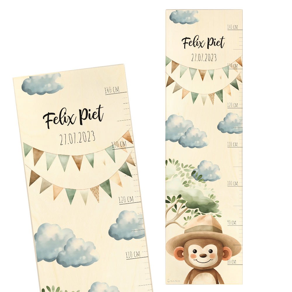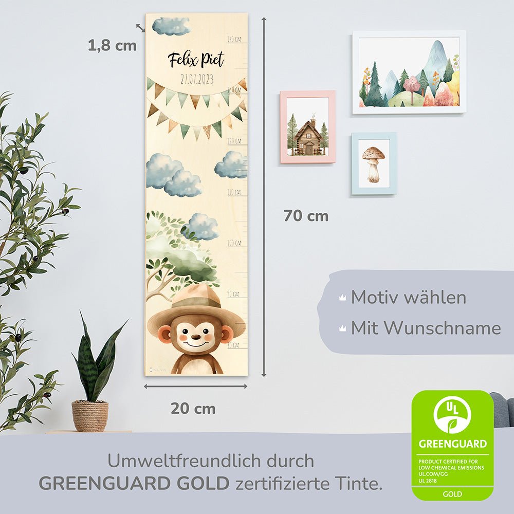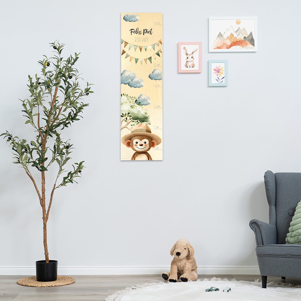 Begib dich auf eine spannende Safari durch die Savanne mit unserer Holz-Messlatte mit einem individuellen Motiv Affe mit Flugzeug! Diese liebevoll gestaltete Messlatte ist nicht nur ein praktisches Werkzeug, um das Wachstum deines kleinen Entdeckers zu verfolgen, sondern auch eine aufregende Dekoration, die jedes Kinderzimmer mit Abenteuerlust und Naturverbundenheit erfüllt.
