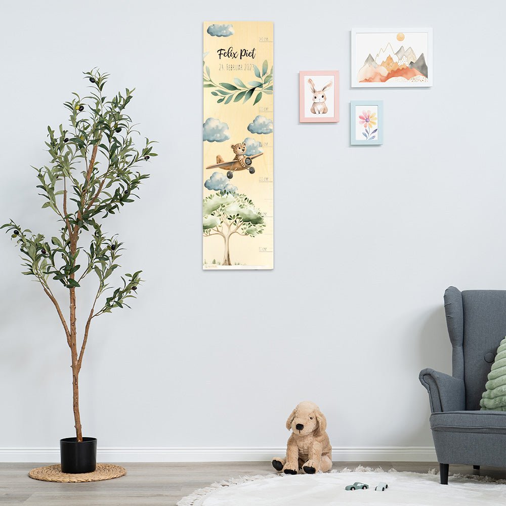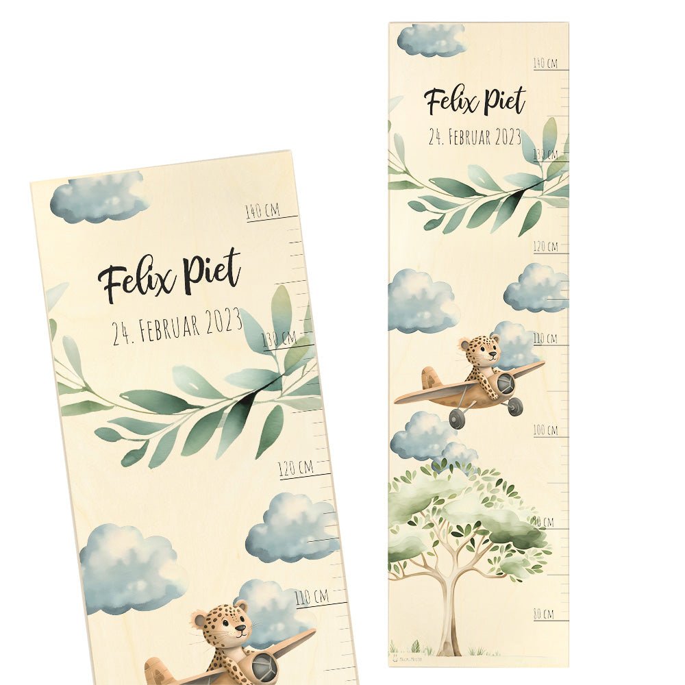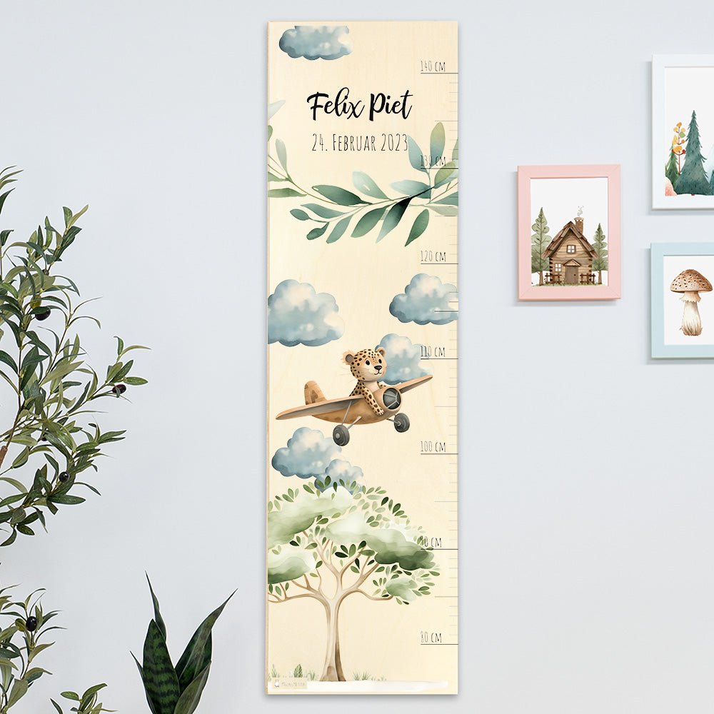 Kinder Messlatte Motiv Leopard im Flugzeug