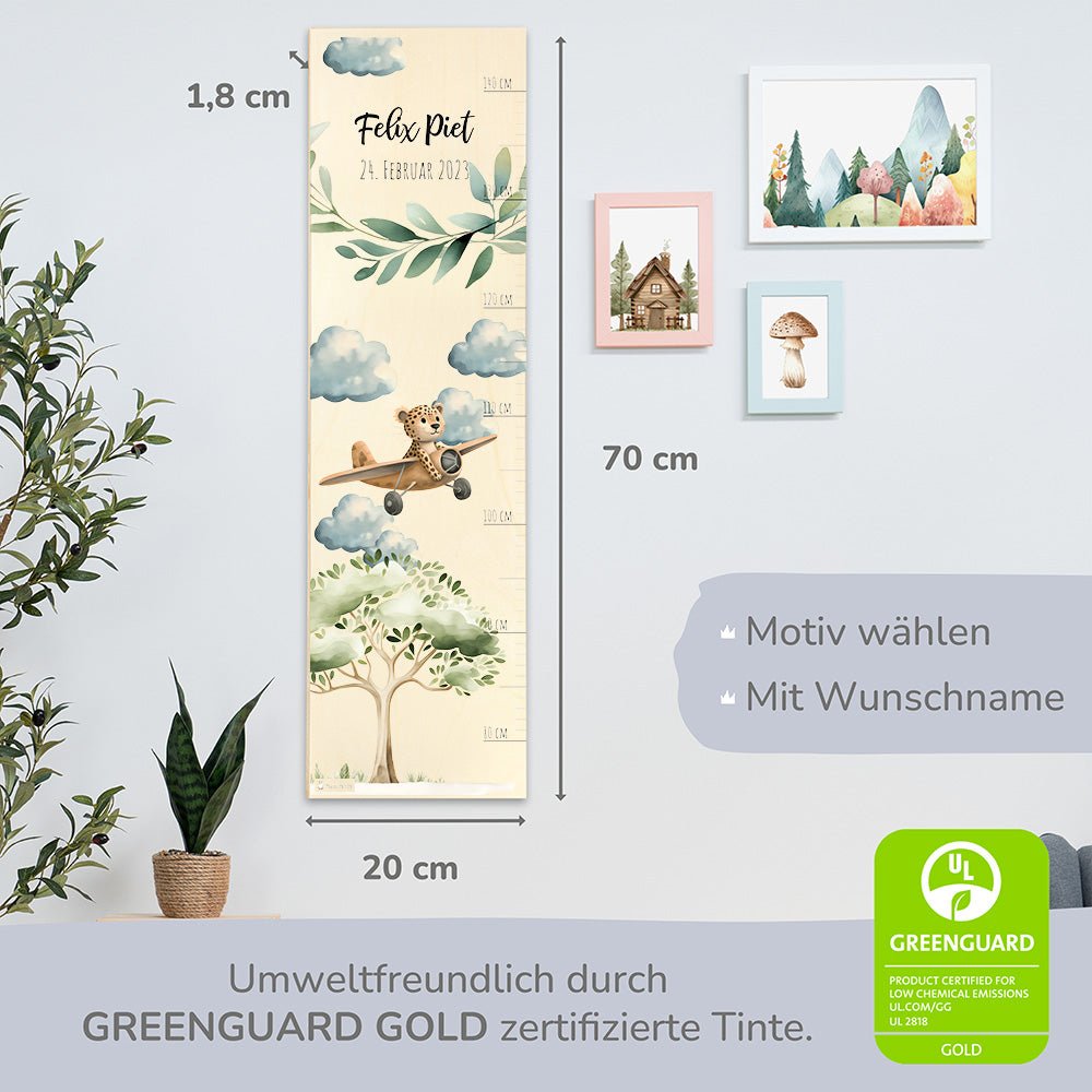 Begib dich auf eine spannende Safari durch die Savanne mit unserer Holz-Messlatte mit einem individuellen Motiv Affe mit Flugzeug! Diese liebevoll gestaltete Messlatte ist nicht nur ein praktisches Werkzeug, um das Wachstum deines kleinen Entdeckers zu verfolgen, sondern auch eine aufregende Dekoration, die jedes Kinderzimmer mit Abenteuerlust und Naturverbundenheit erfüllt.