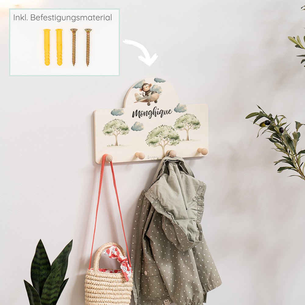 Affen im Flugzeug-Motiv: Das fröhliche Motiv zeigt einen niedlichen Affen im Flugzeug, das die Fantasie und Abenteuerlust deines Kindes anregt. Das liebevolle Design macht die Garderobe zu einem echten Hingucker im Kinderzimmer.