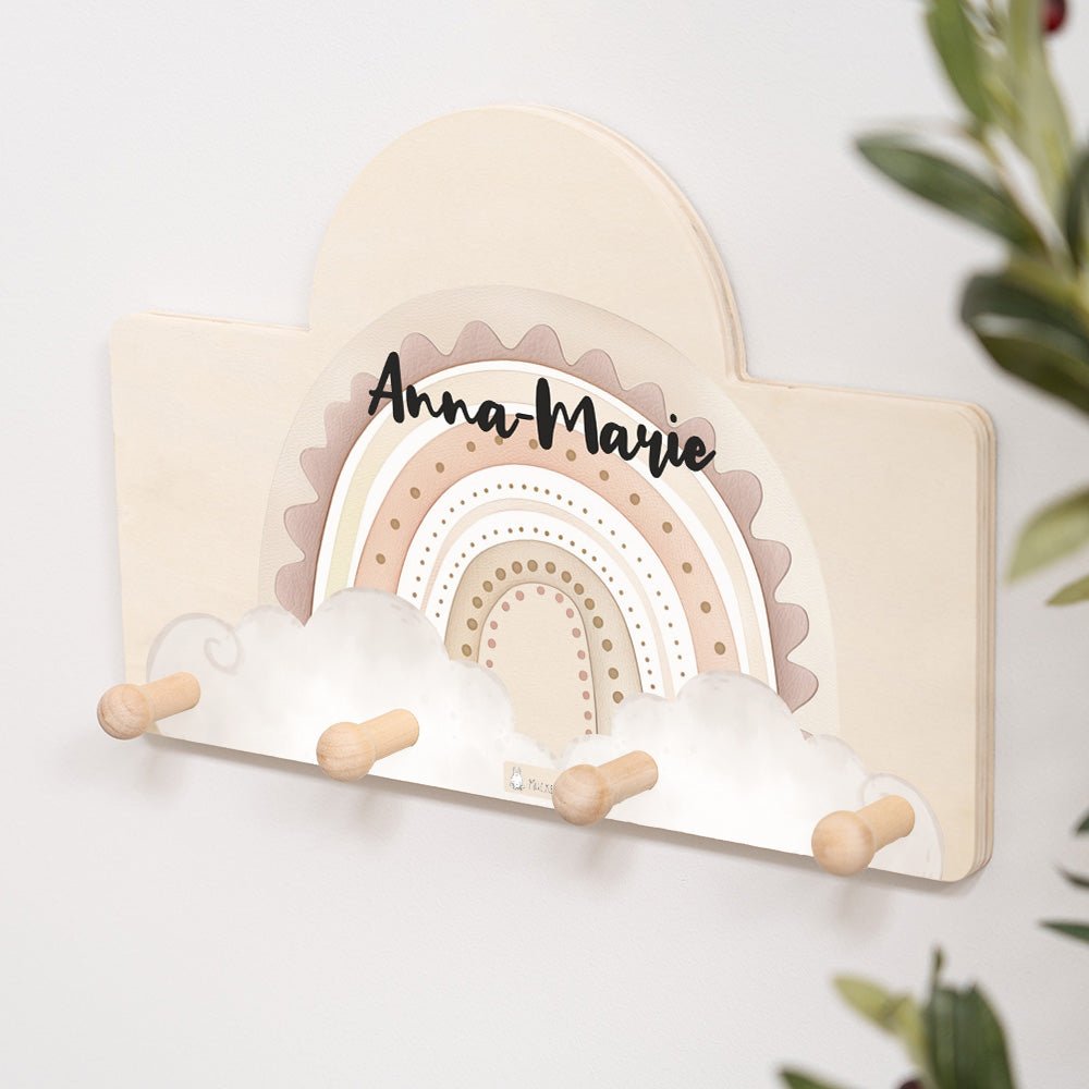 Suchst du nach einer stilvollen und funktionalen Aufbewahrungslösung für die Kleidung deines Kindes? Unsere personalisierte Kindergarderobe aus Holz mit einem bezaubernden rosa Regenbogen-Motiv ist die perfekte Wahl! Diese liebevoll gestaltete Garderobe bietet nicht nur Platz für Jacken, Rucksäcke und Accessoires, sondern bringt auch eine fröhliche und einladende Atmosphäre in das Kinderzimmer.