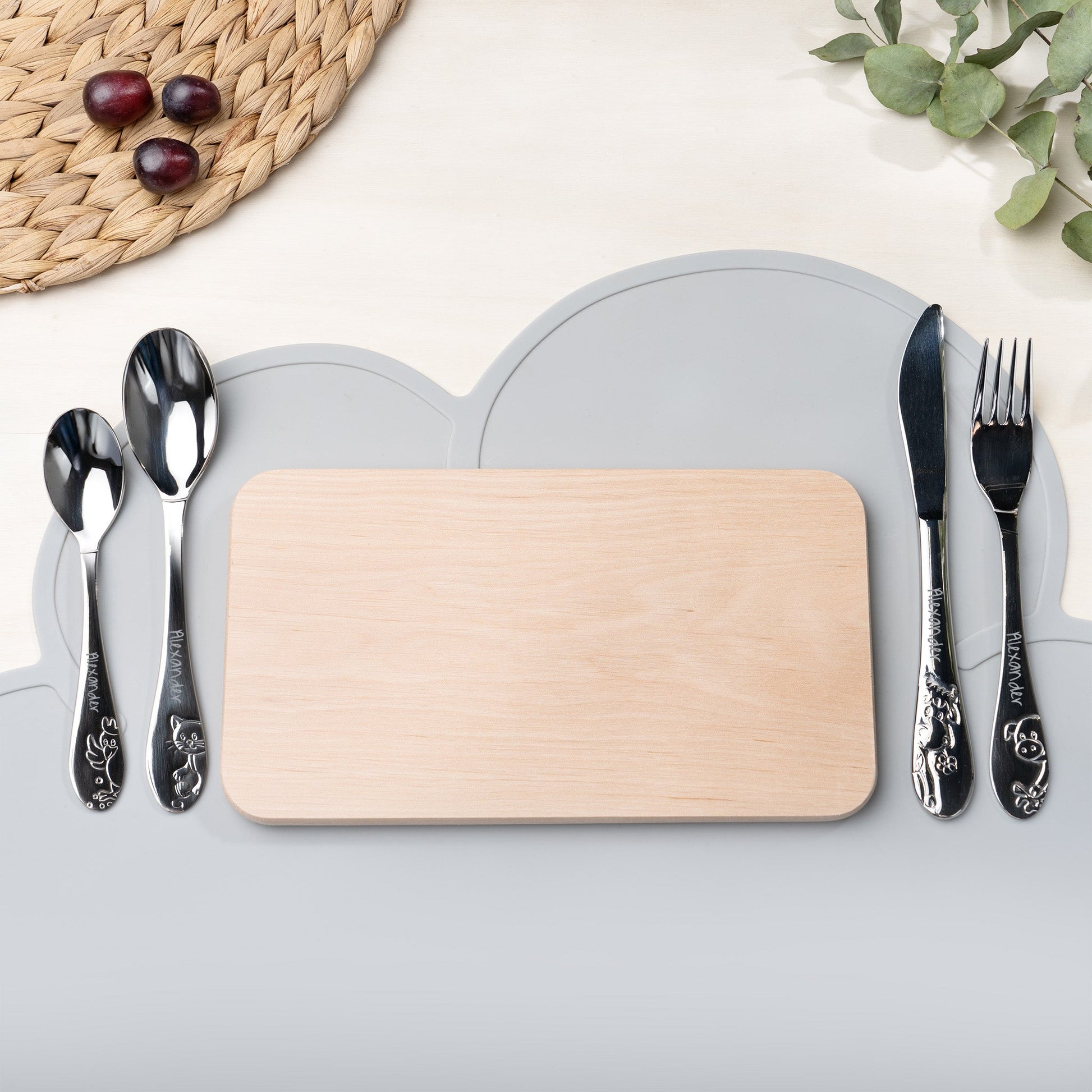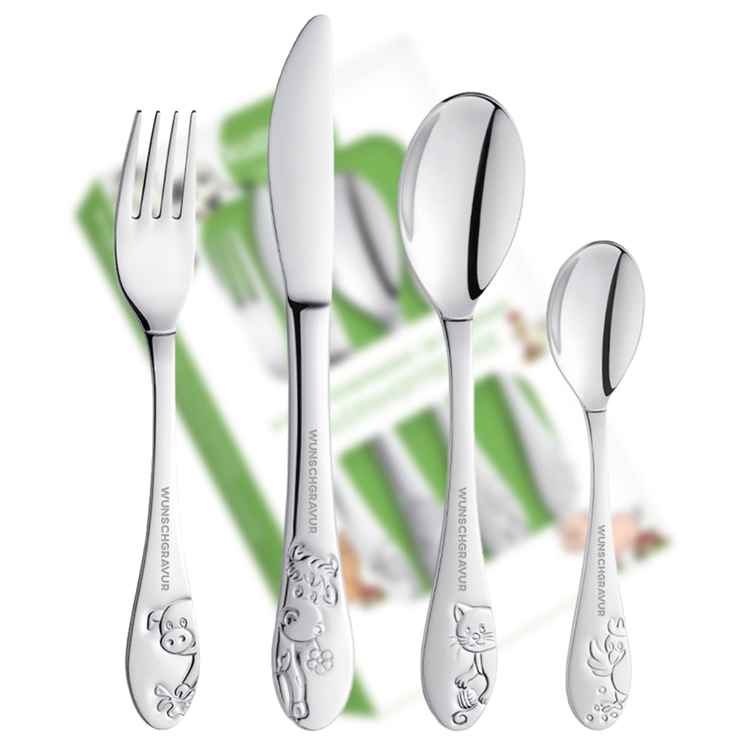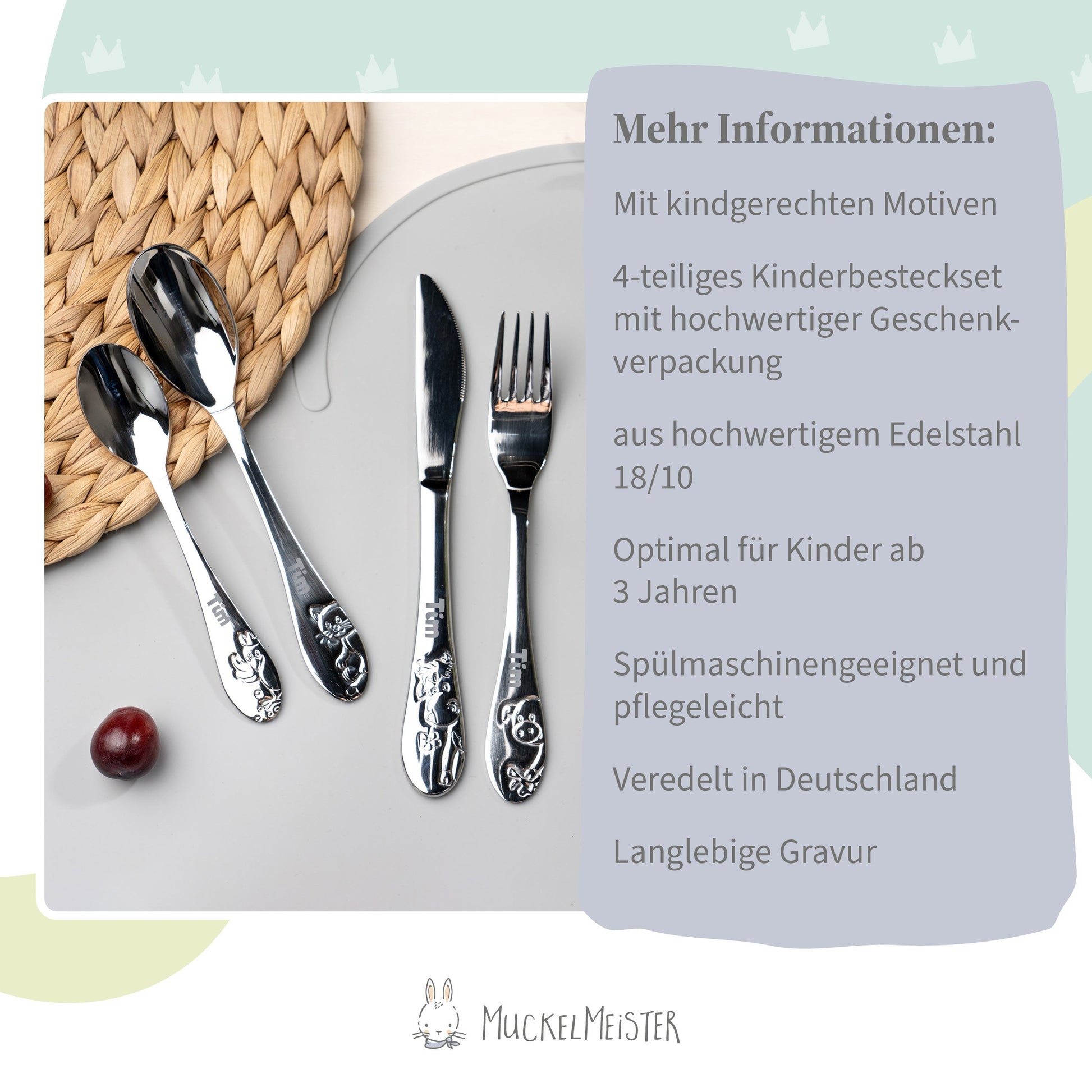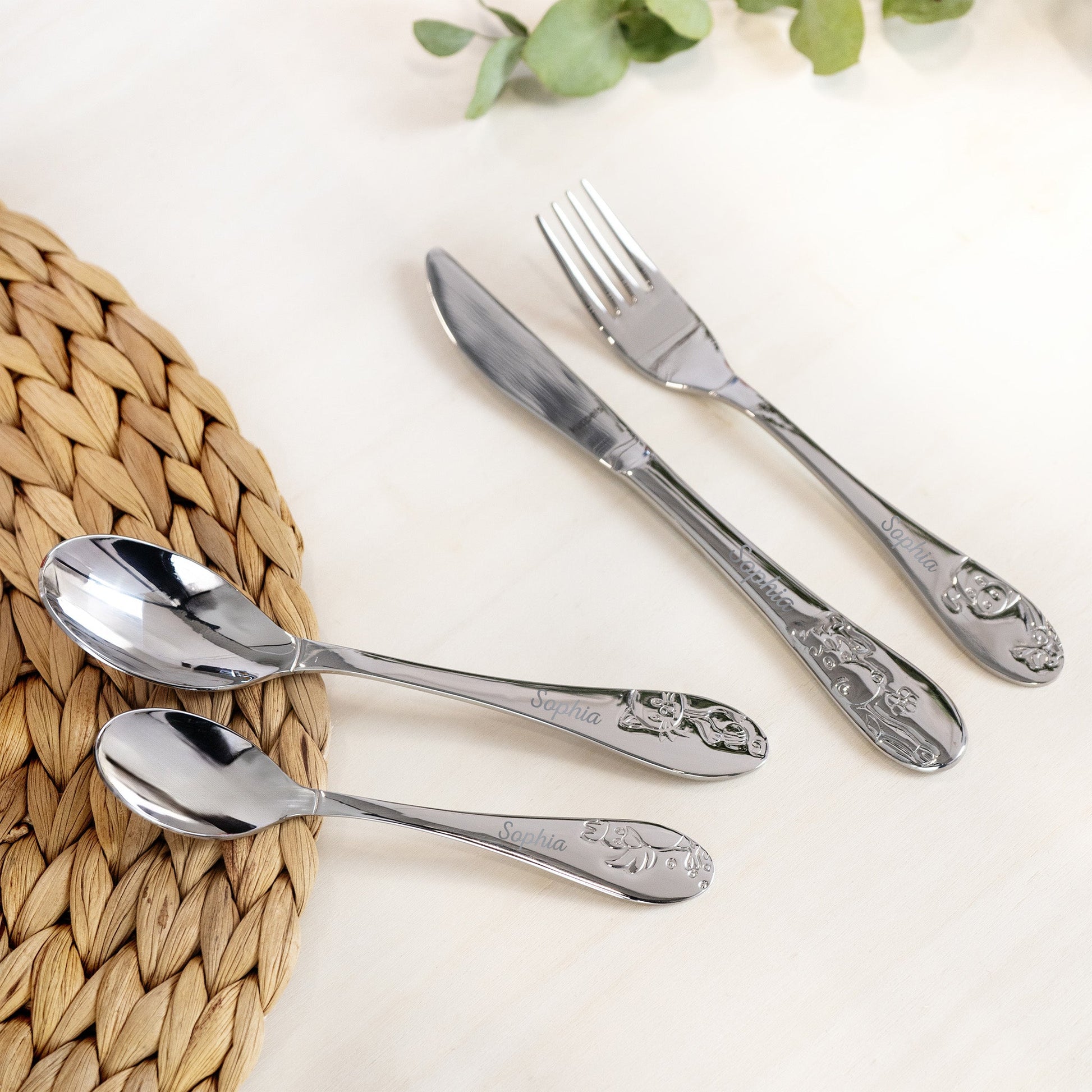 Individuelle Namensgravur: Jedes Besteckteil wird mit dem Namen des Kindes graviert, um ihm eine persönliche Note zu verleihen, um das Set zu einem einzigartigen Geschenk zu machen.