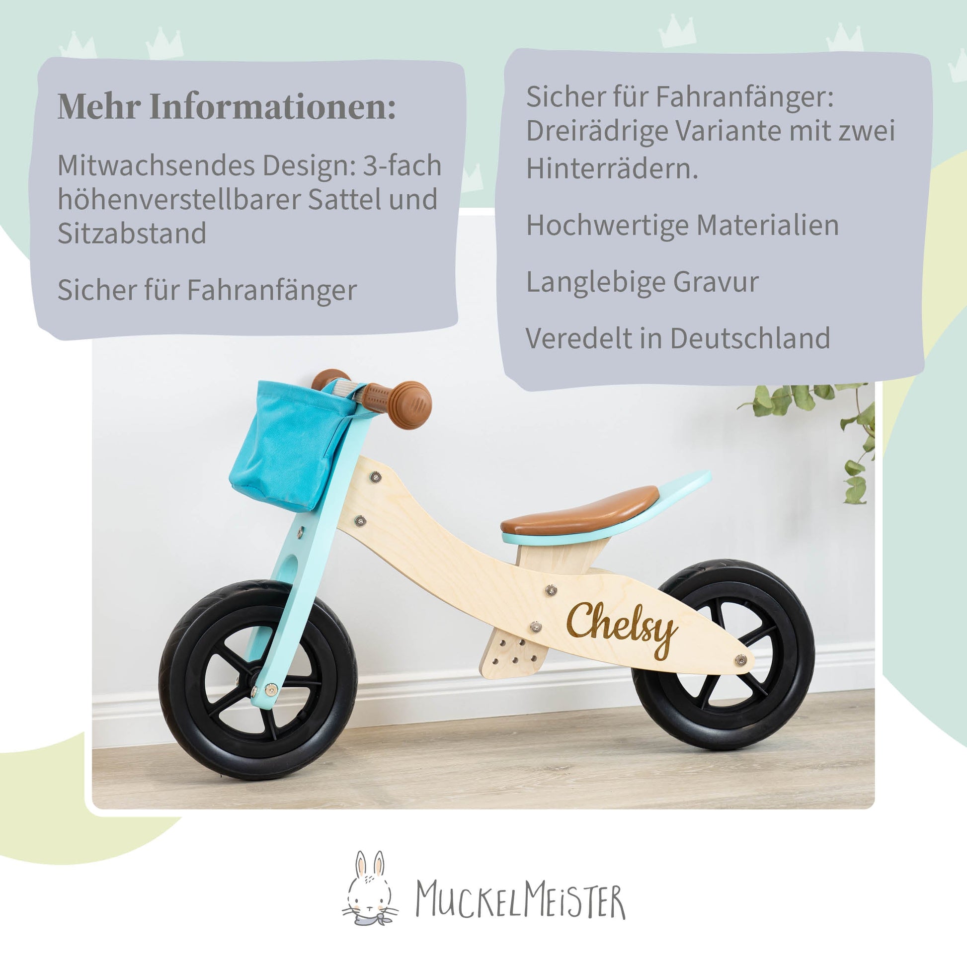 Windschnittige und Sichere Laufhilfe aus Holz mit höhenverstellbaren Sattel und stufenweise verstellbarem Sitzabstand. Für kleine Flitzer schult unser Laufrad Balance und Gleichgewichtssinn des Kindes. Besonders sicher vor Quetschungen durch Einschlagbegrenzung an den Griffen.
