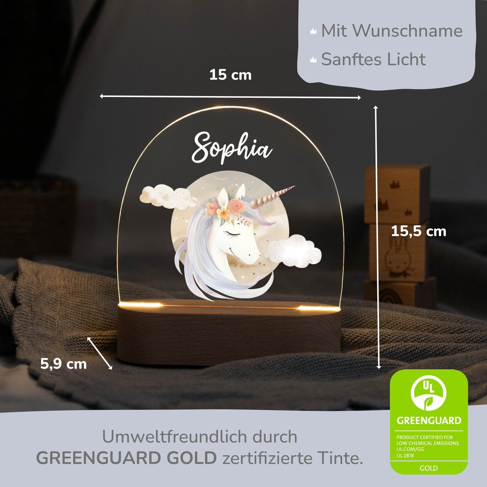 Das Besondere? Der Name Deines Kindes wird per hochwertigem UV-Druck auf das Acrylglas aufgebracht – mit umweltfreundlicher GREENGUARD GOLD-zertifizierter Tinte. So bleibt der Druck nicht nur langlebig und farbenfroh, sondern auch sicher für das Kinderzimmer.