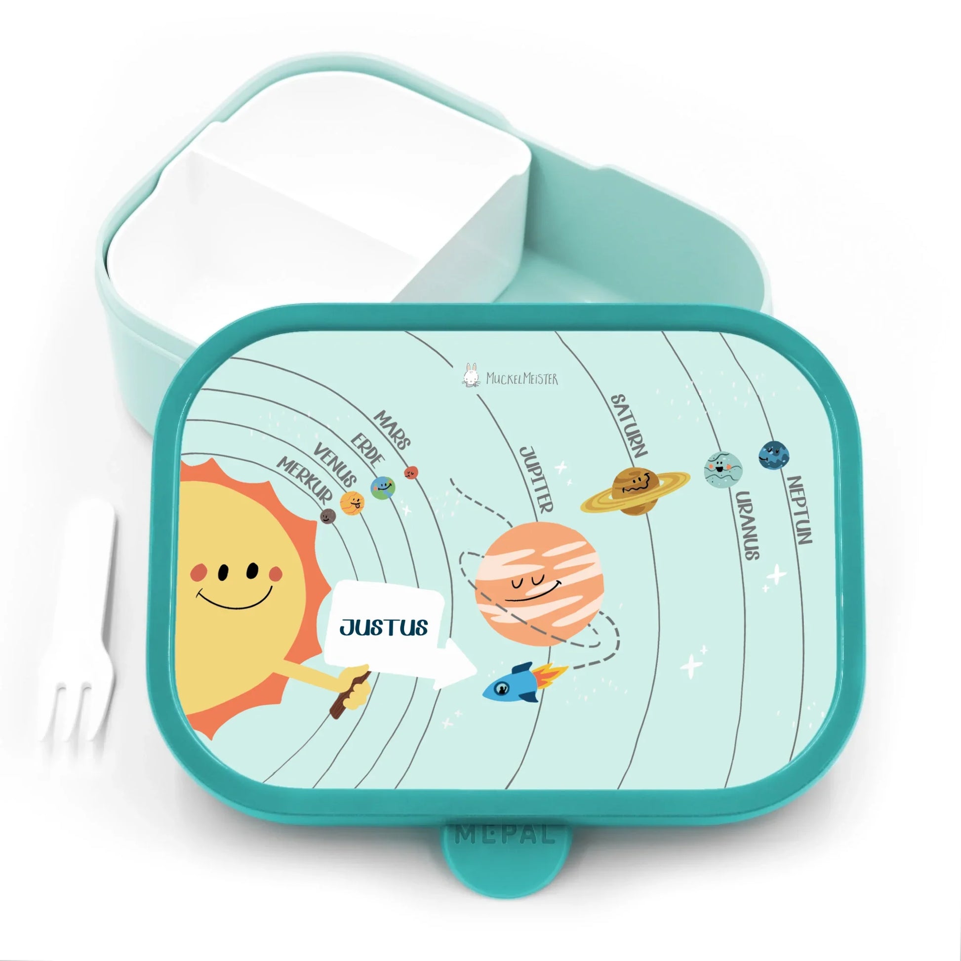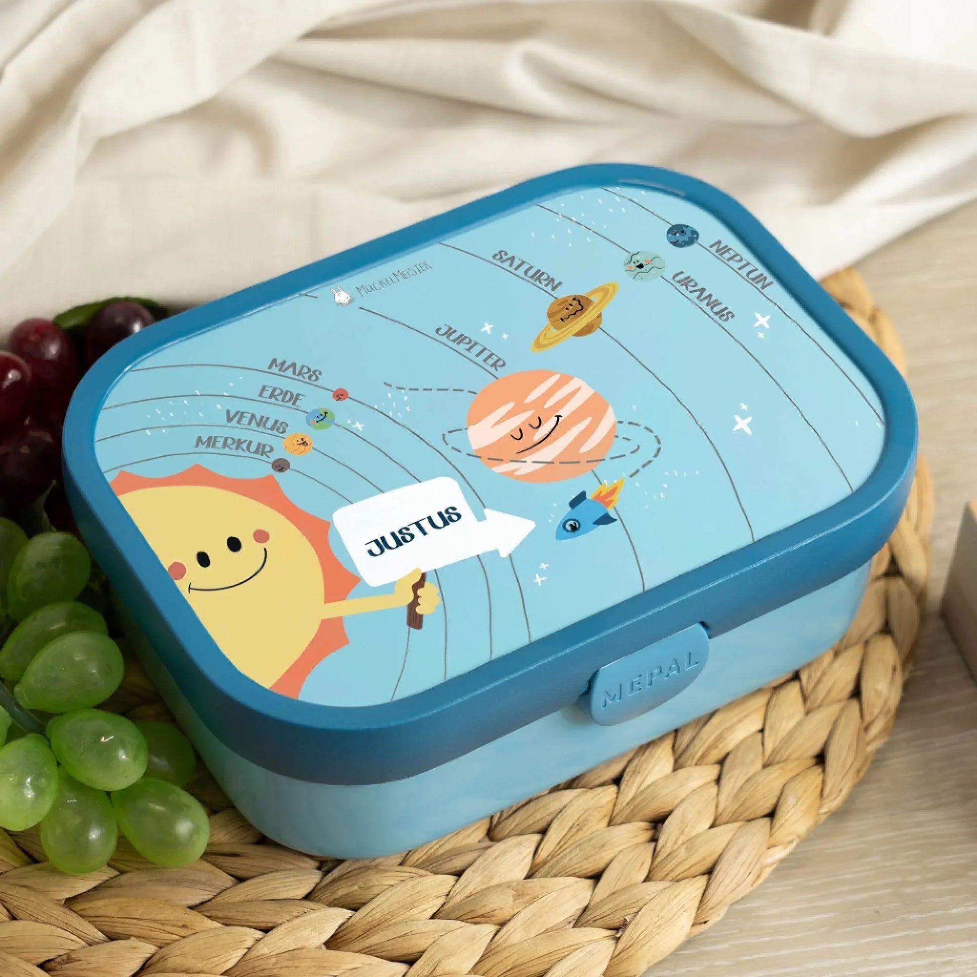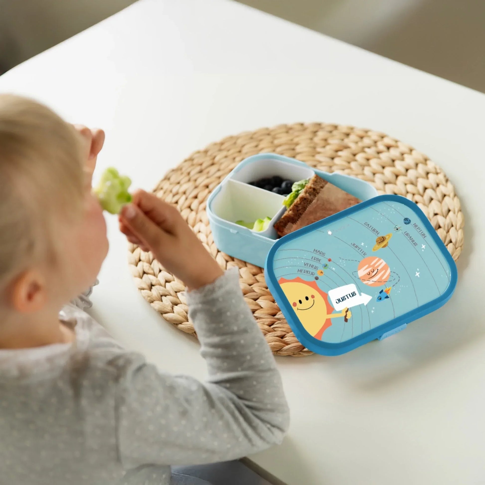 Was macht eine Brotdose für Kinder zu etwas ganz Besonderem? Es ist die Kombination aus Funktionalität, liebevollem und kindgerechten Design und einer ganz persönlichen Note. All diese Punkte bringt unsere Campus Lunchbox im Planetensystem Design mit.