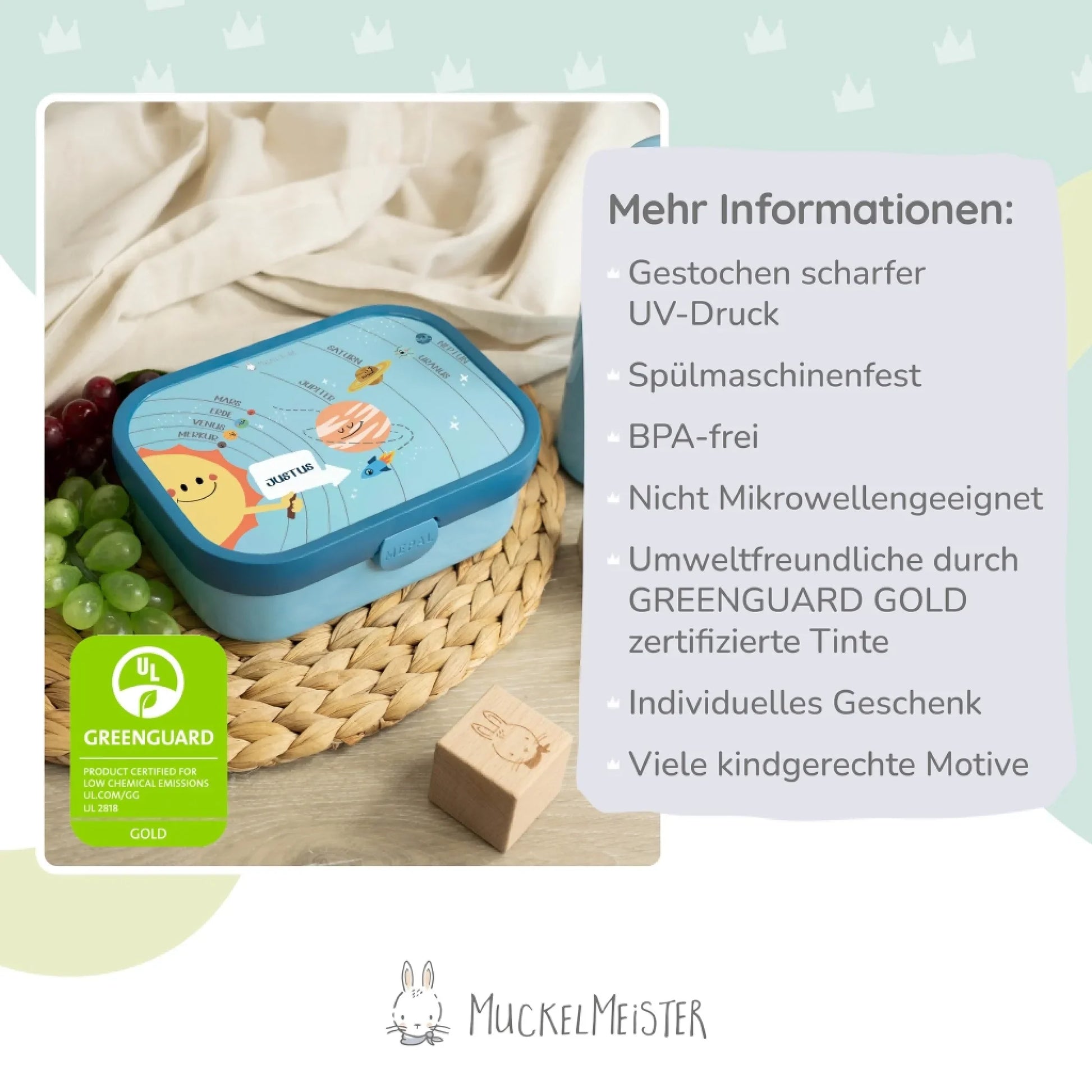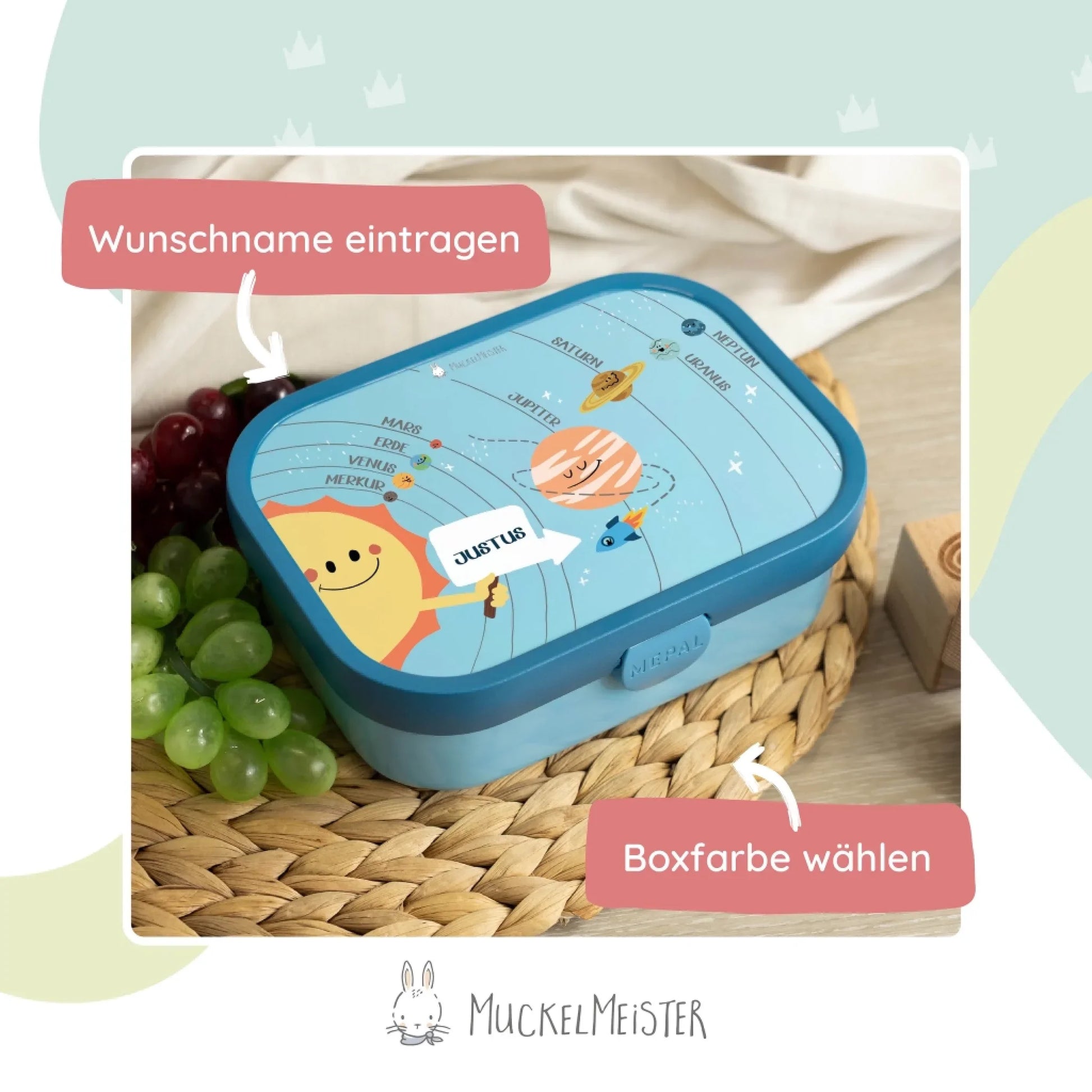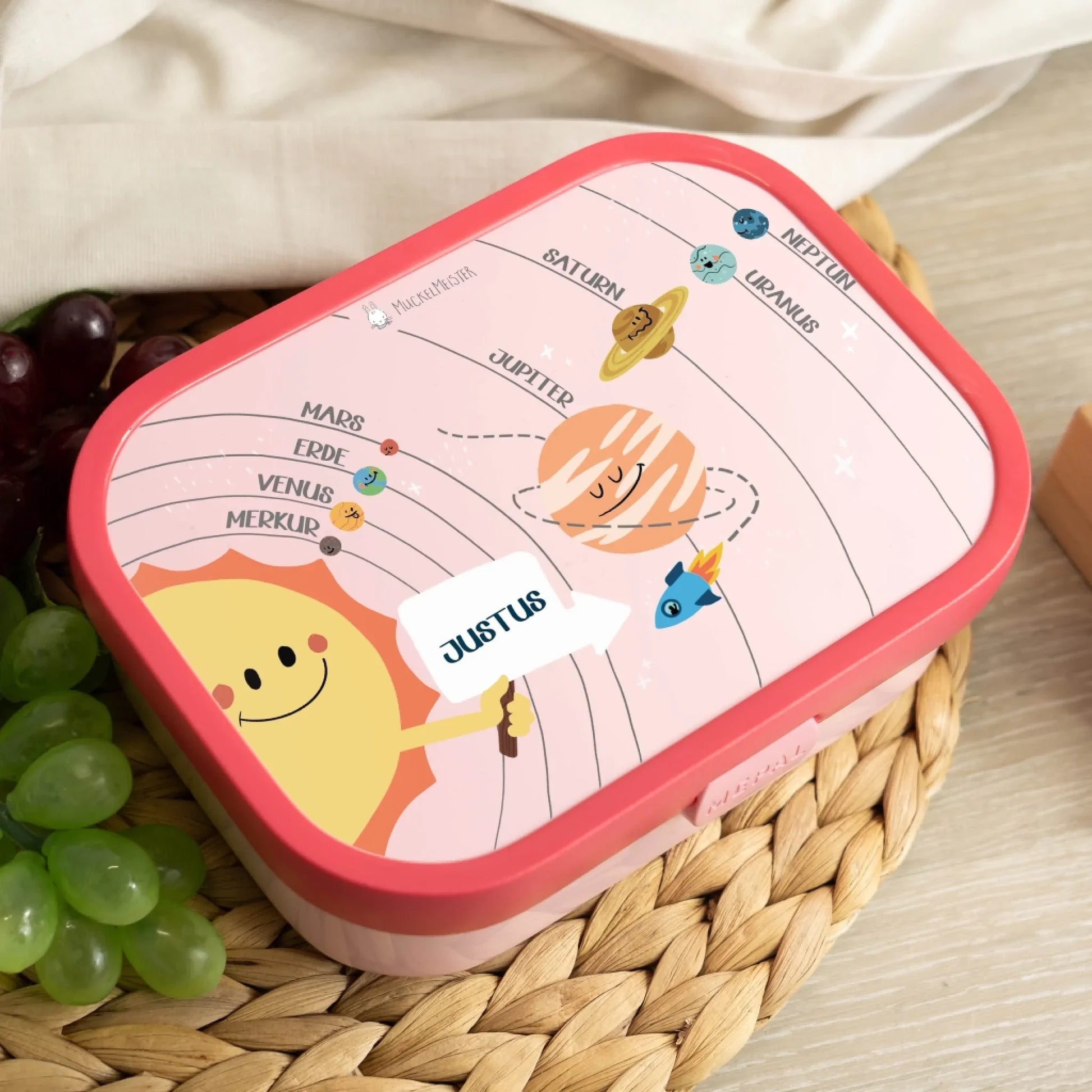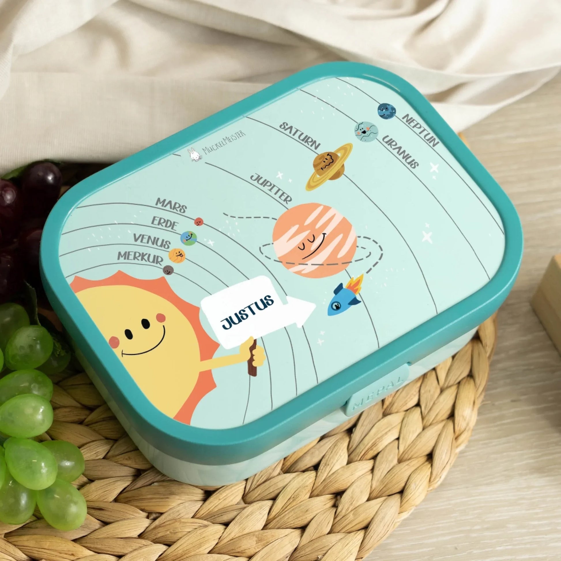 Was macht eine Brotdose für Kinder zu etwas ganz Besonderem? Es ist die Kombination aus Funktionalität, liebevollem und kindgerechten Design und einer ganz persönlichen Note. All diese Punkte bringt unsere Campus Lunchbox im Planetensystem Design mit.