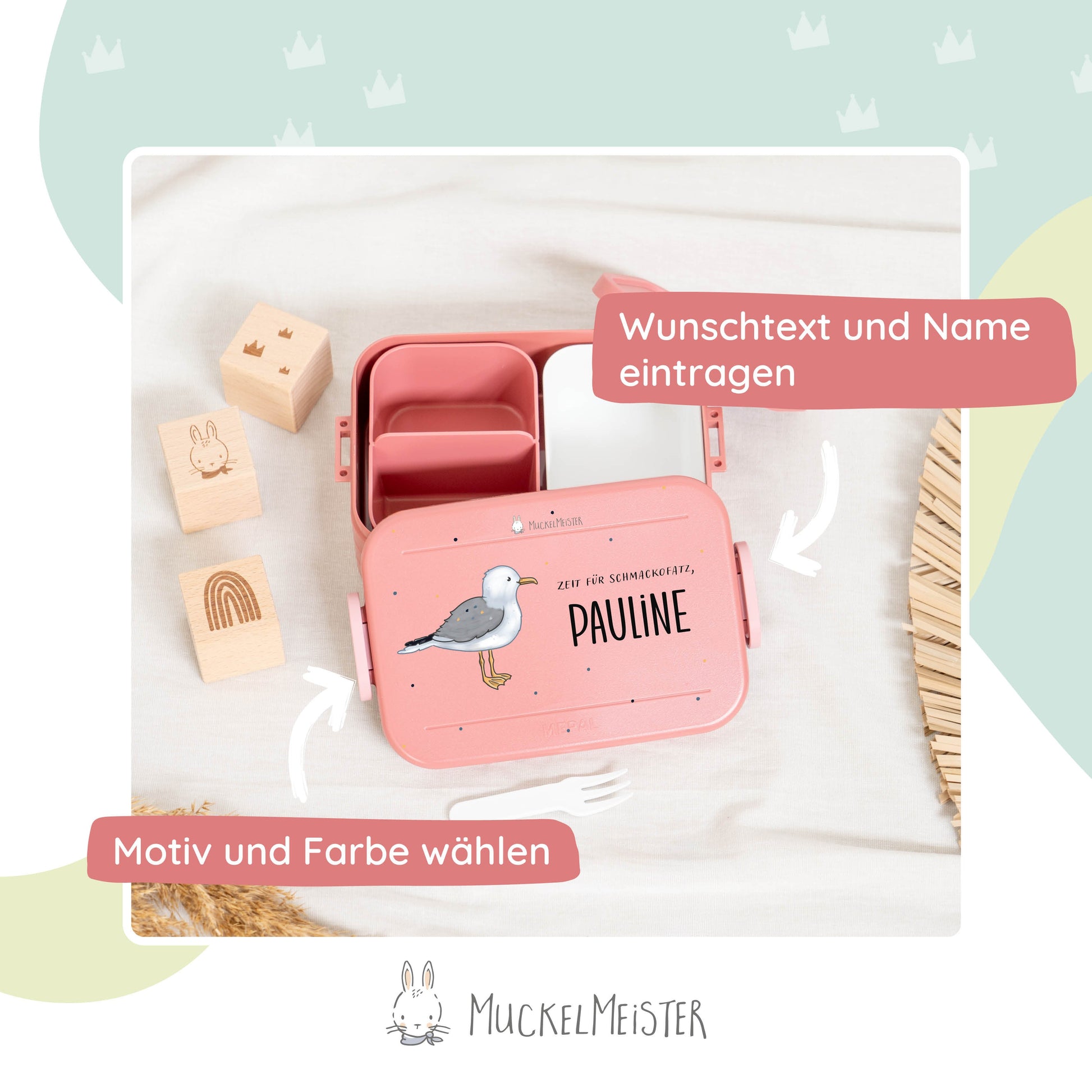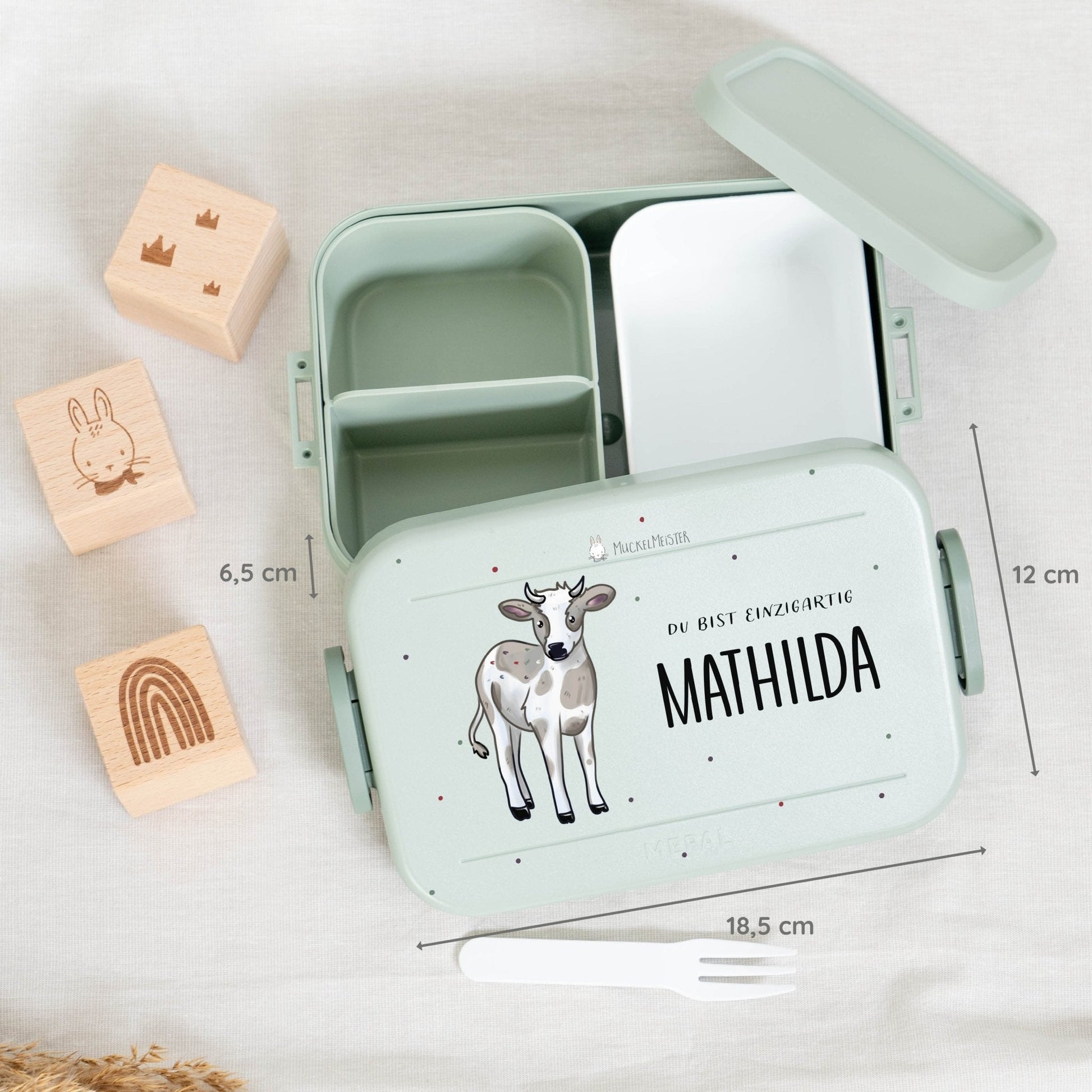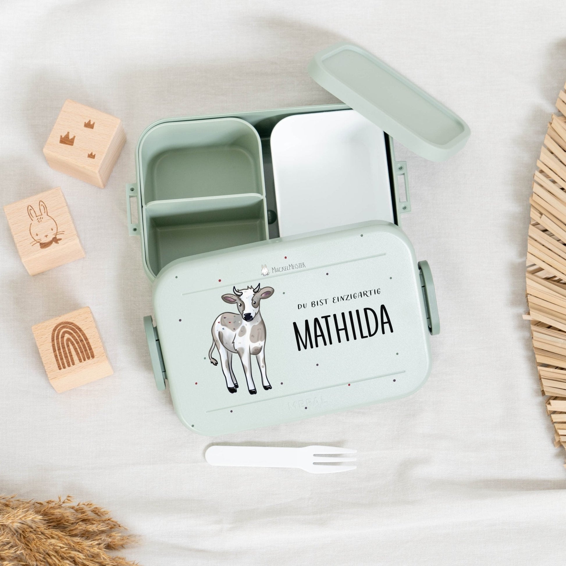 Mache die Brotdose einzigartig, indem du den Namen deines Kindes und eines von 16 niedlichen Muckelfreunde-Tieren auswählst. Diese persönliche Note verhindert Verwechslungen und macht die Brotdose zu einem besonderen Highlight.